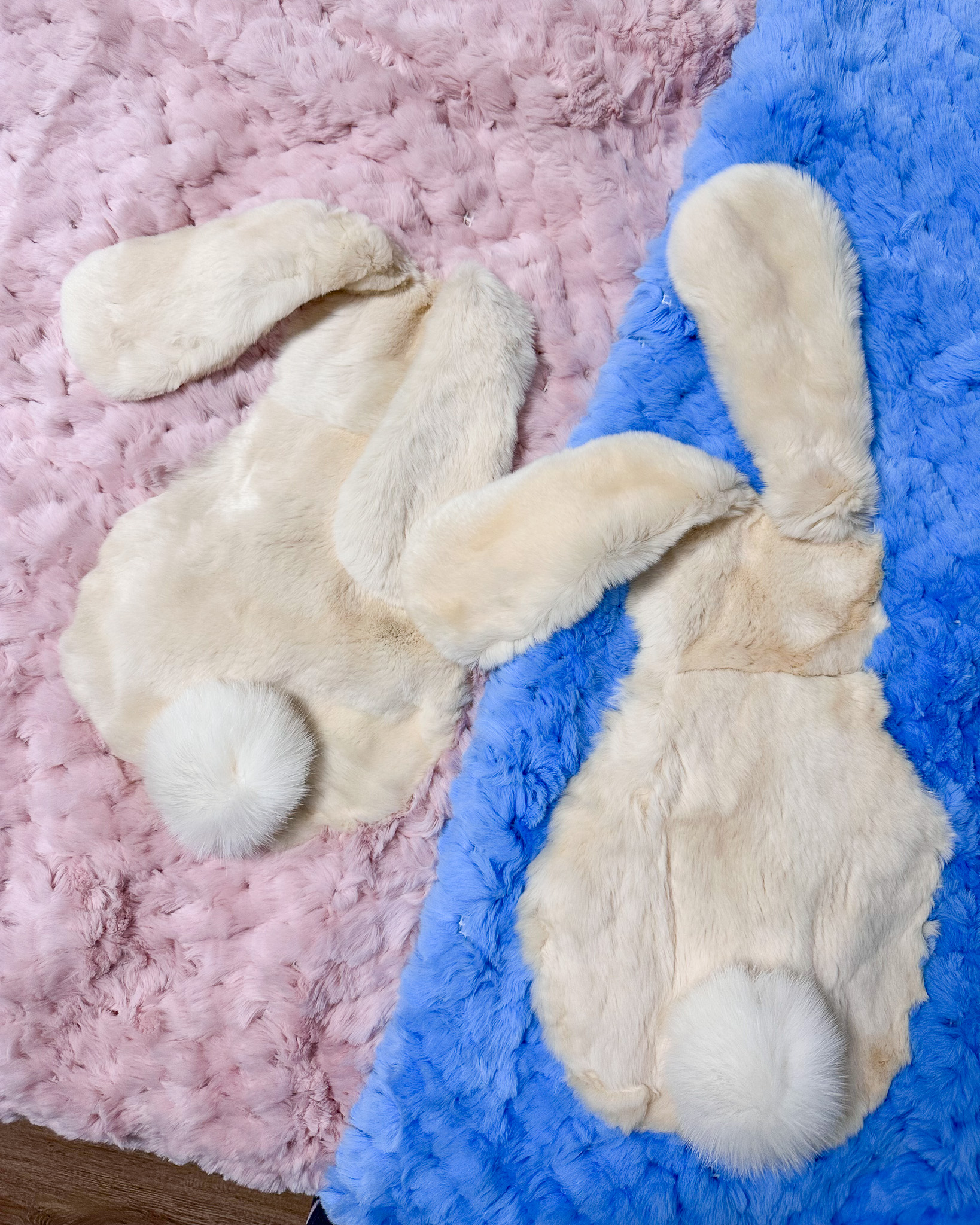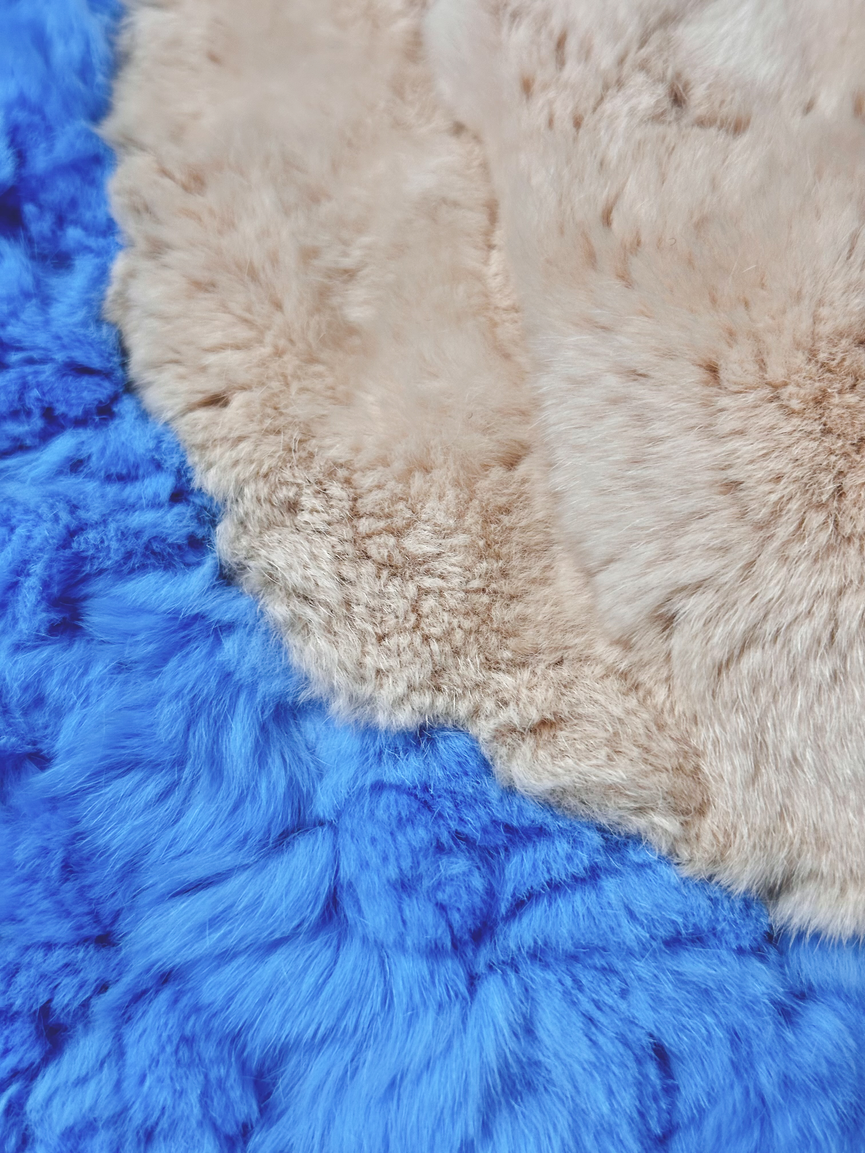 Полотно пледа сделано из нежнейшего "вязаного" меха кролик рекс голубого цвета и украшено пришивной аппликацией из цельного меха рекс в форме короны. Основа из "вязаного" меха делает плед пышным, воздушным и более легким по весу, а также позволяет наслаждаться нежнейшим мехом с обеих сторон!