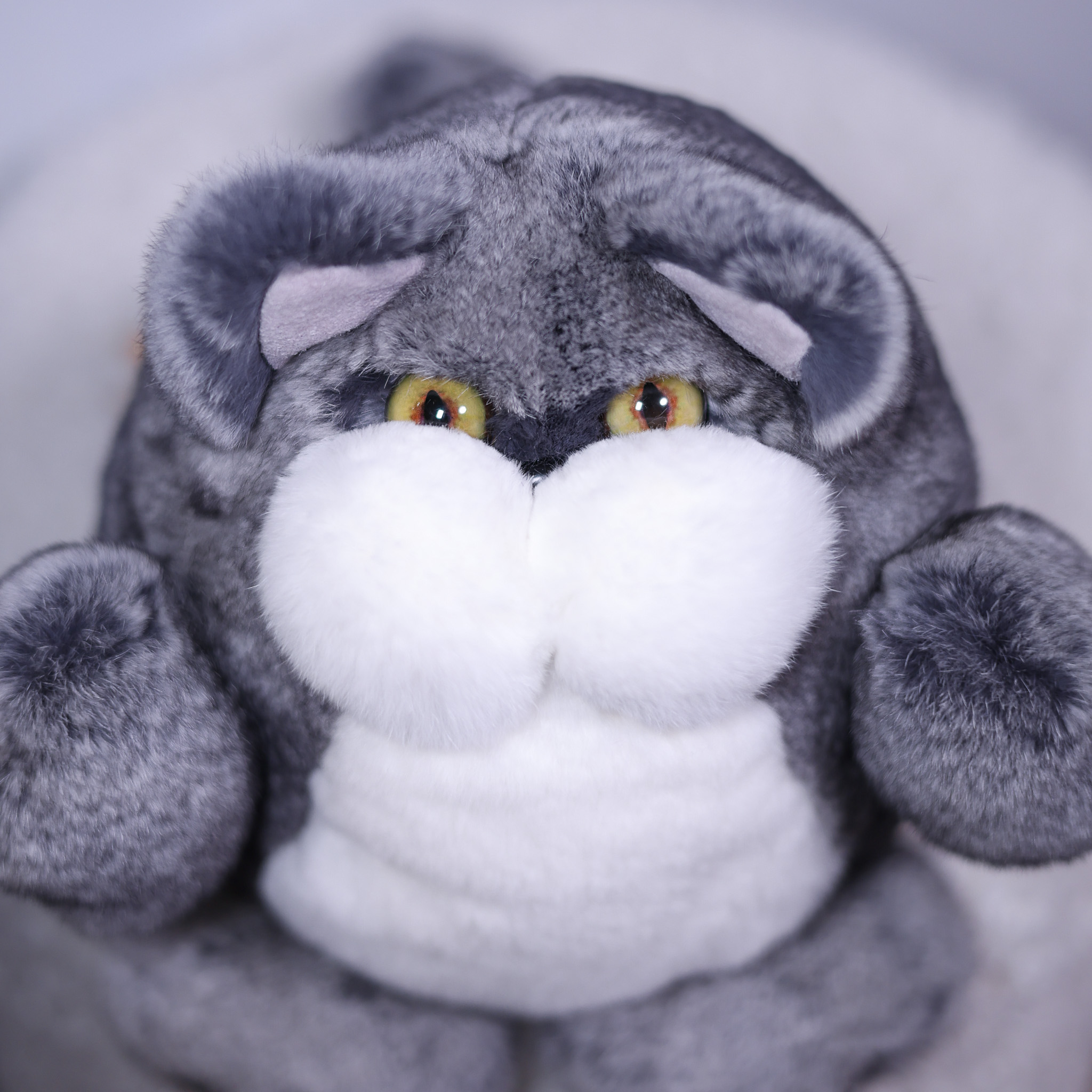 Кот Марсель сделан из натурального меха кролик рекс нежнейшего серого цвета "шиншилла" (сложный трехслойный окрас меха), щечки и пузико из белого рекса. Ушки кота оформлены с использованием замшевых вставок.