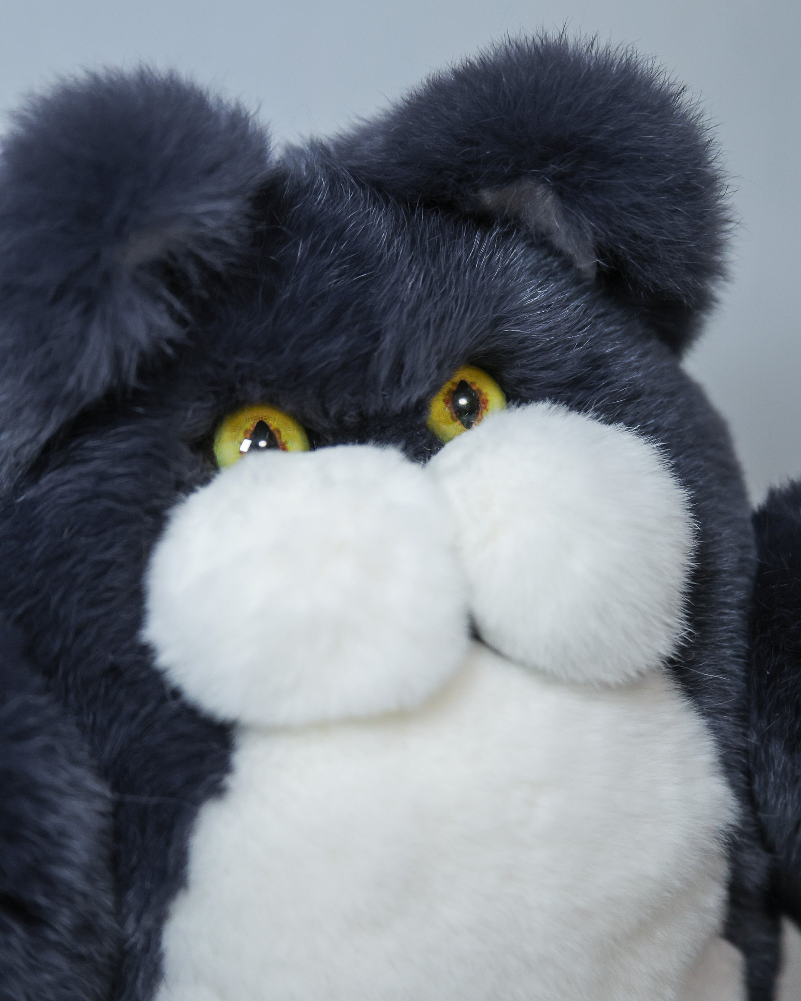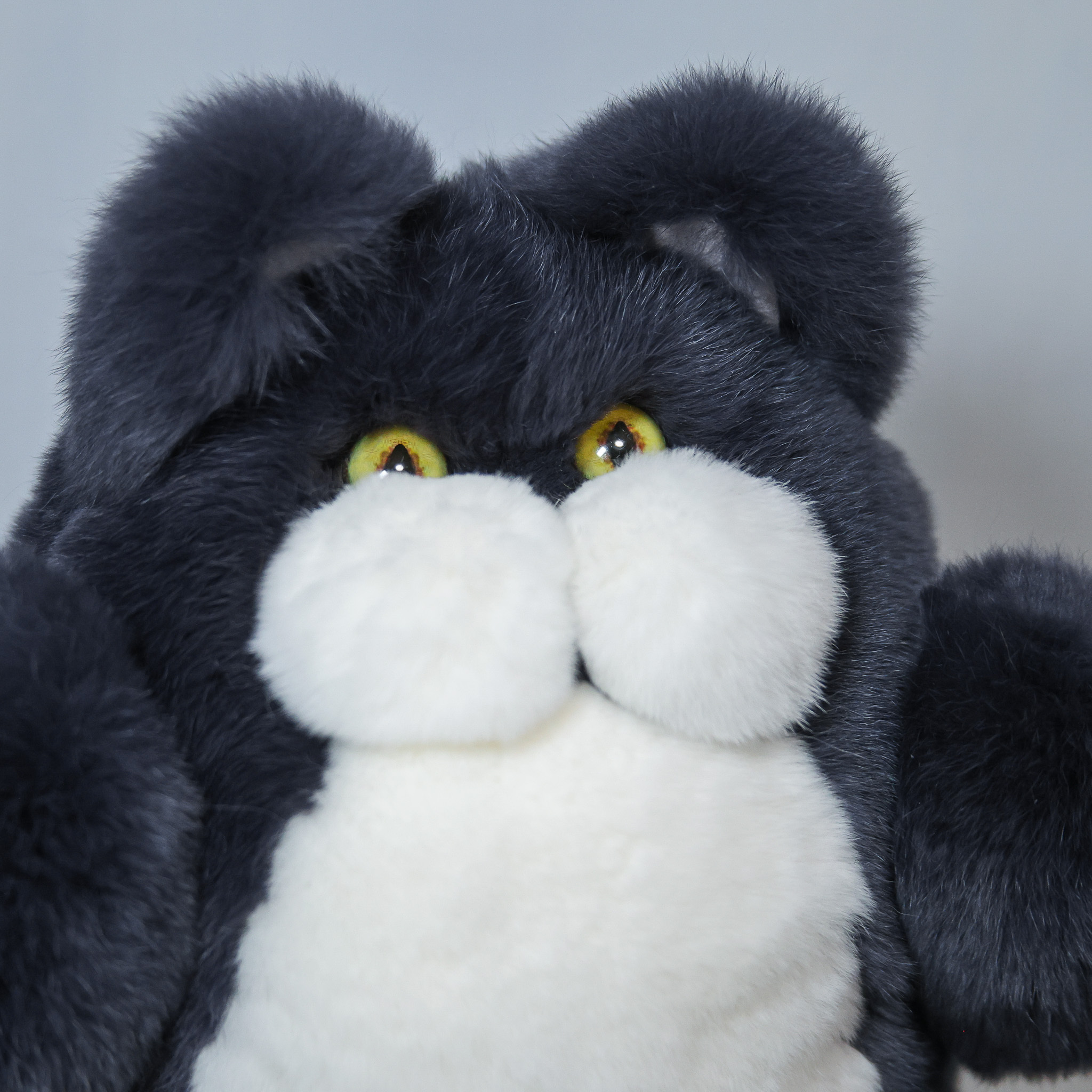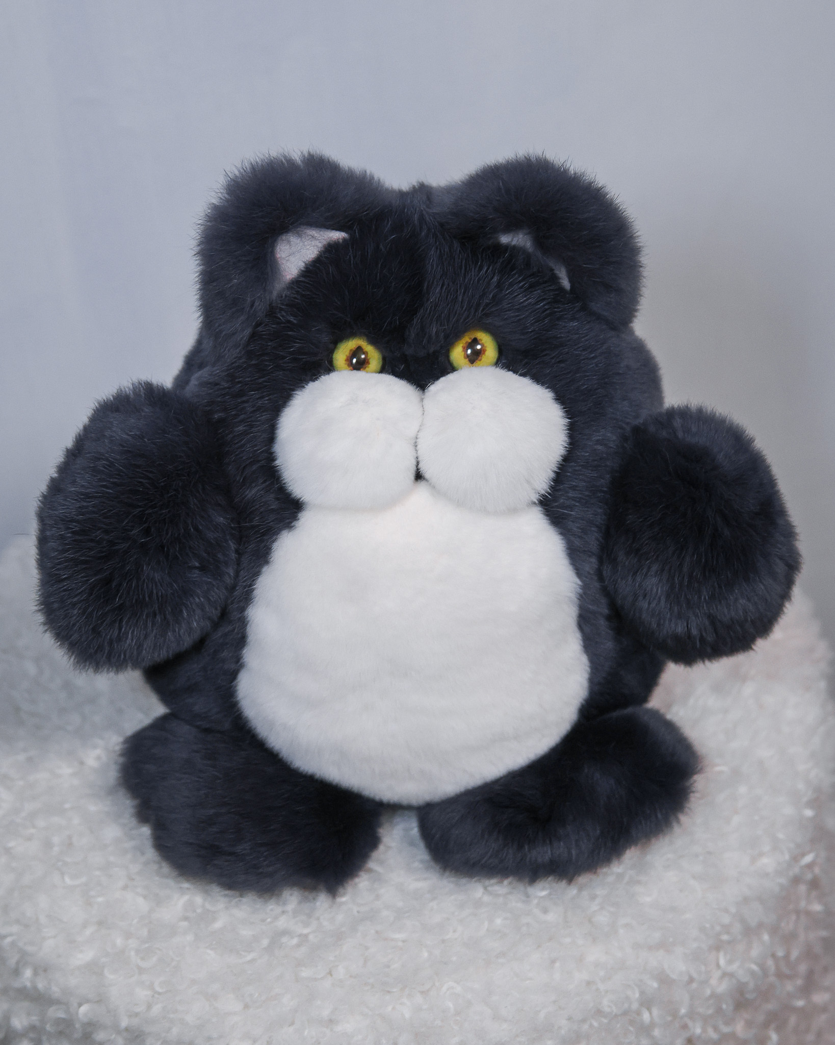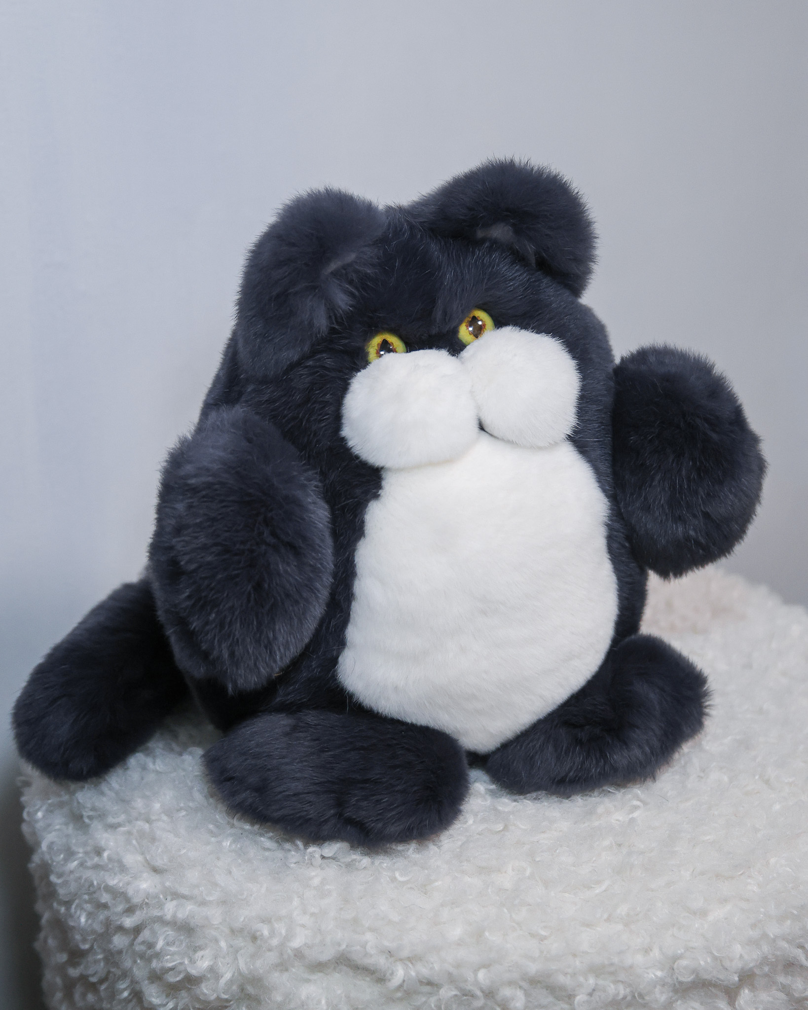 Кот Марсель сделан из натурального меха кролик рекс цвета темный графит, щечки и пузико из белого рекса. Ушки котика оформлены с использованием замшевых вставок.