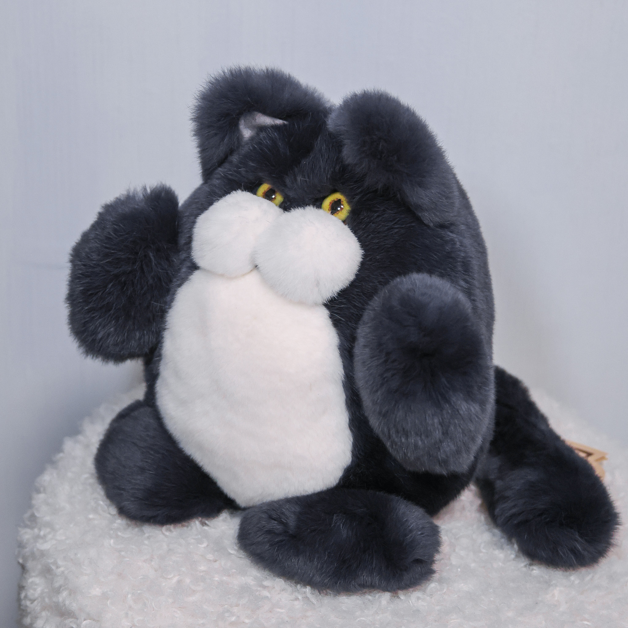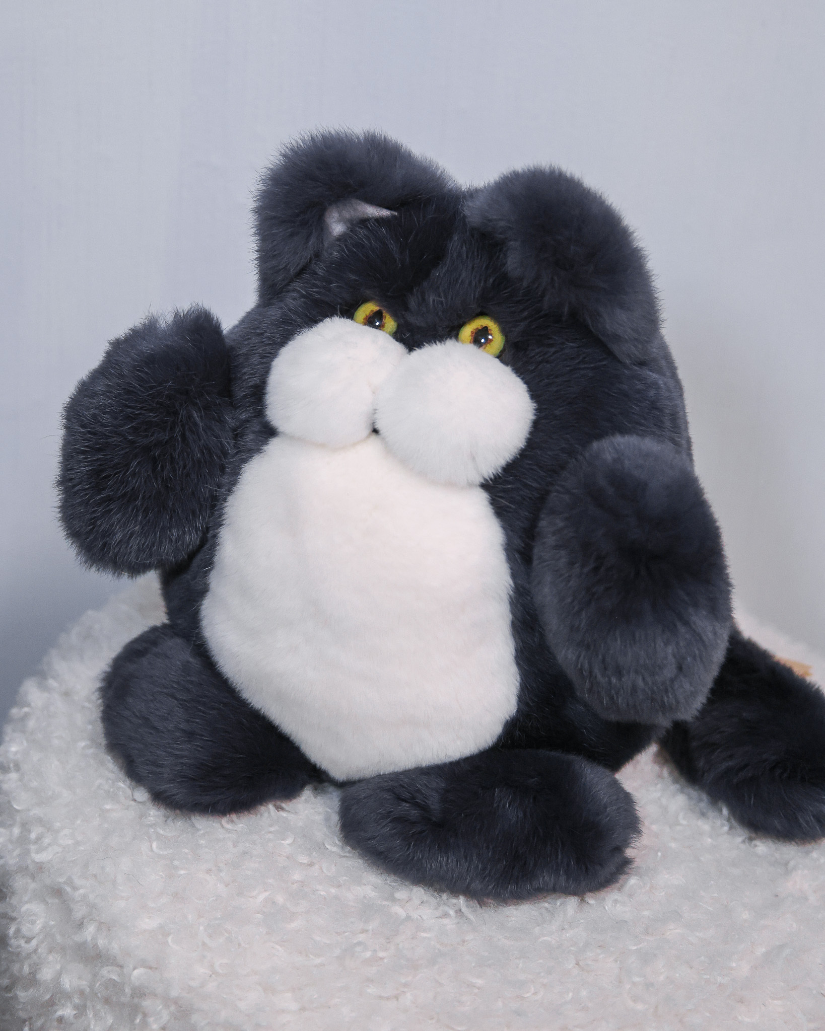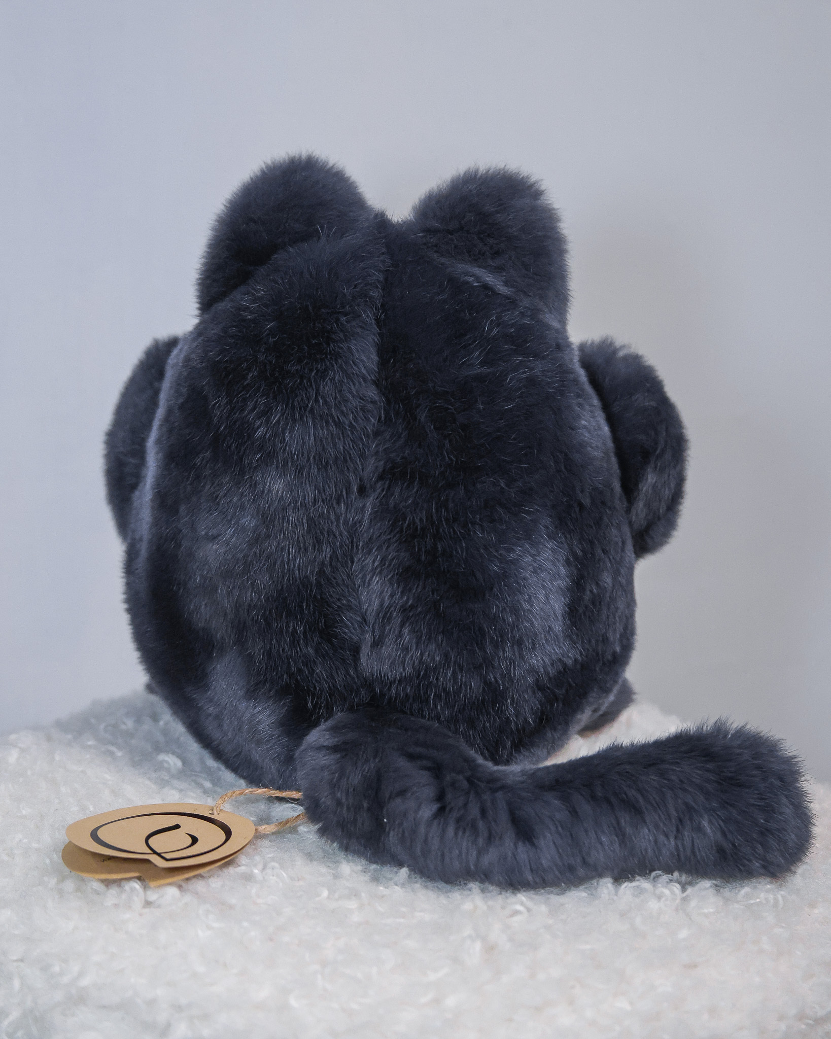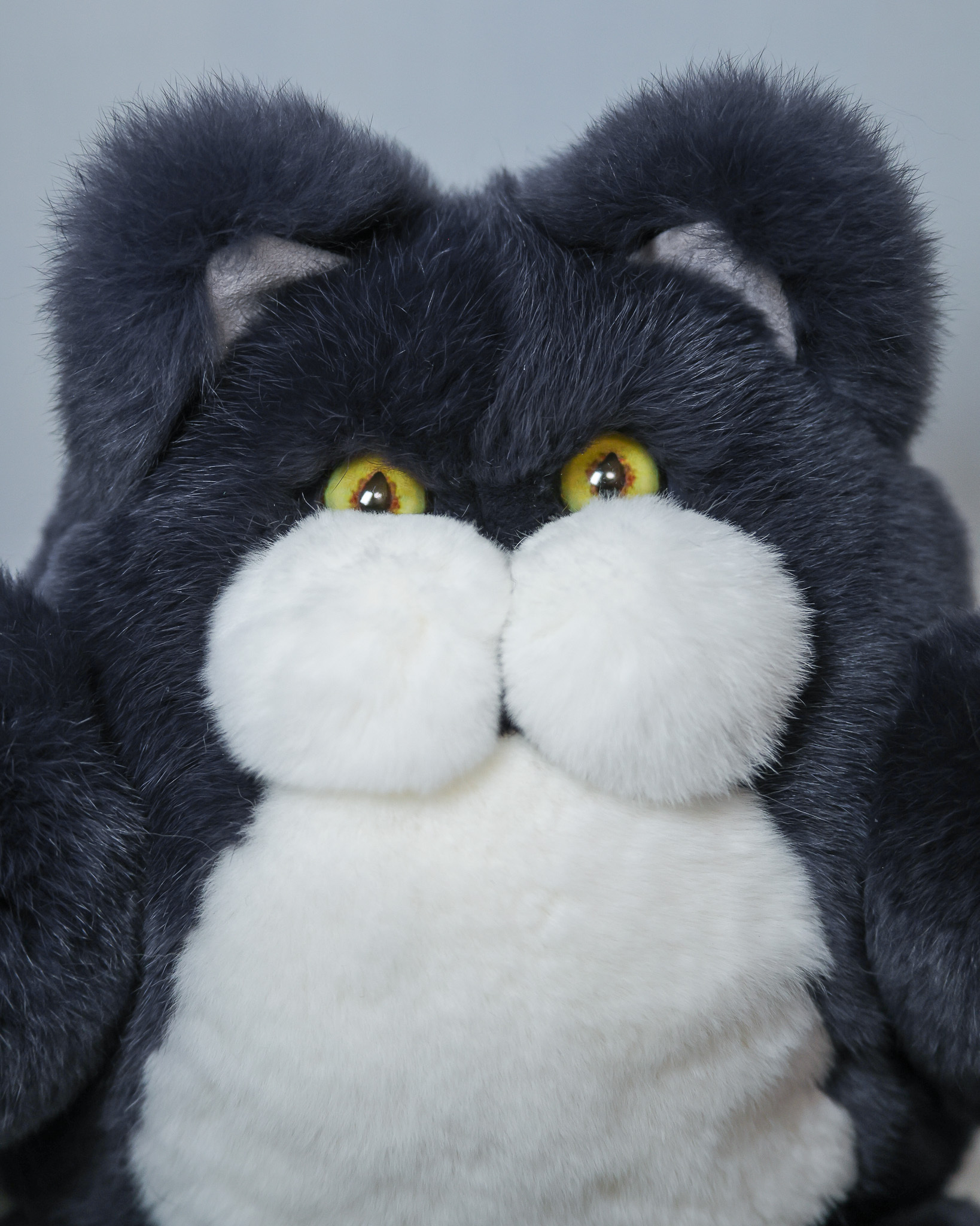 Кот Марсель сделан из натурального меха кролик рекс цвета темный графит, щечки и пузико из белого рекса. Ушки котика оформлены с использованием замшевых вставок.