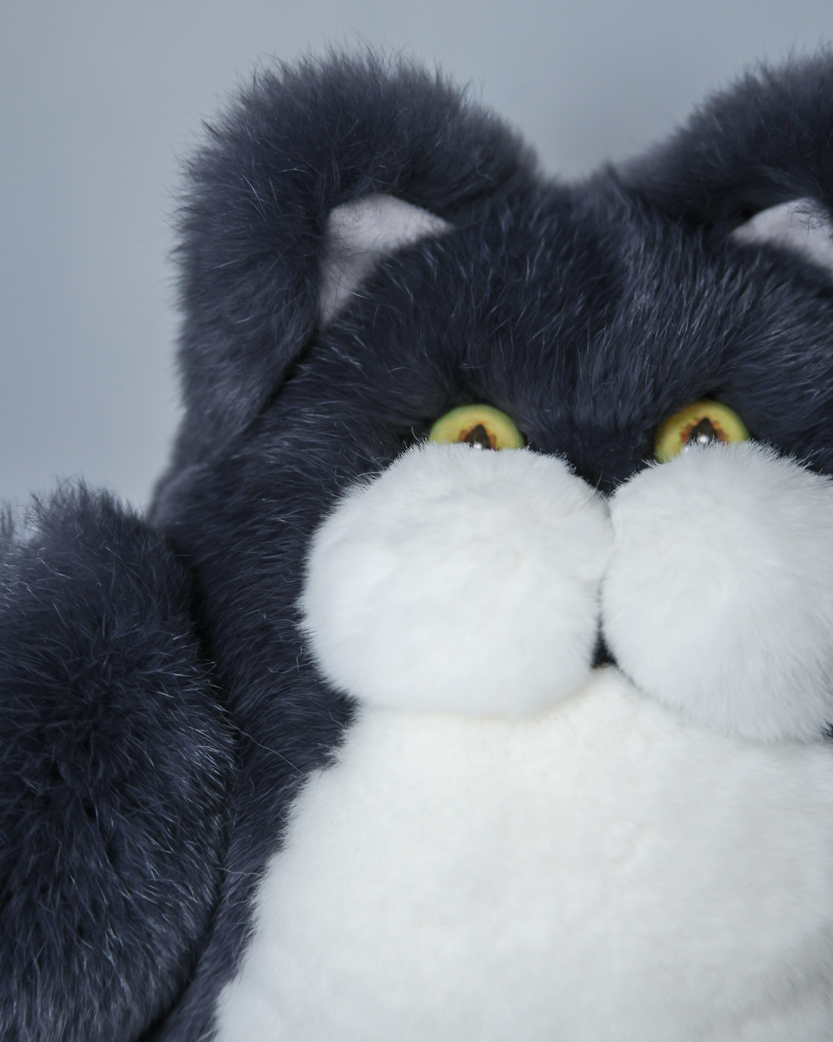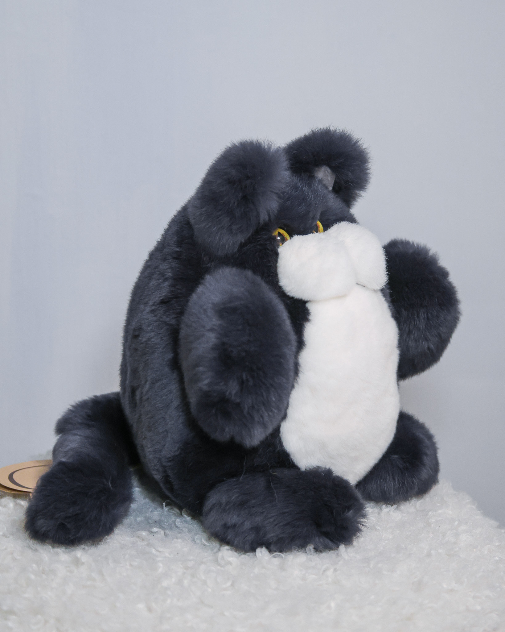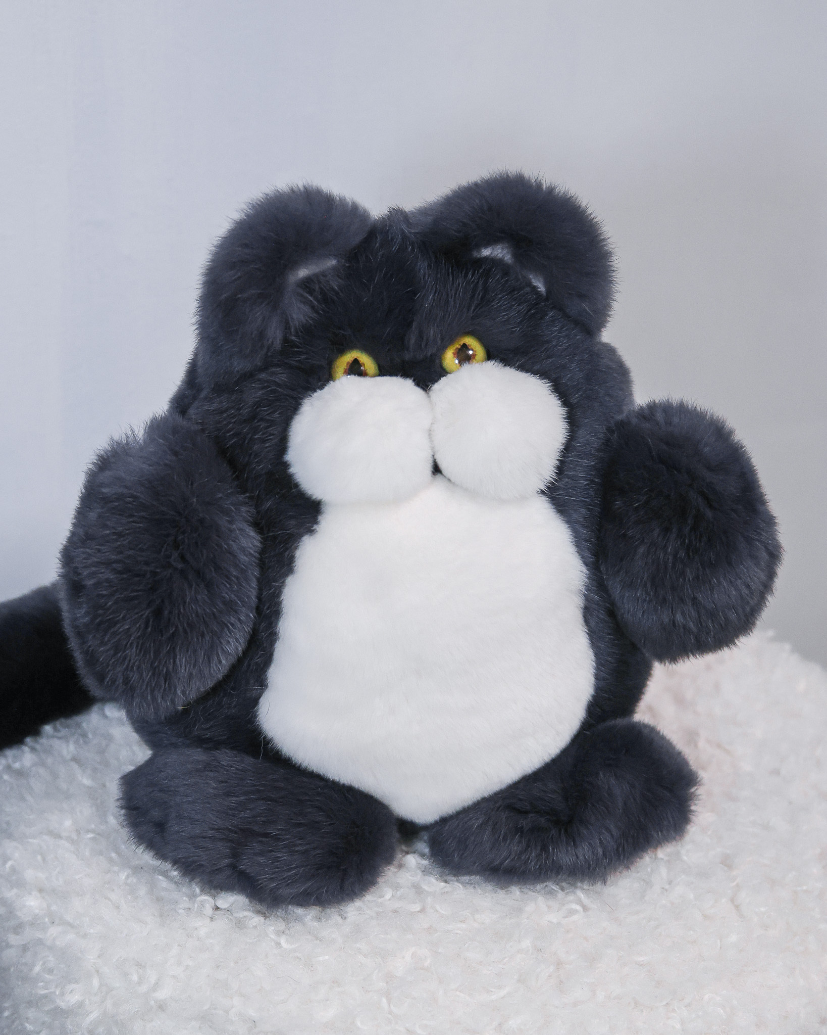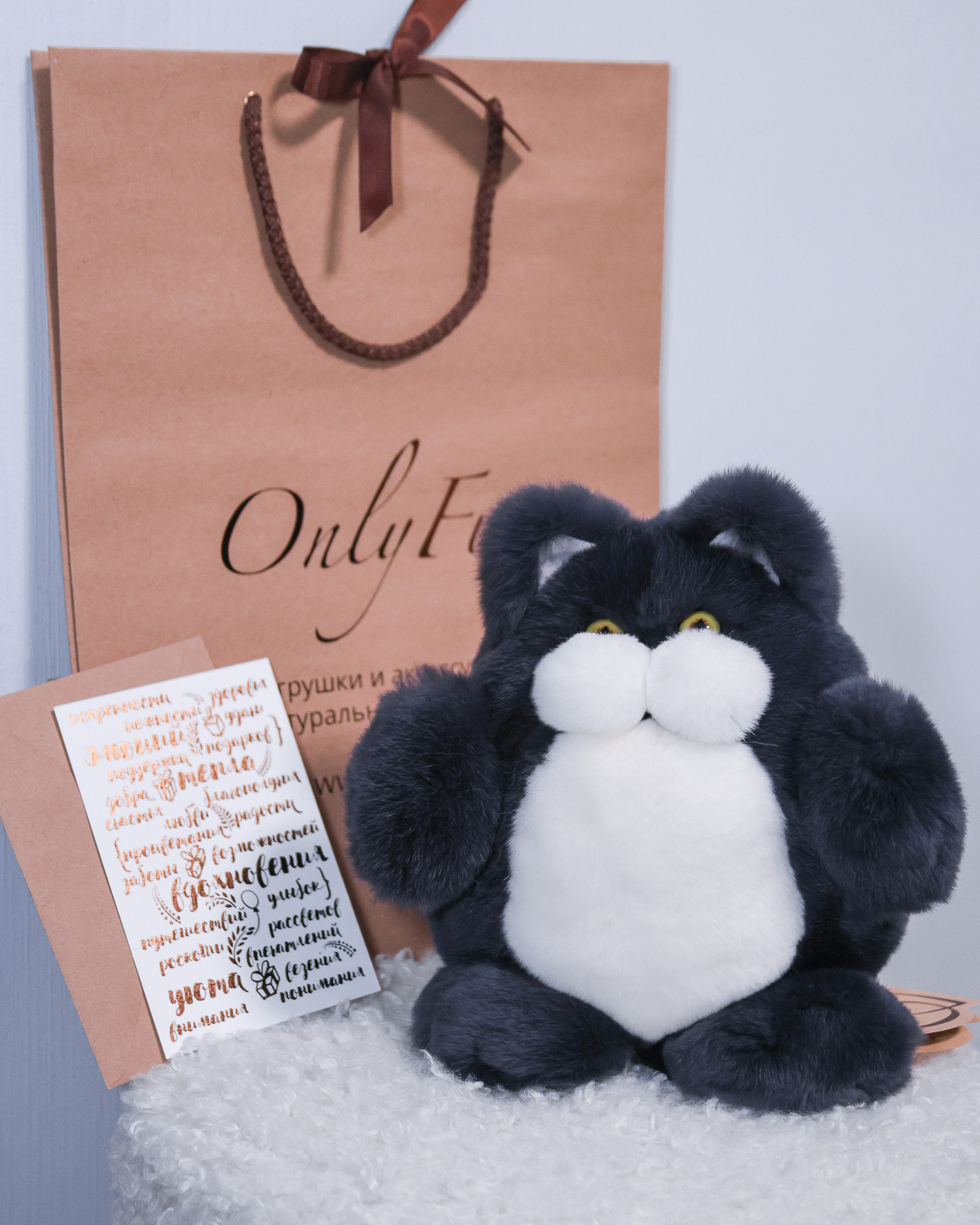 Кот Марсель сделан из натурального меха кролик рекс цвета темный графит, щечки и пузико из белого рекса. Ушки котика оформлены с использованием замшевых вставок.
