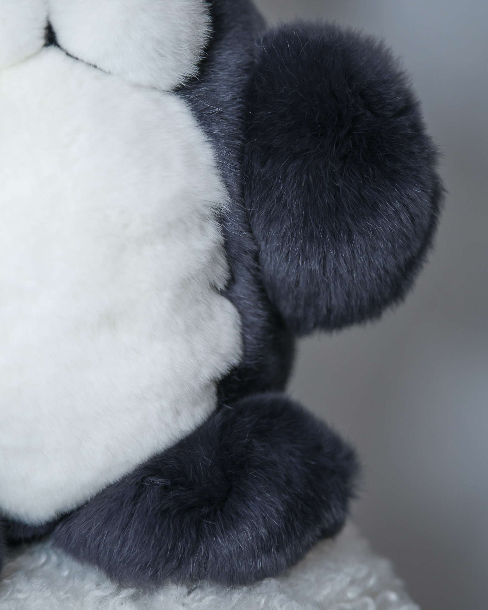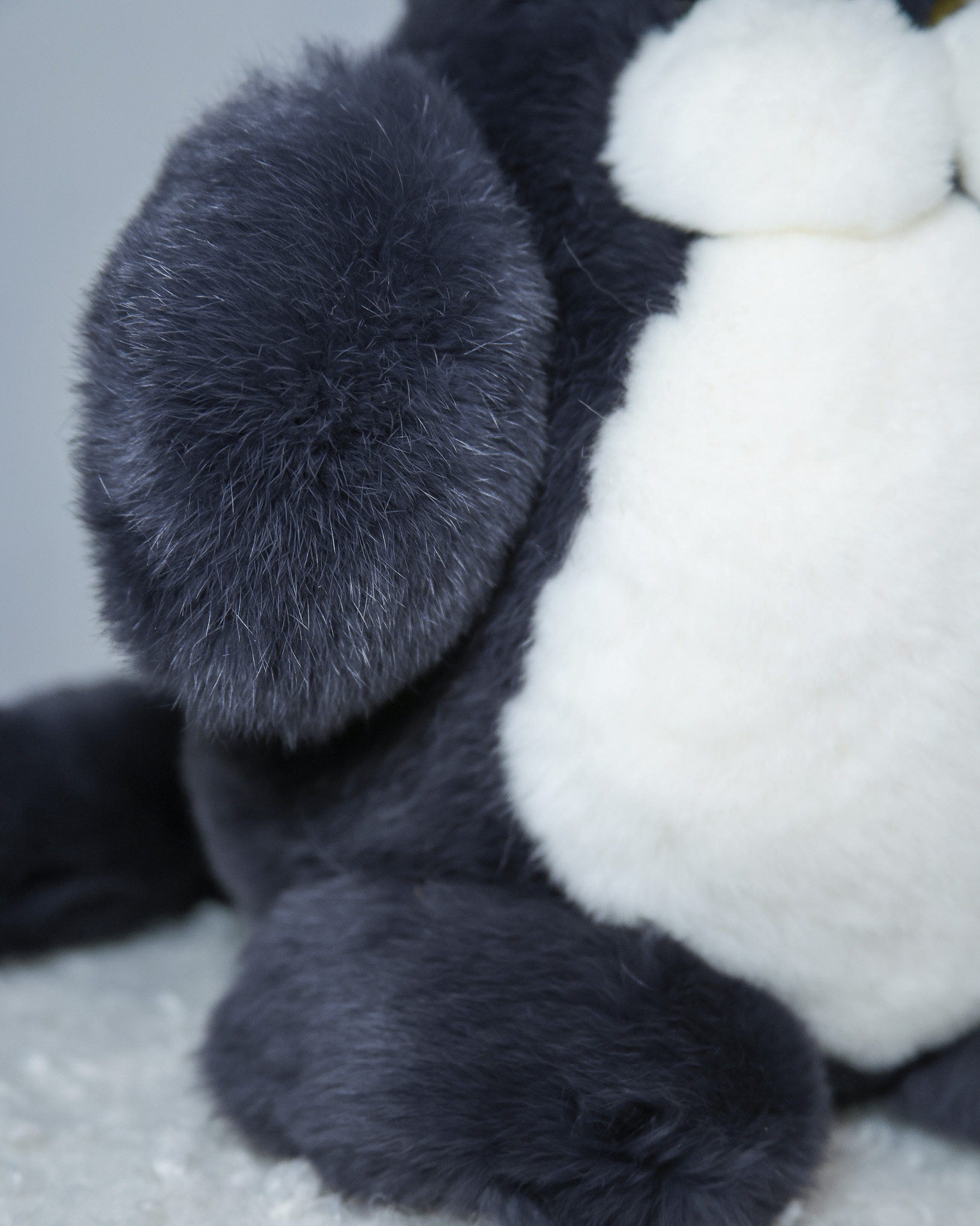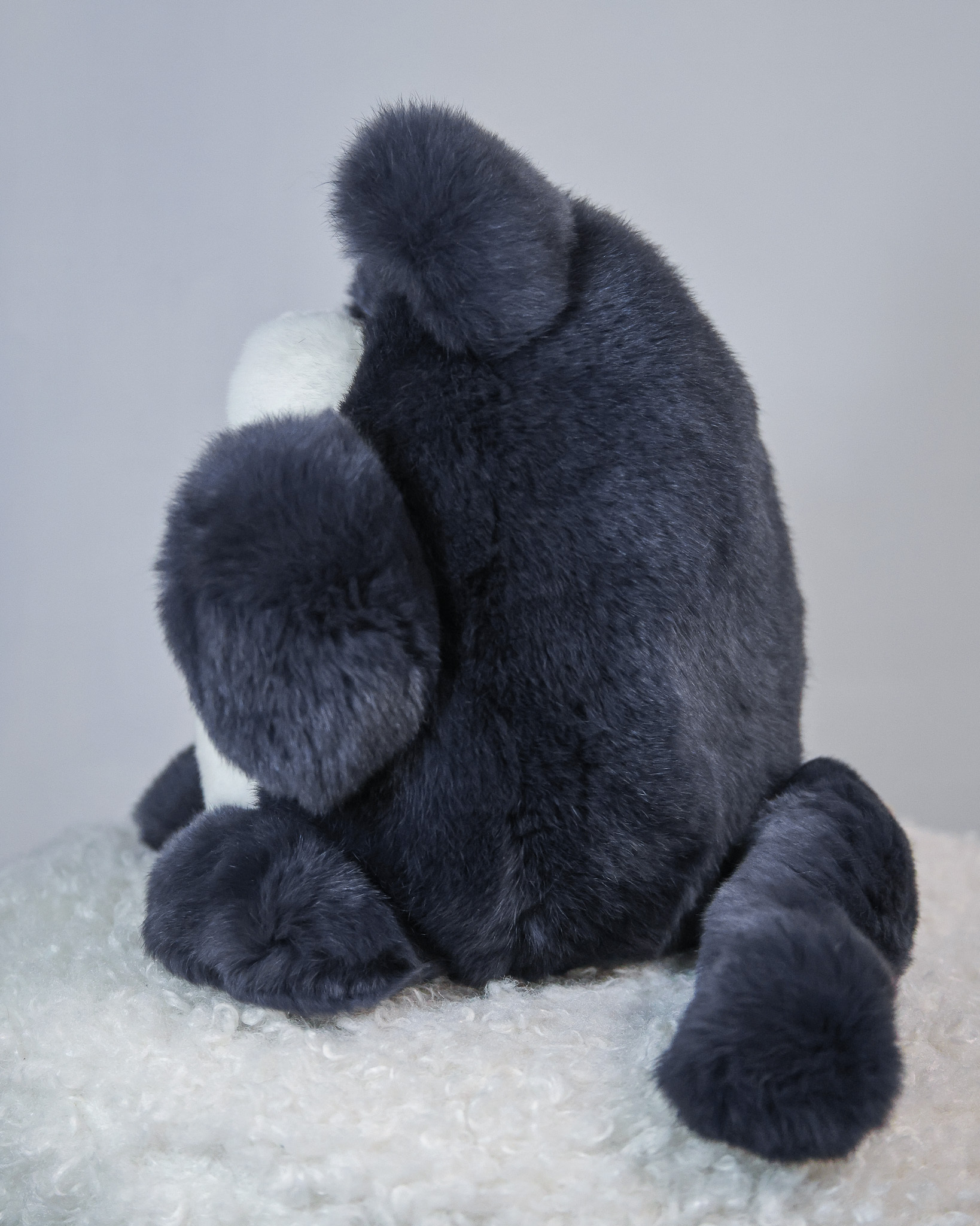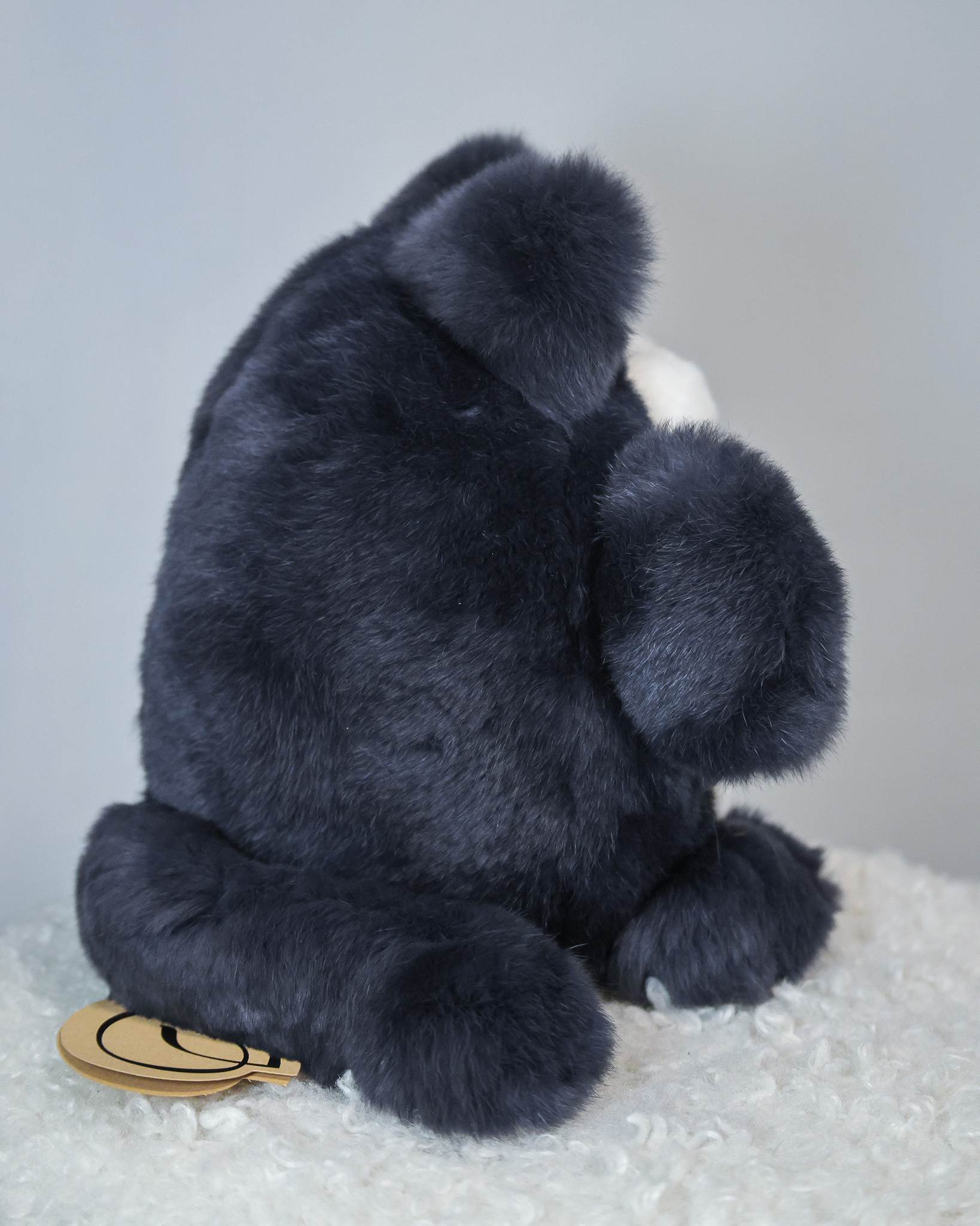 Кот Марсель сделан из натурального меха кролик рекс цвета темный графит, щечки и пузико из белого рекса. Ушки котика оформлены с использованием замшевых вставок.