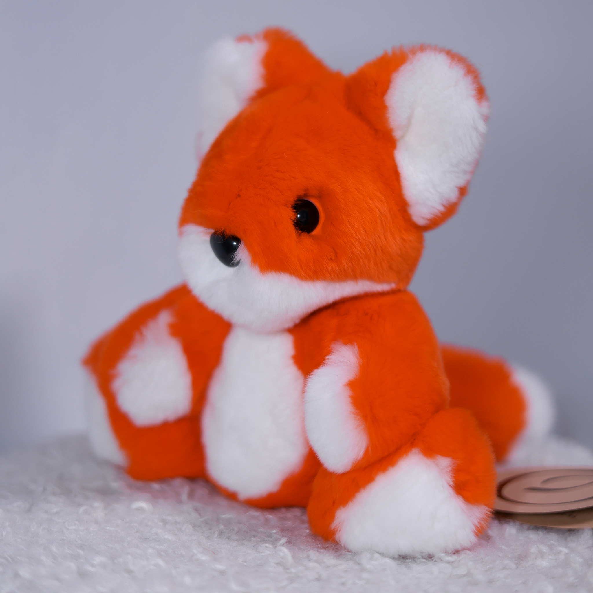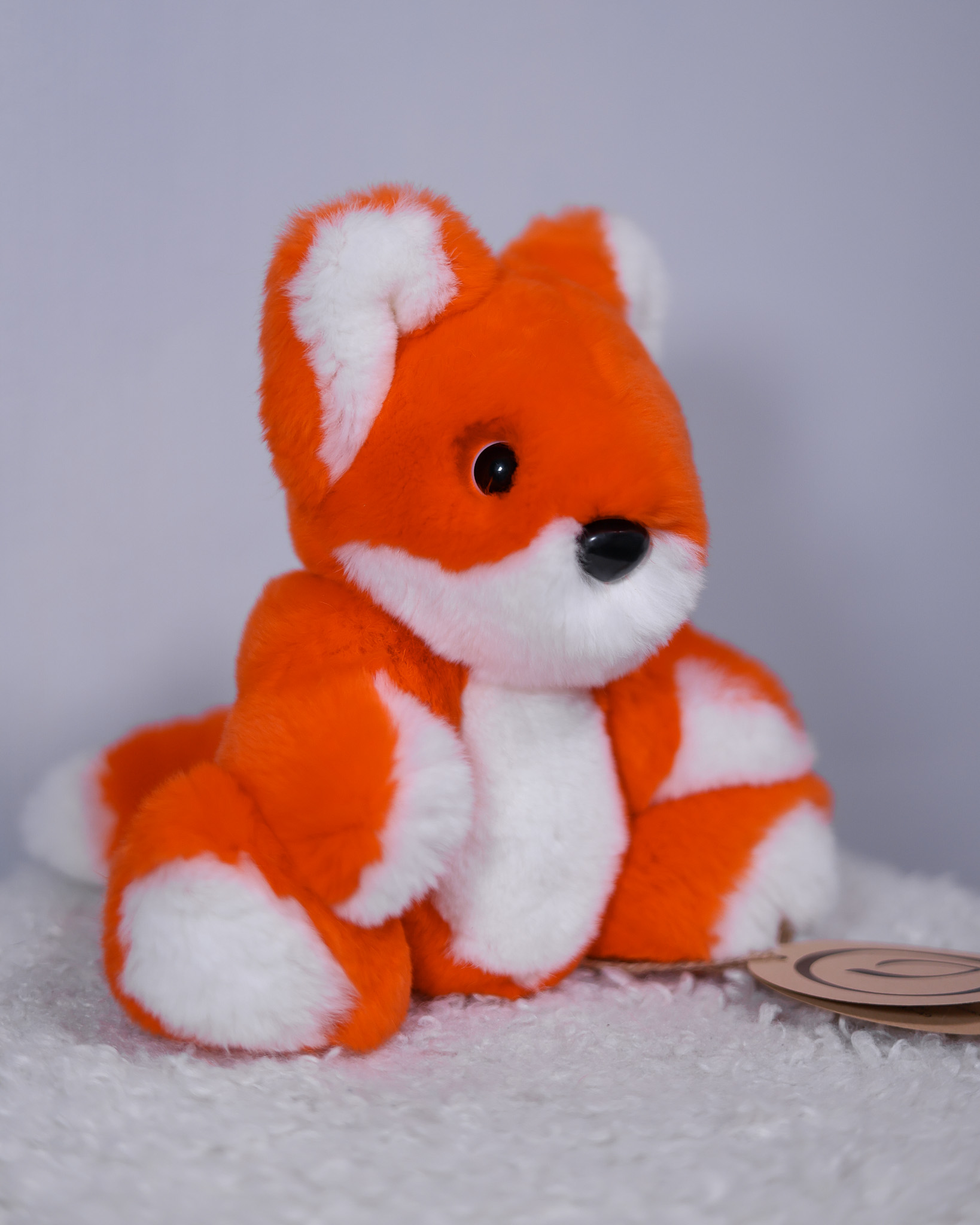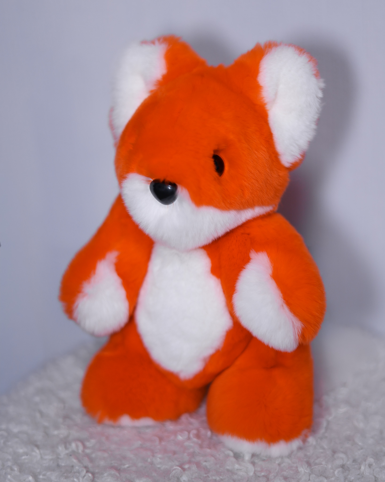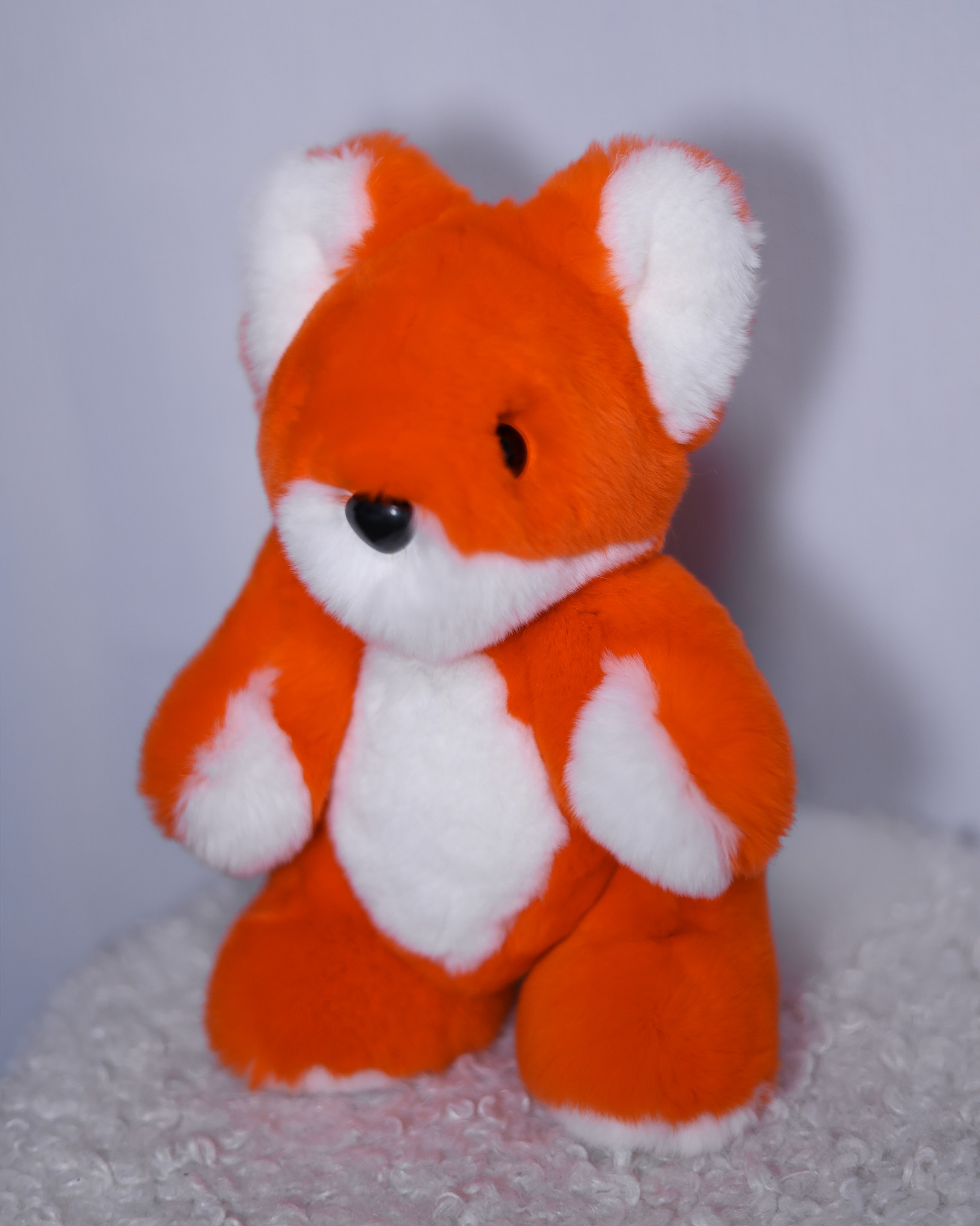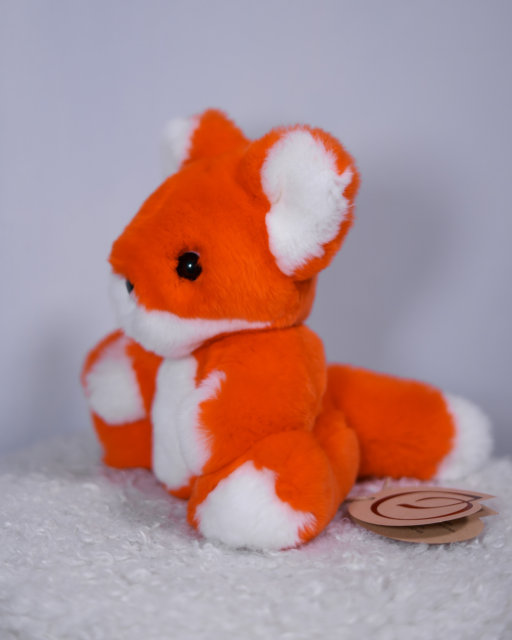 Лисёнок Рыжик сделан из натурального меха кролик рекс сочного ярко-оранжевого цвета с белыми акцентами. Особенность игрушки — возможность менять положение лапок за счет шарниров.