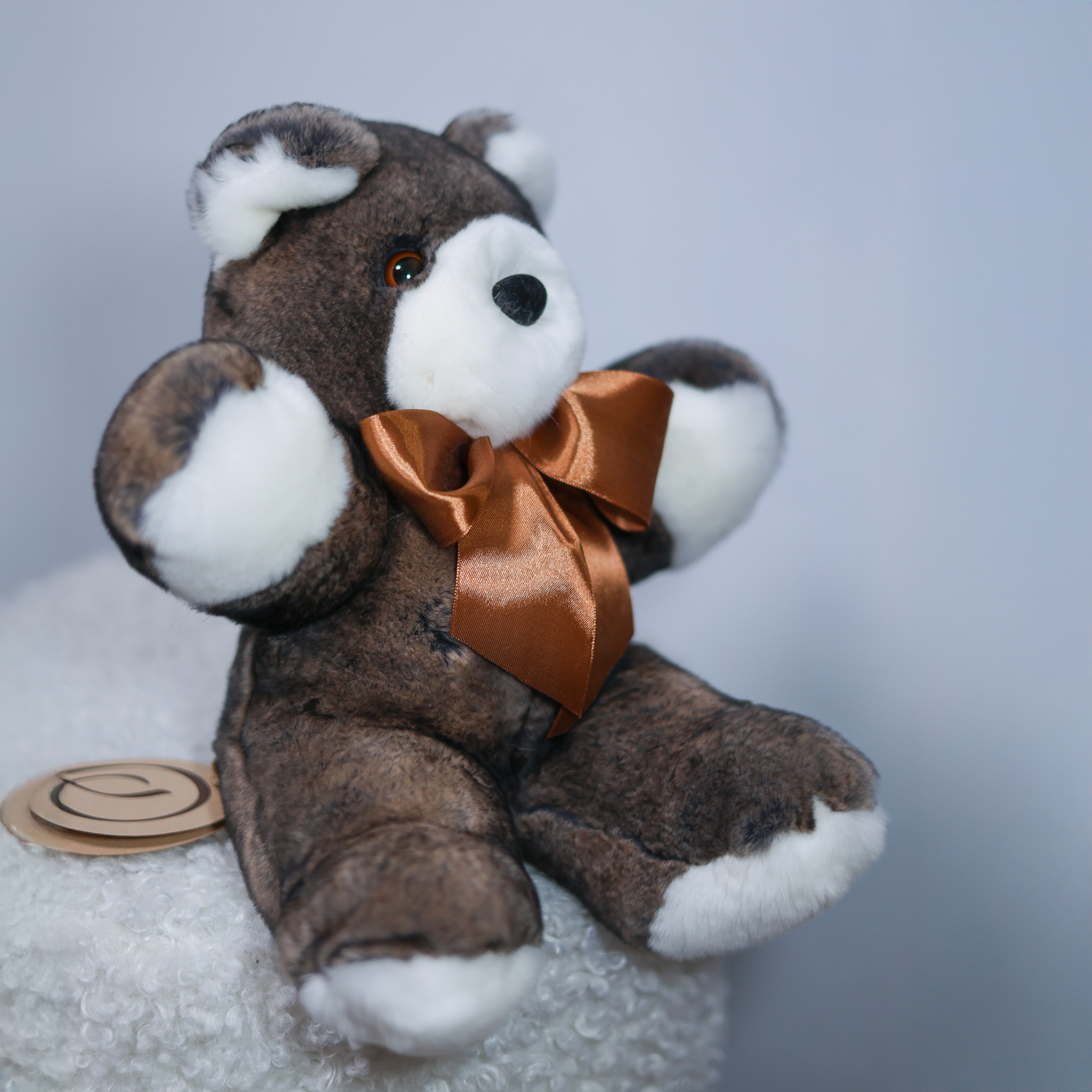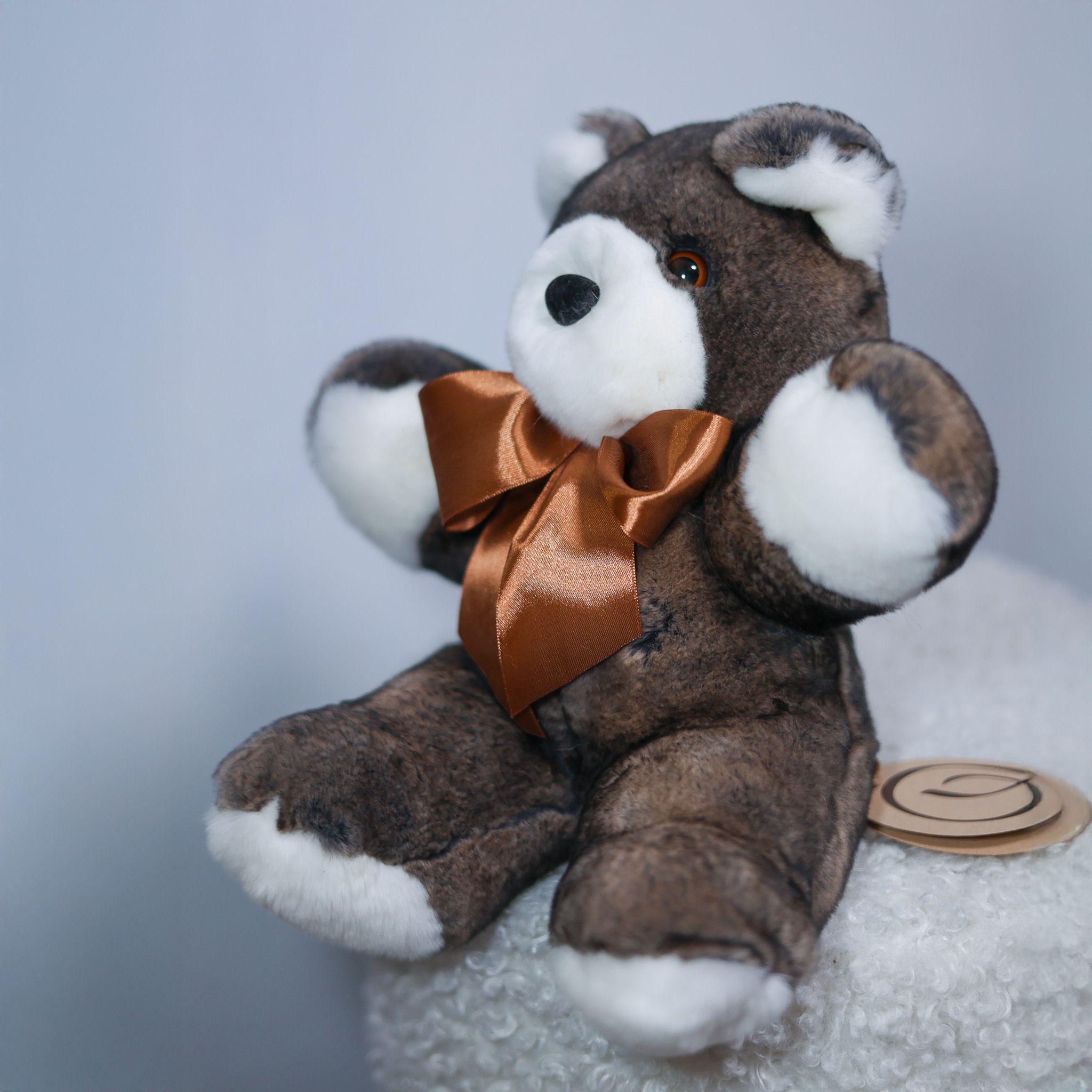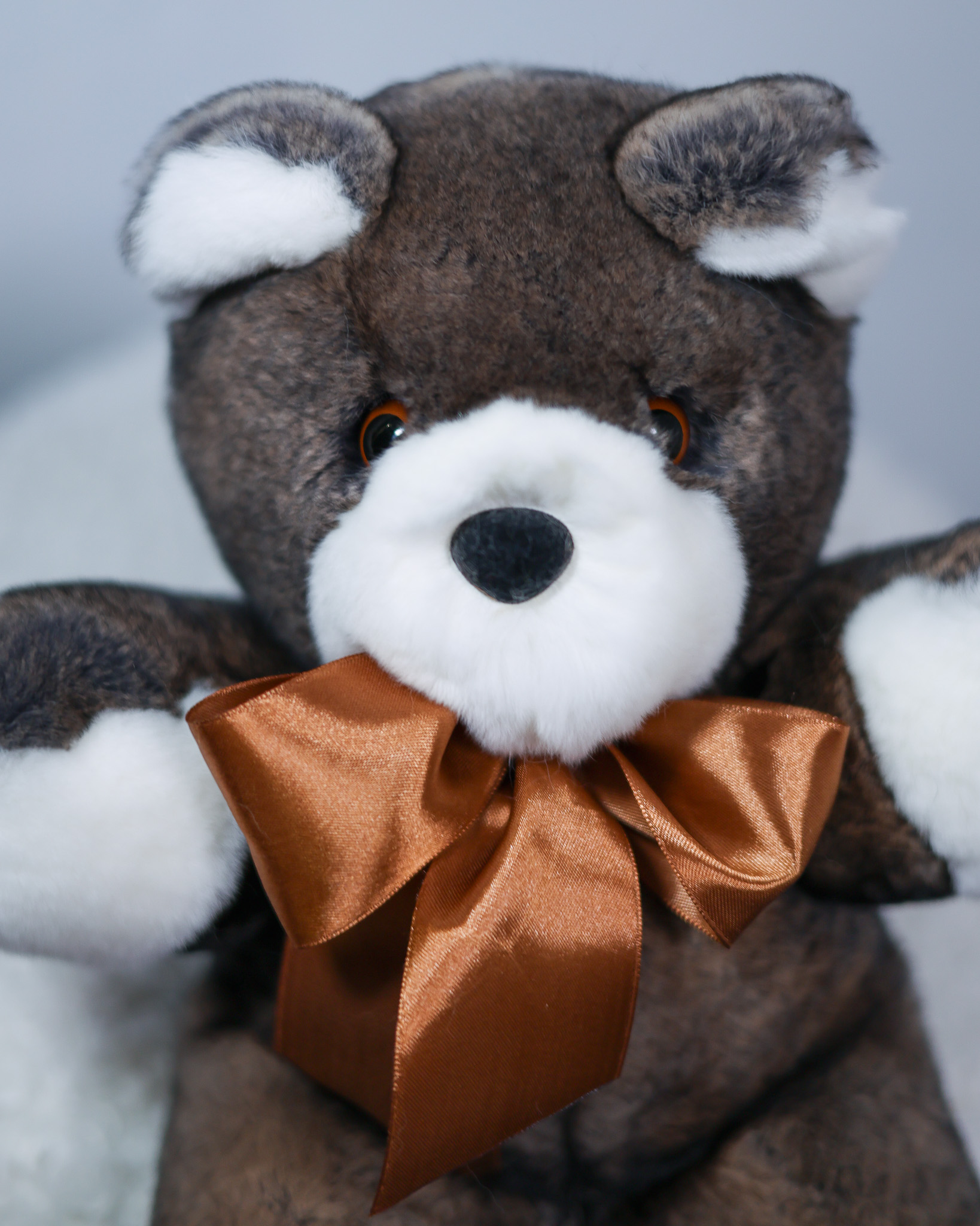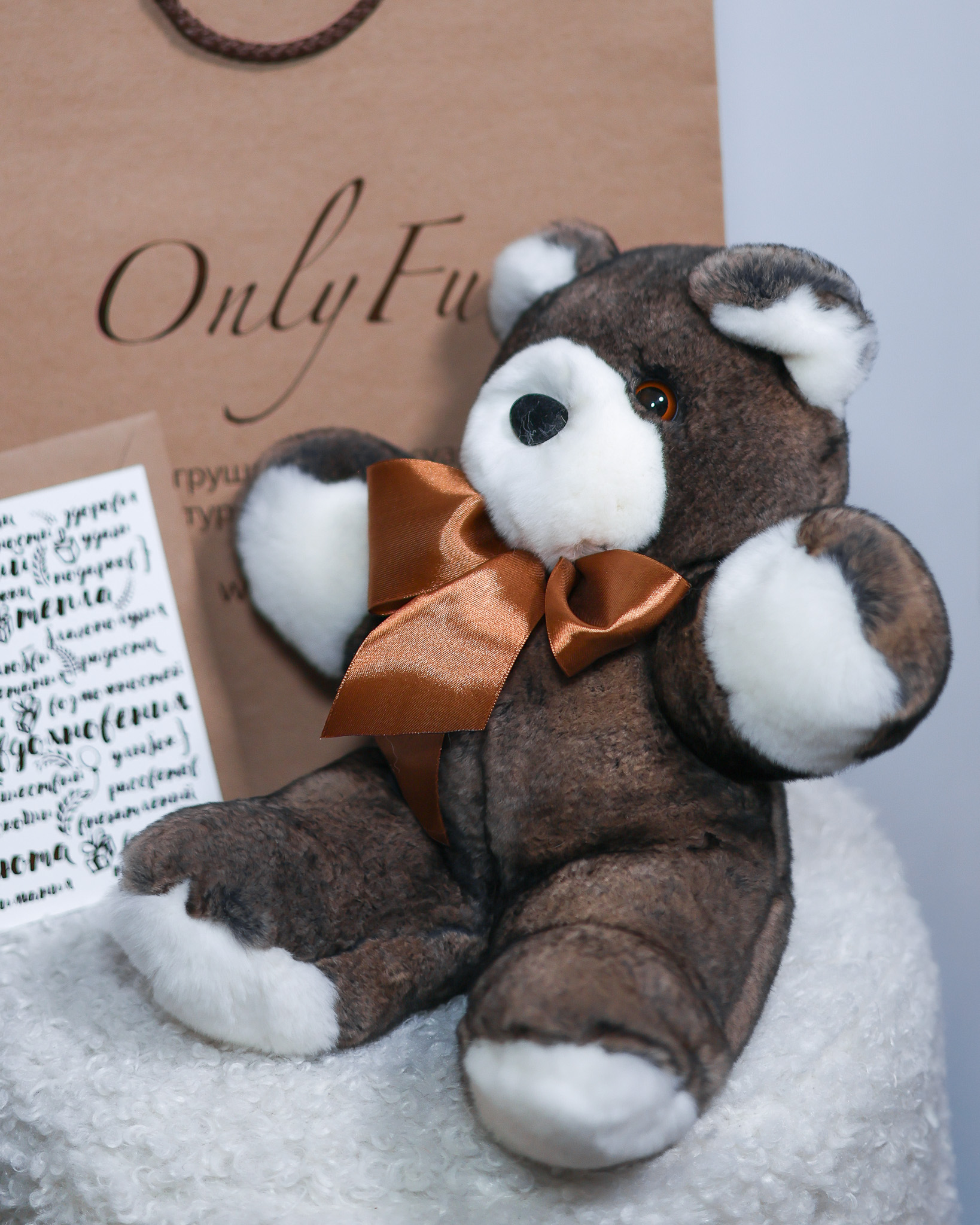 Медведь Мишутка сделан из натурального меха кролик рекс коричневого цвета с вставками из белого меха на мордочке, лапках и в ушках. Мишутка украшен декоративным атласным бантом, который при желании можно снять.