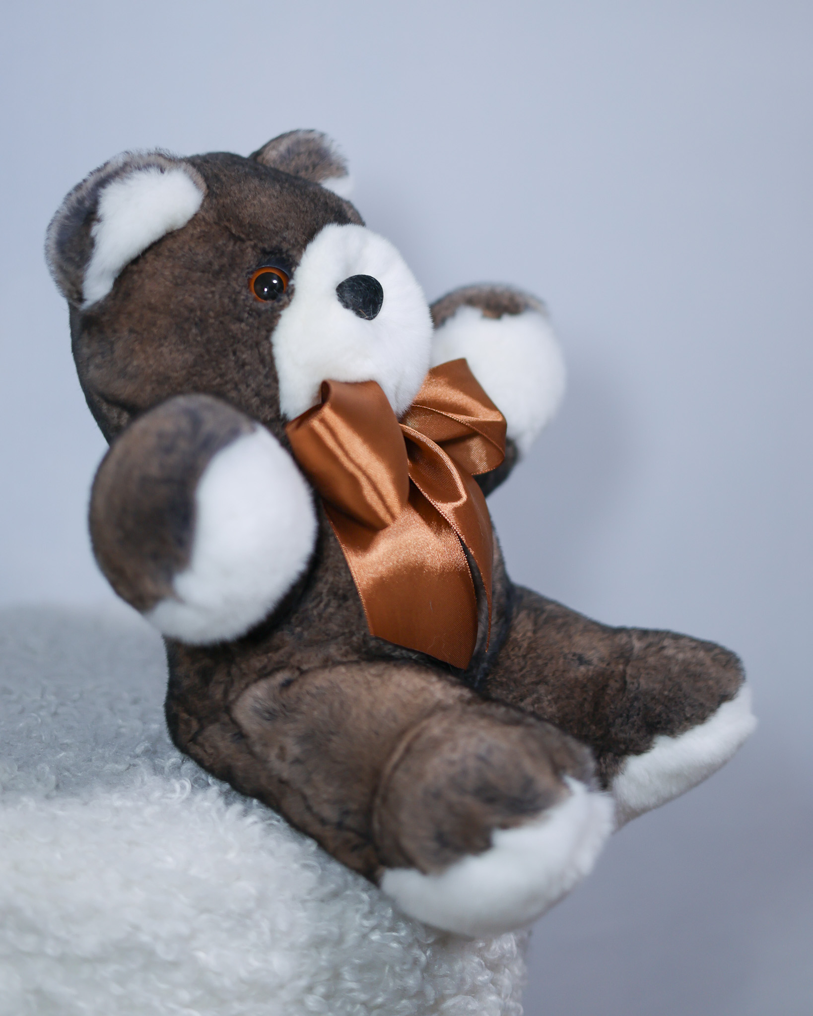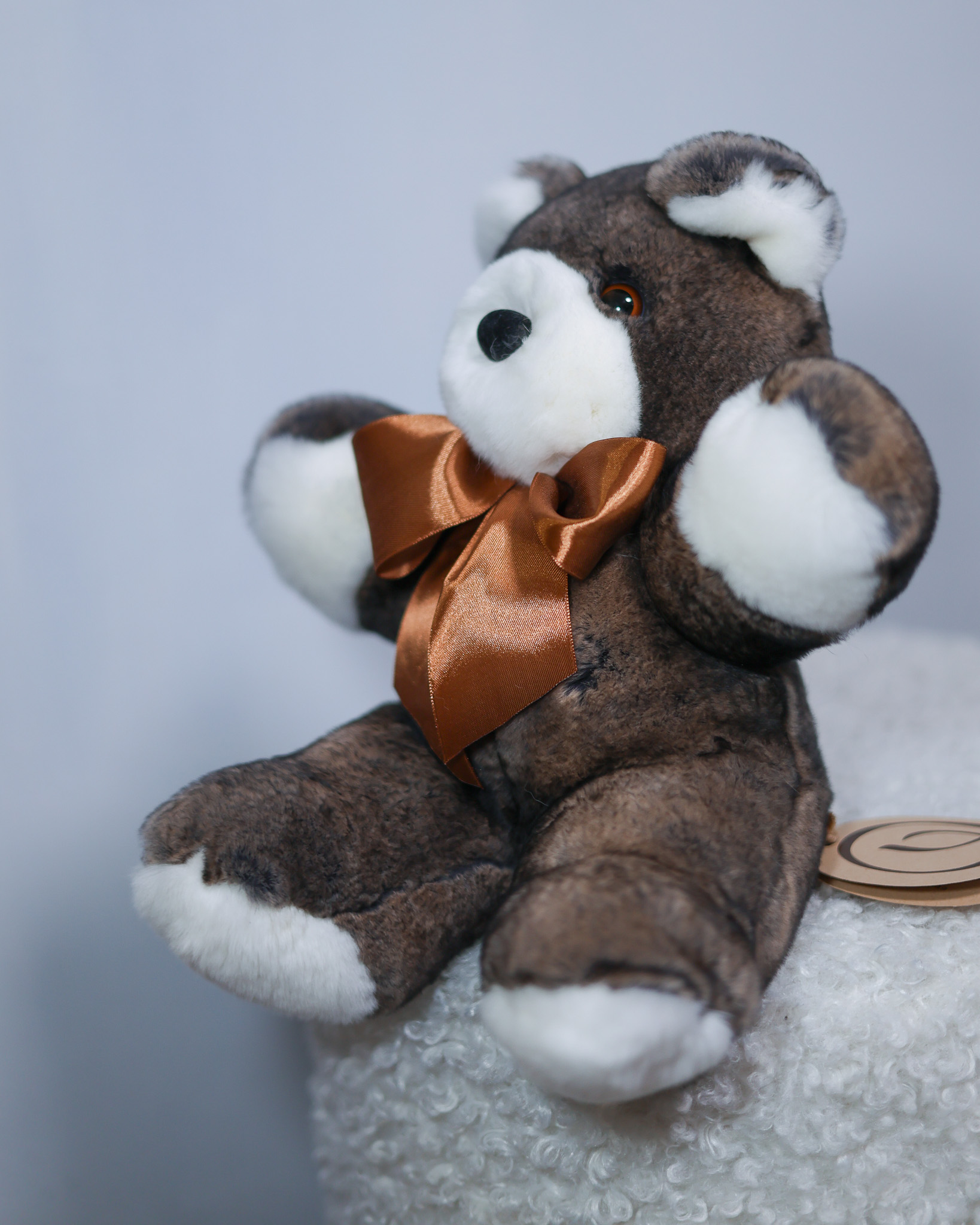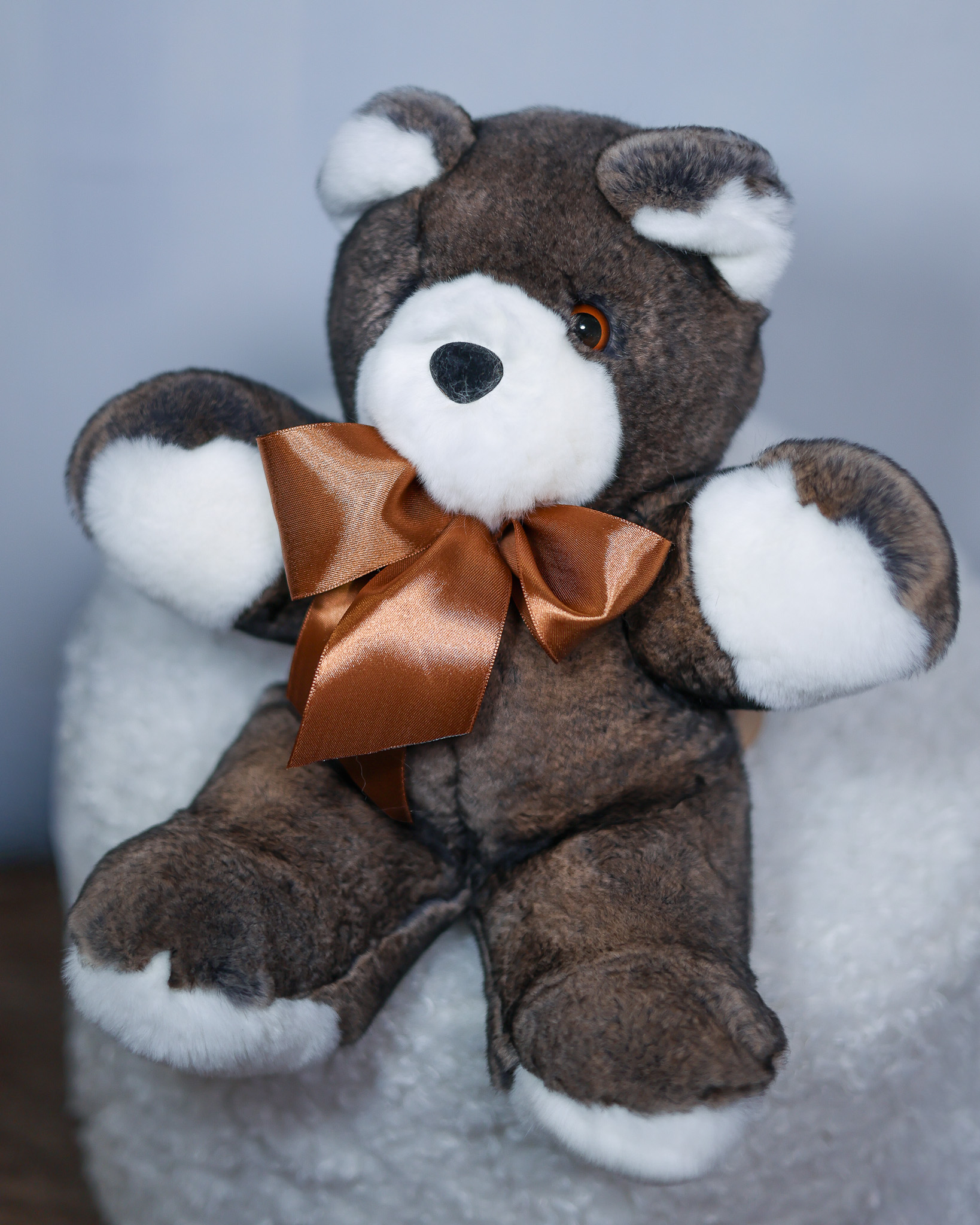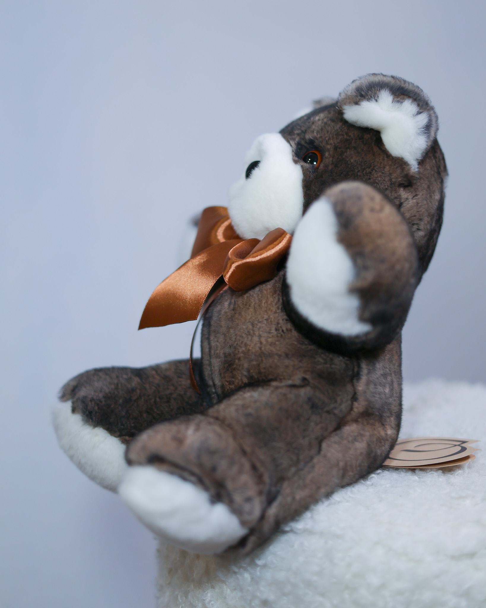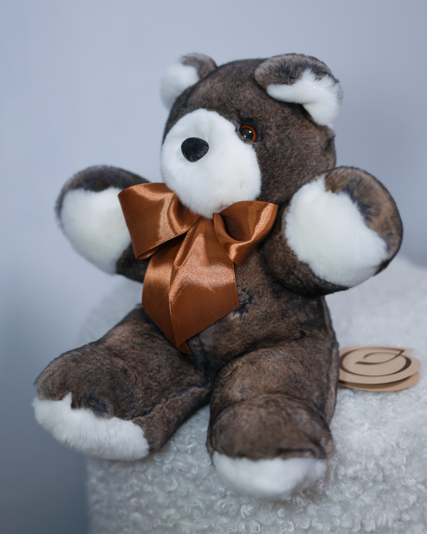 Медведь Мишутка сделан из натурального меха кролик рекс коричневого цвета с вставками из белого меха на мордочке, лапках и в ушках. Мишутка украшен декоративным атласным бантом, который при желании можно снять.