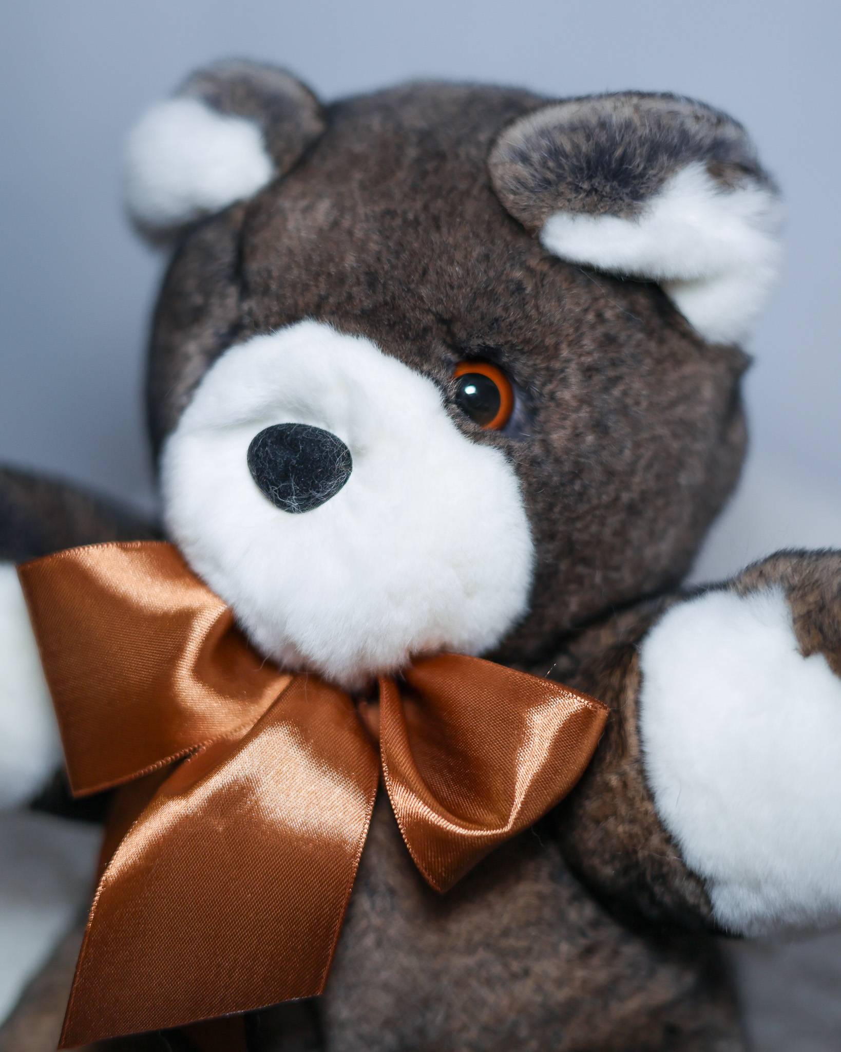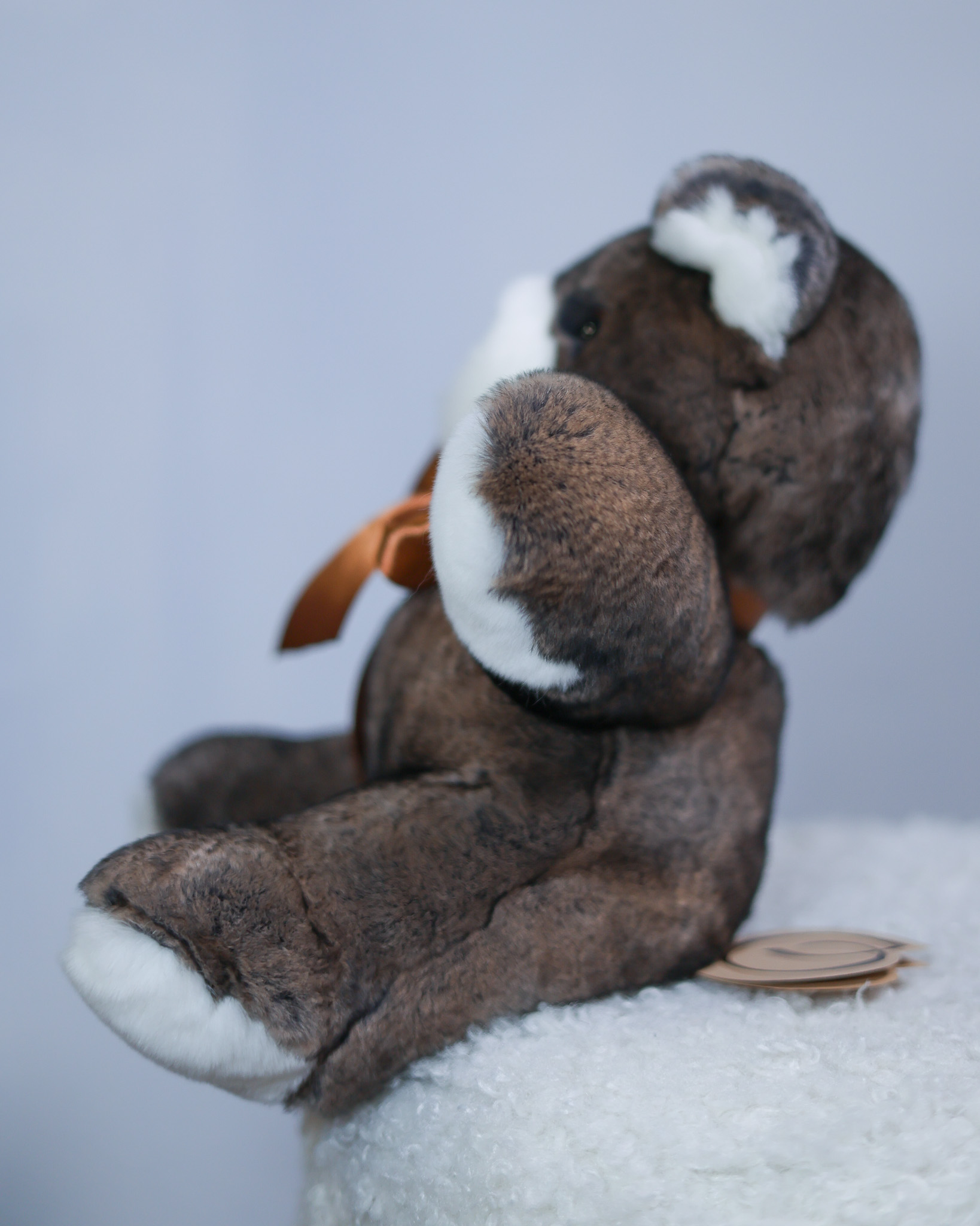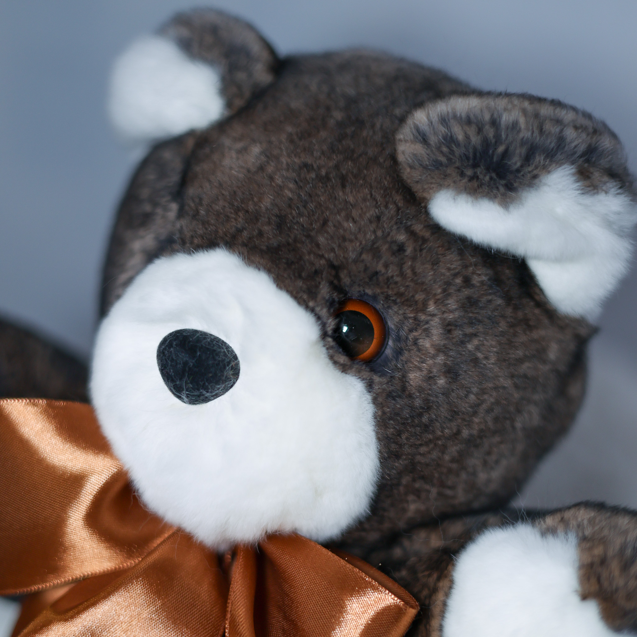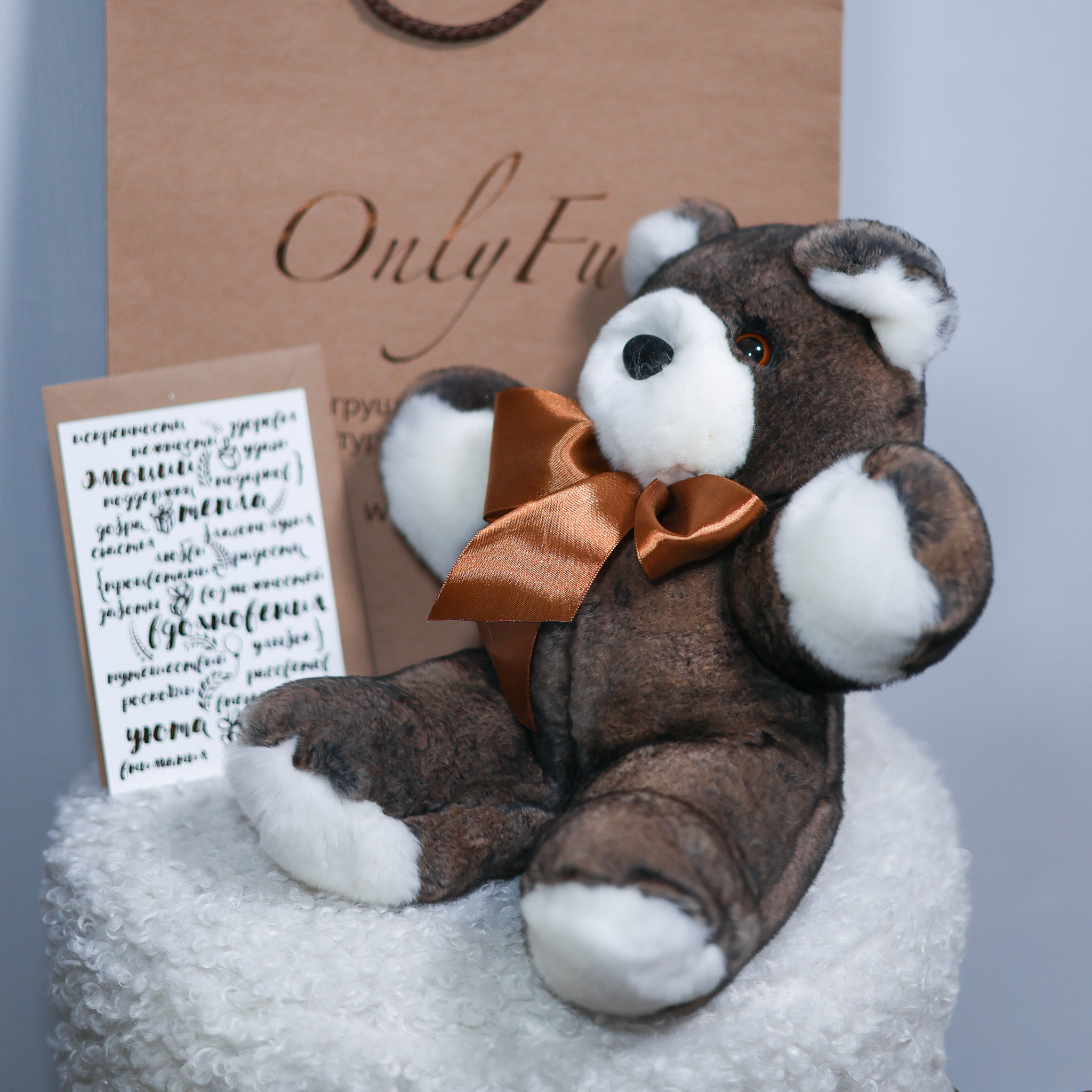 Медведь Мишутка сделан из натурального меха кролик рекс коричневого цвета с вставками из белого меха на мордочке, лапках и в ушках. Мишутка украшен декоративным атласным бантом, который при желании можно снять.