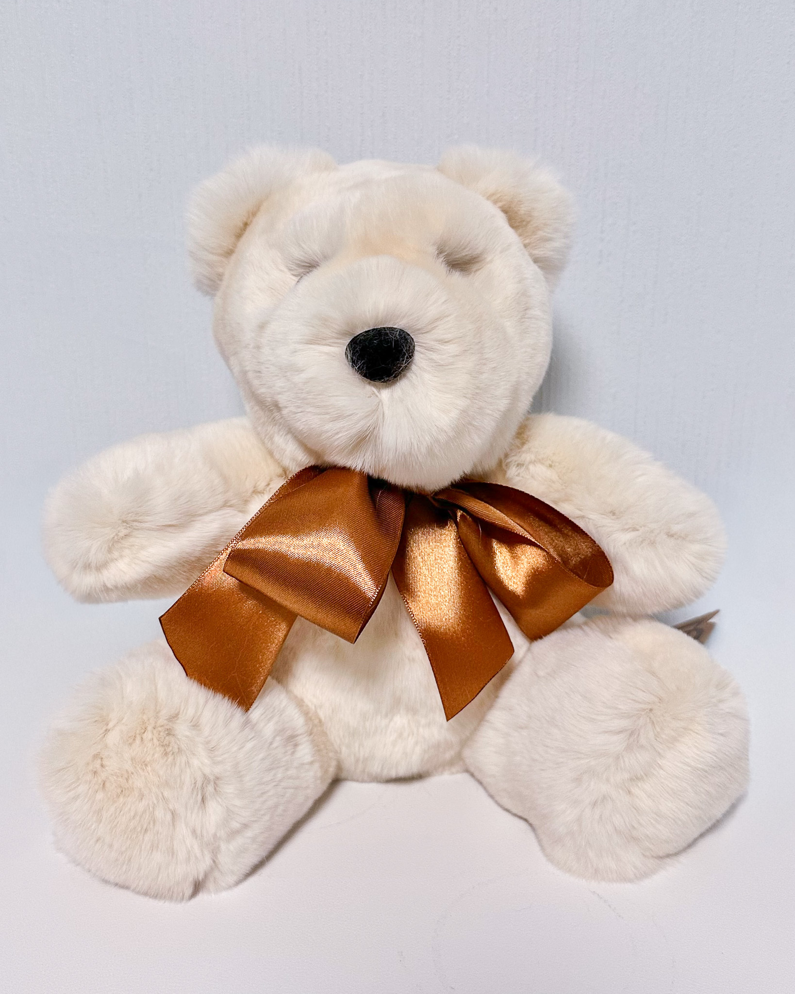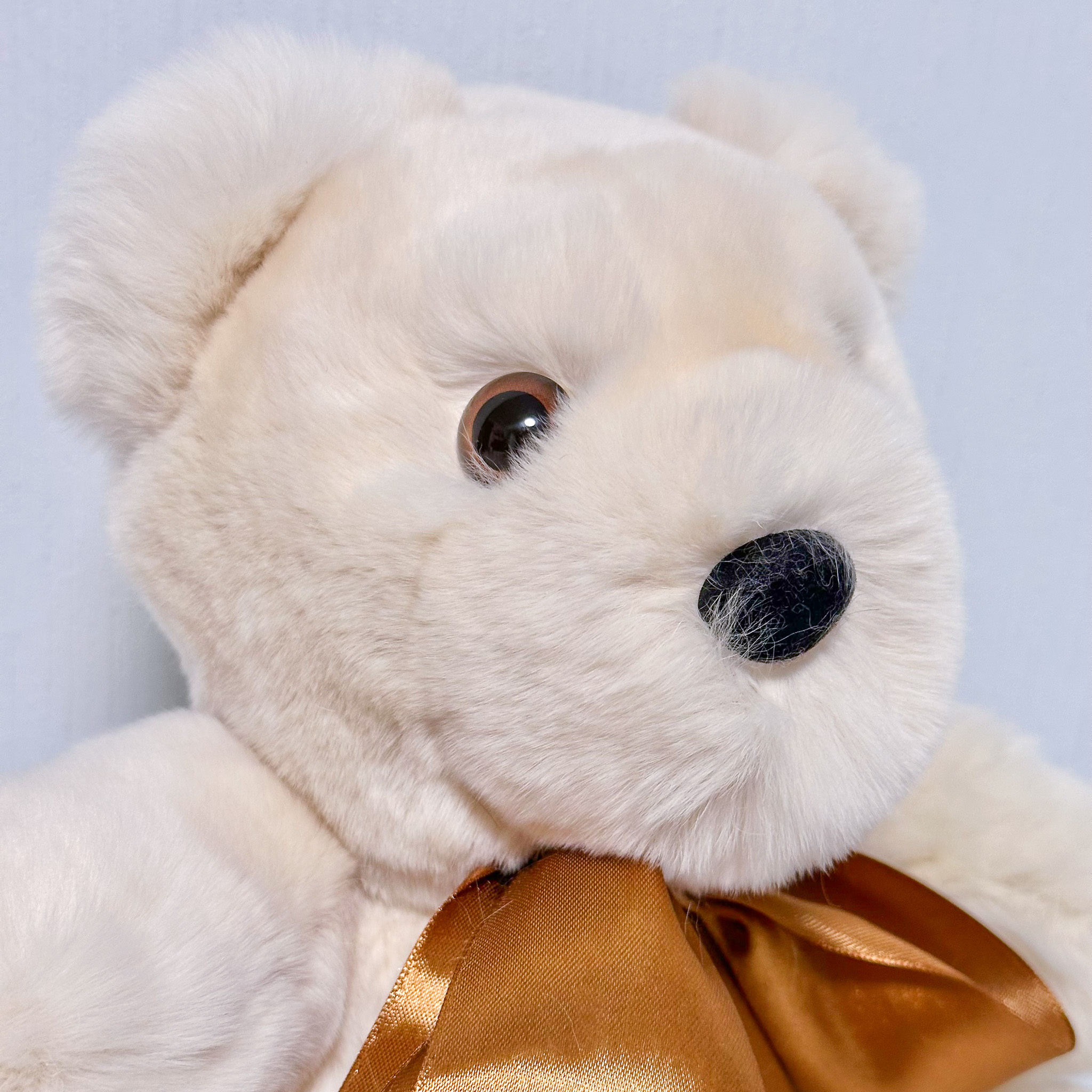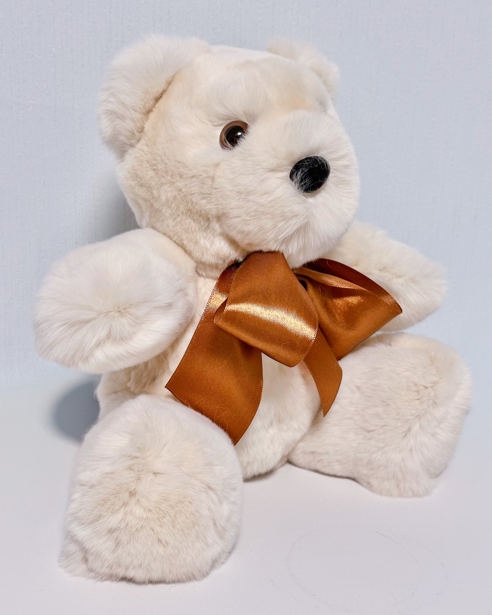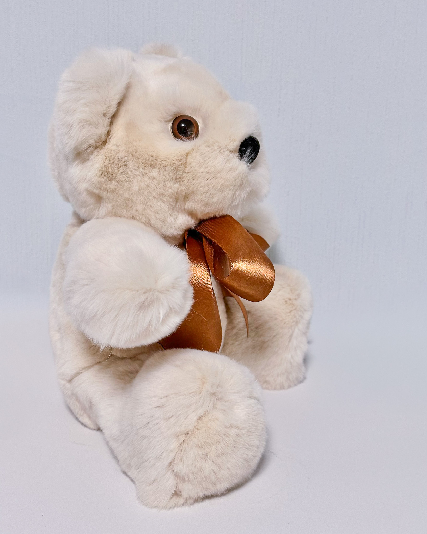 Медведь Ретро сделан из натурального меха кролик рекс нежного сливочно-кремового цвета и украшен декоративным атласным бантом, который при желании можно снять. Солидный размер идеален для обнимашек.