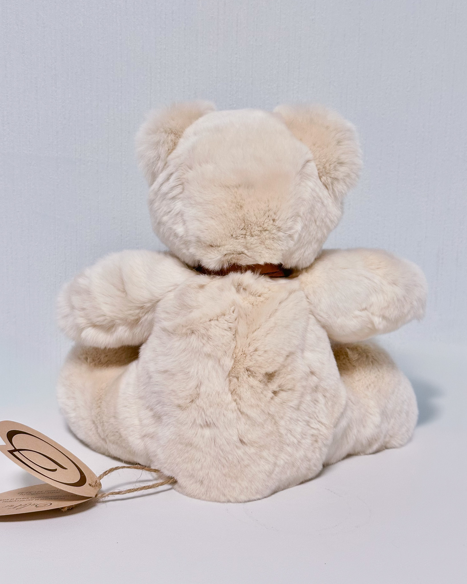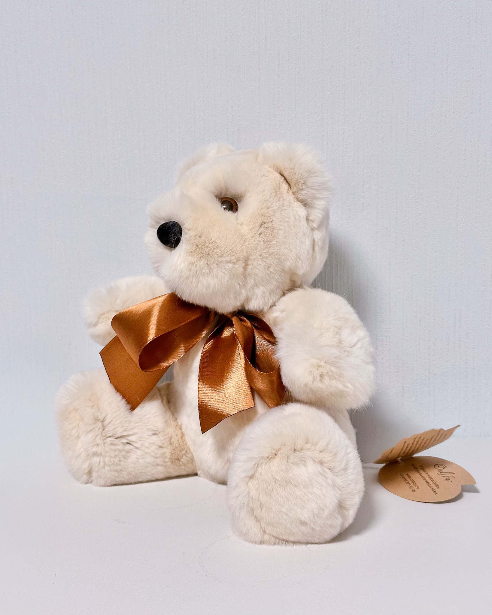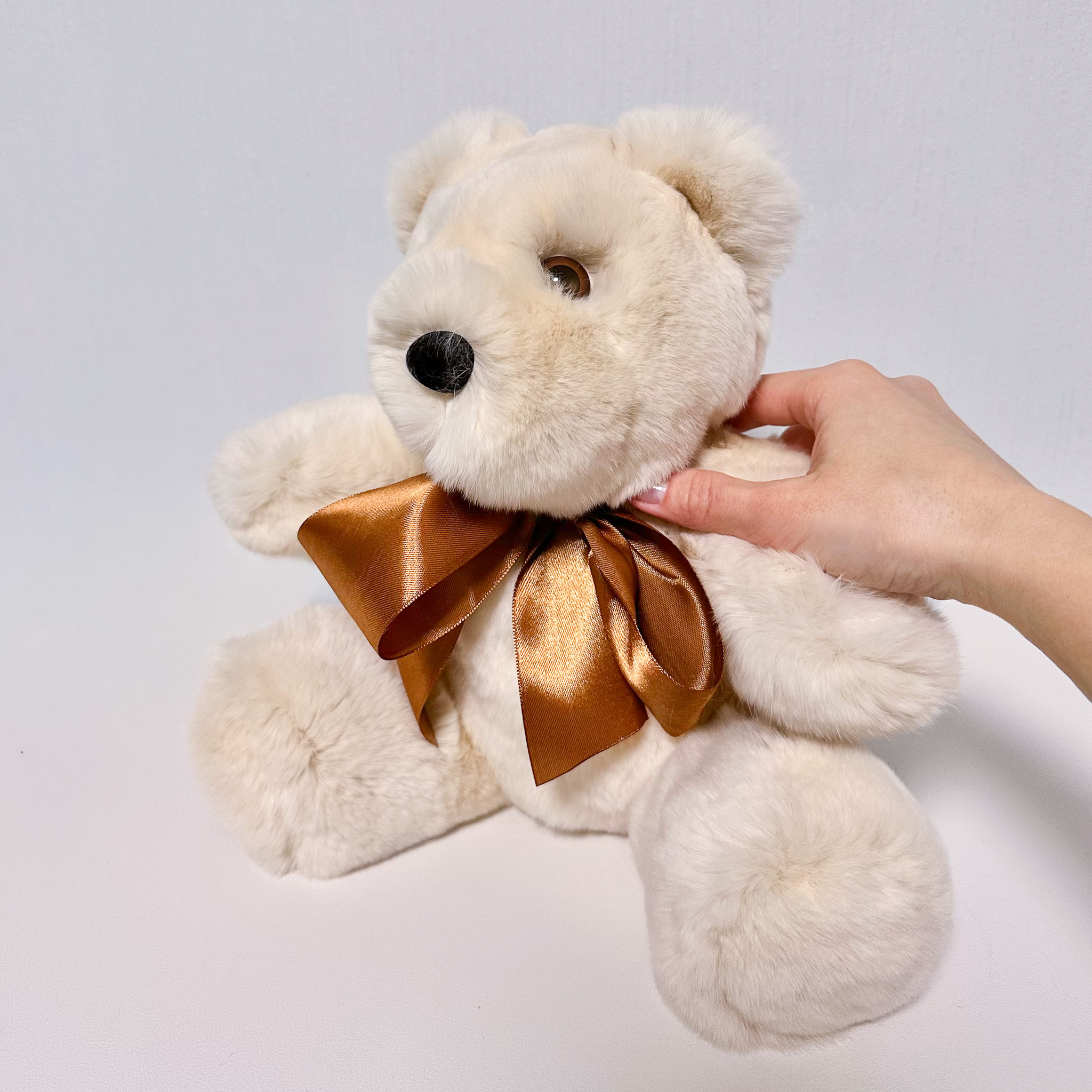 Медведь Ретро сделан из натурального меха кролик рекс нежного сливочно-кремового цвета и украшен декоративным атласным бантом, который при желании можно снять. Солидный размер идеален для обнимашек.