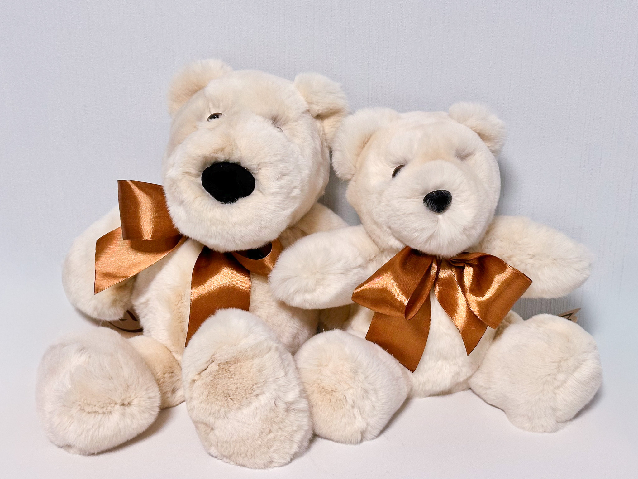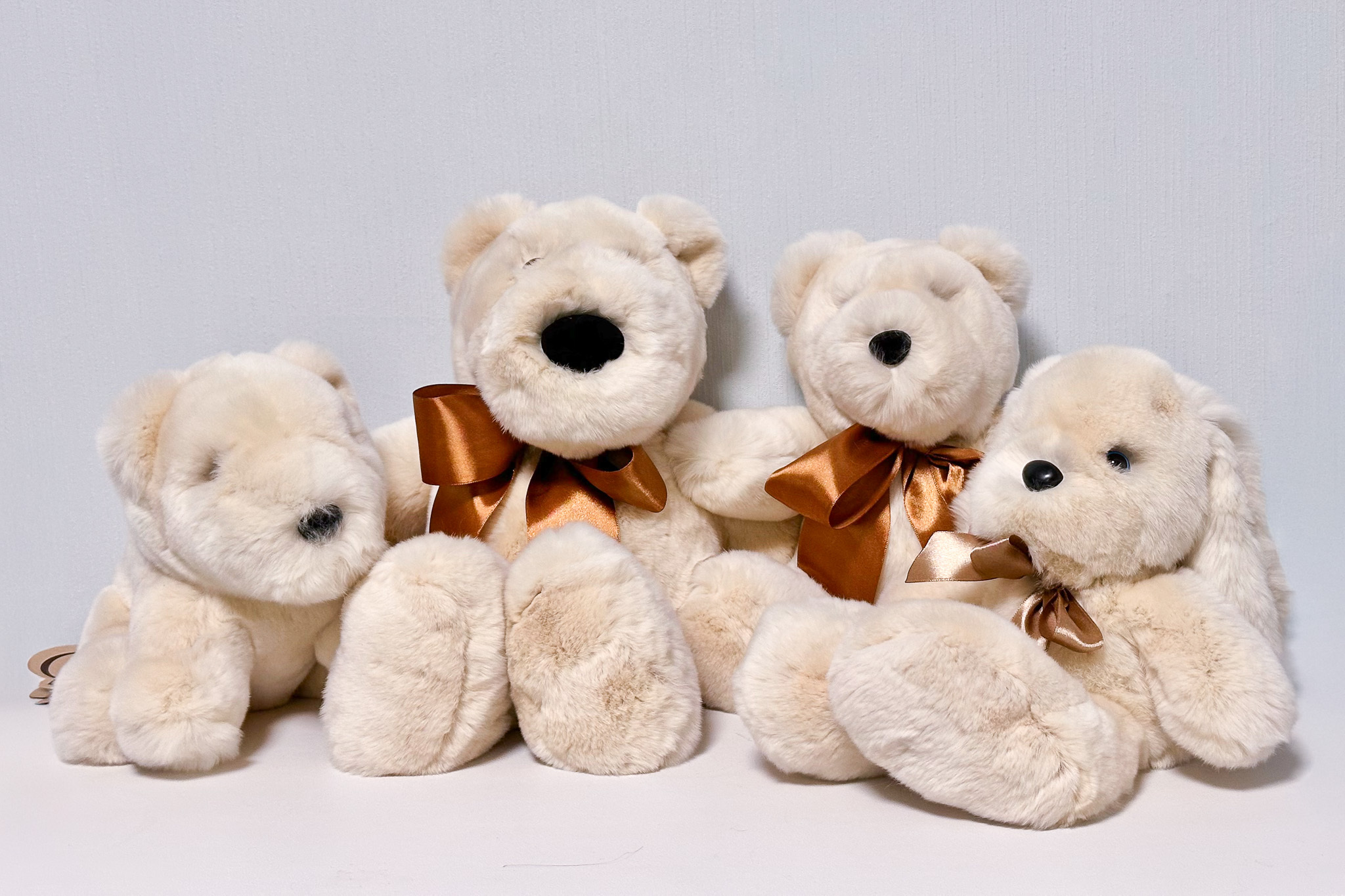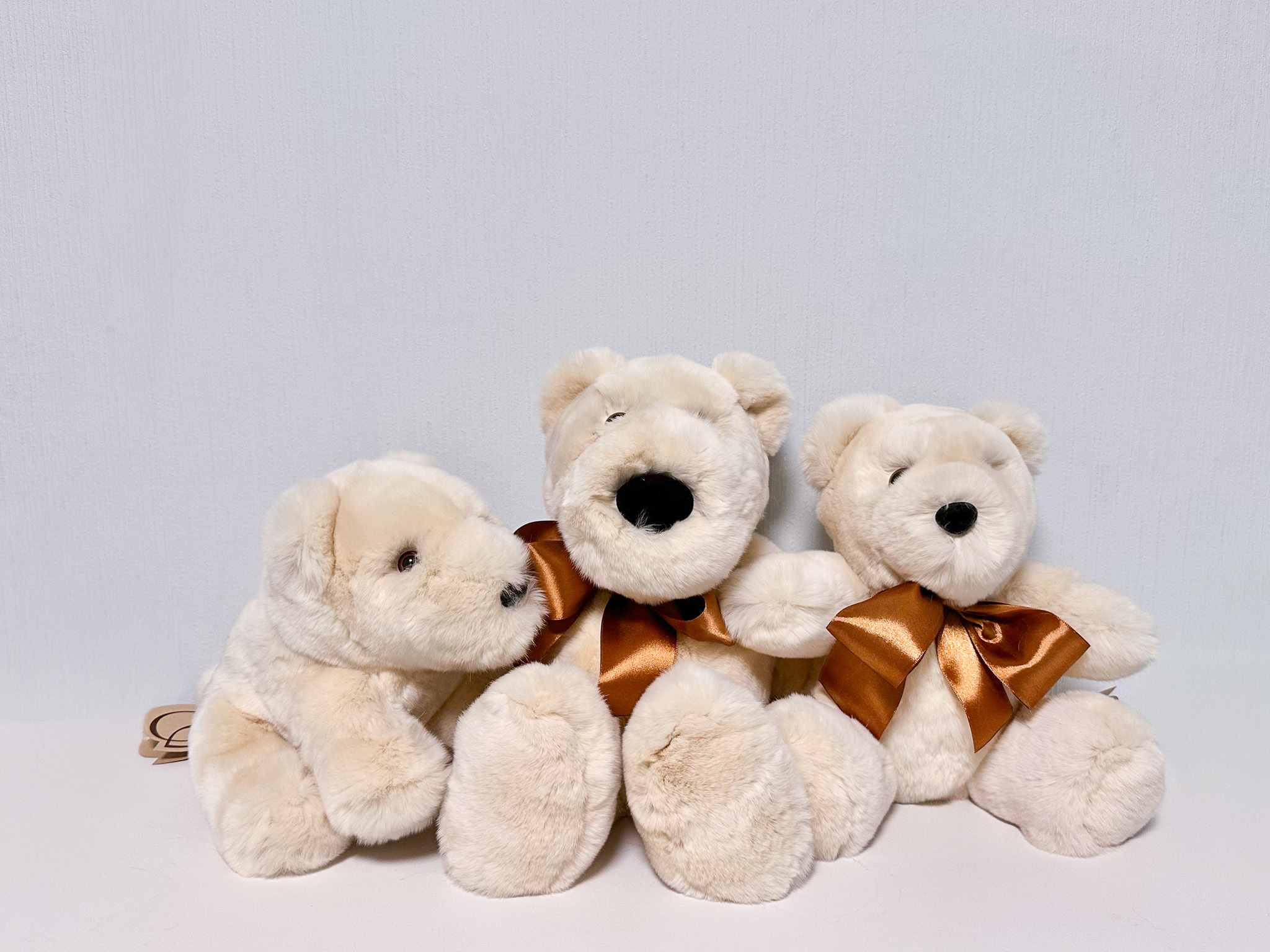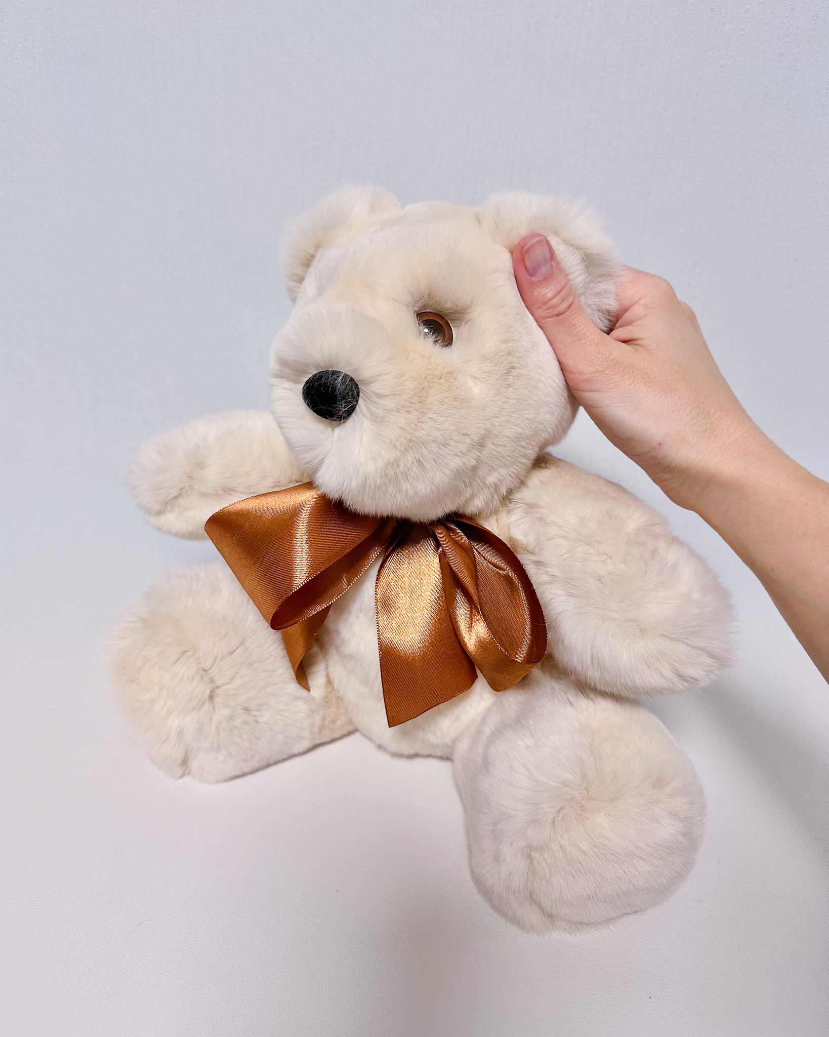 Медведь Ретро сделан из натурального меха кролик рекс нежного сливочно-кремового цвета и украшен декоративным атласным бантом, который при желании можно снять. Солидный размер идеален для обнимашек.