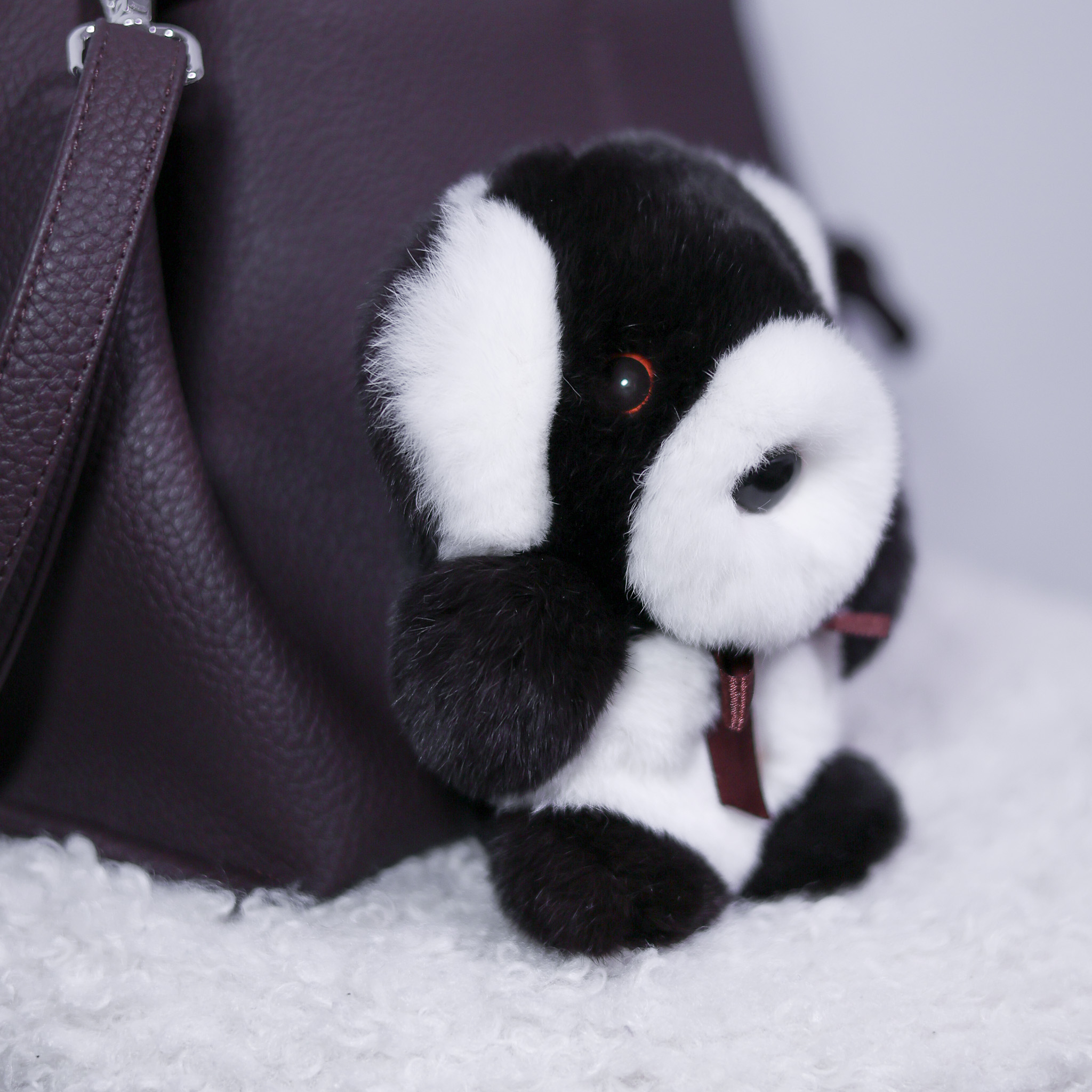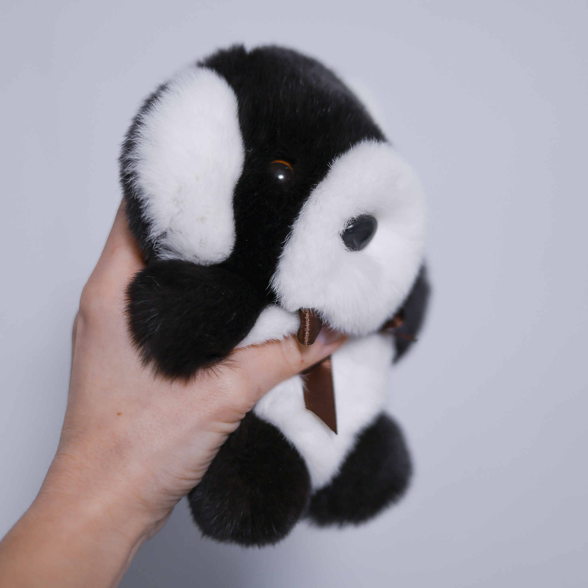 Игрушка сделана из рекса двух цветов — горький шоколад и белый — и снабжена металлическим карабином, что делает возможным ее использование в качестве брелока/обвеса на сумку. Карабин можно отстегнуть или срезать петельку, за которую он крепится.