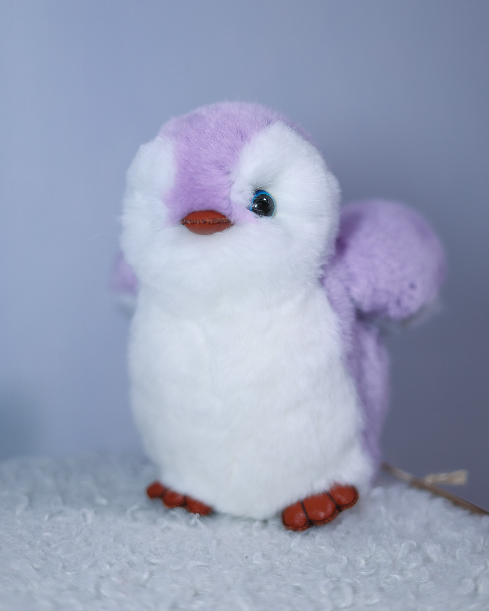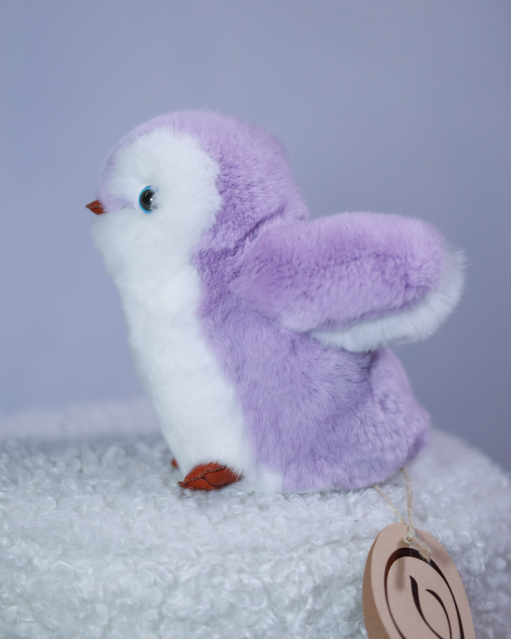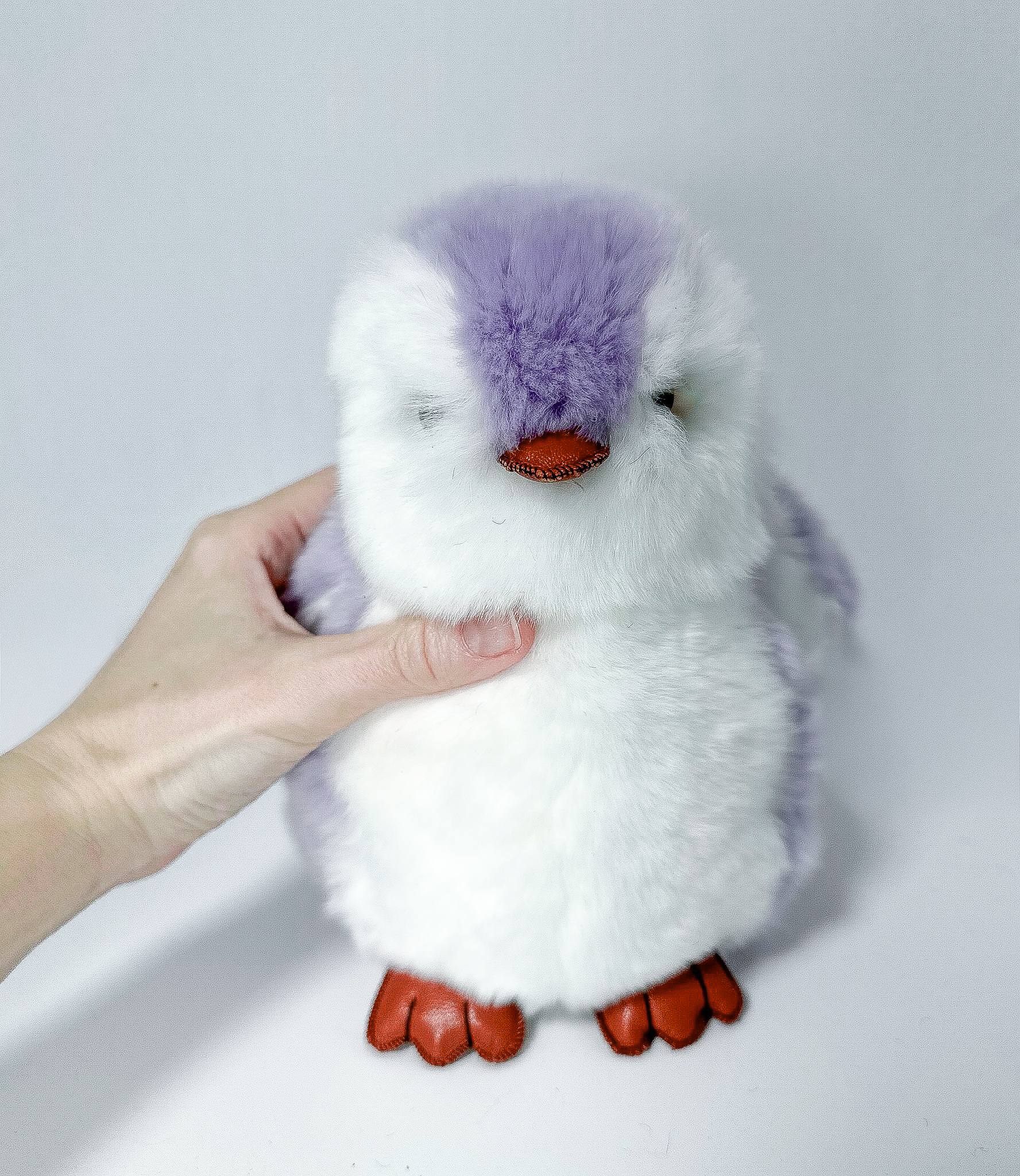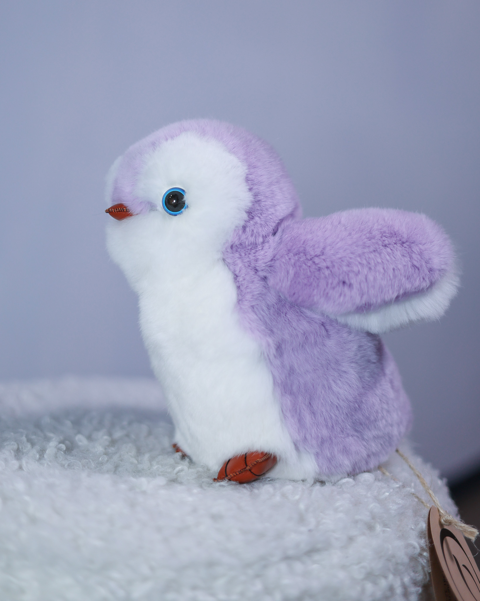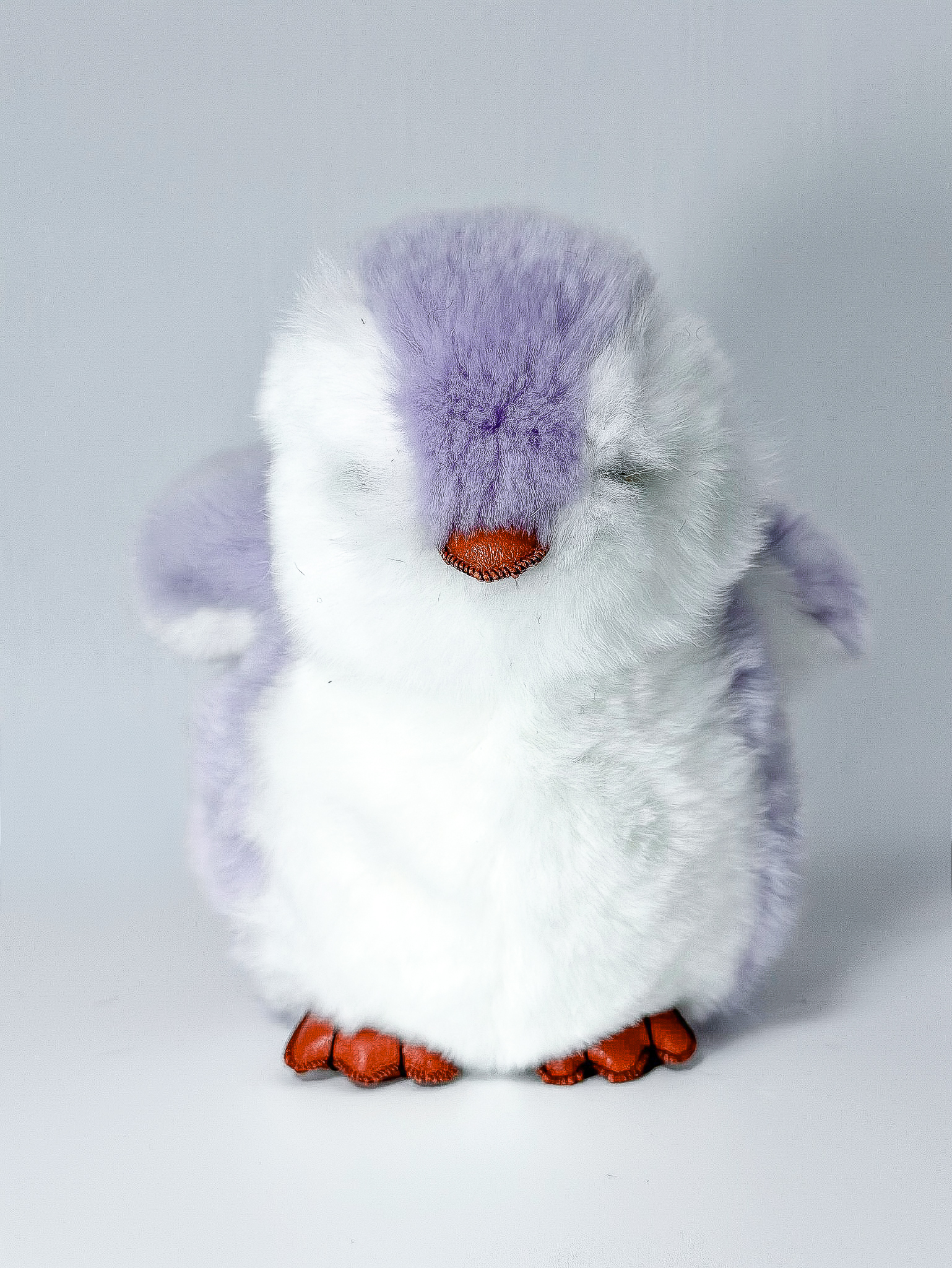 Пингвин Лоло сделан из натурального меха рекс (кролик) нежного сиреневого цвета с белыми вставками. Клюв и лапки выполнены из кожи.