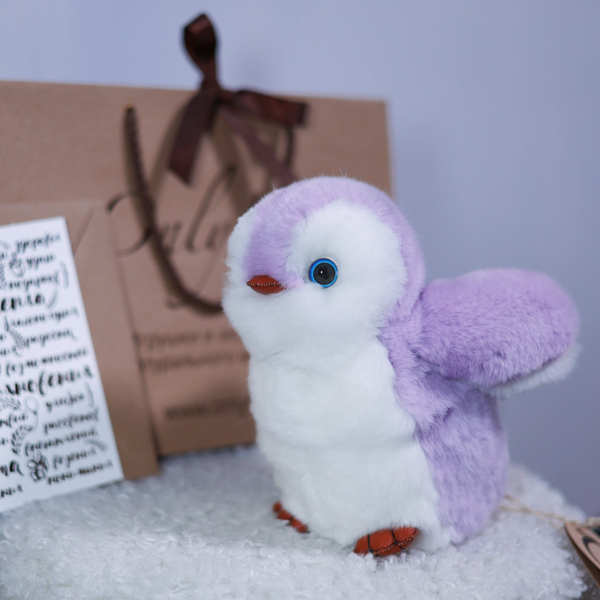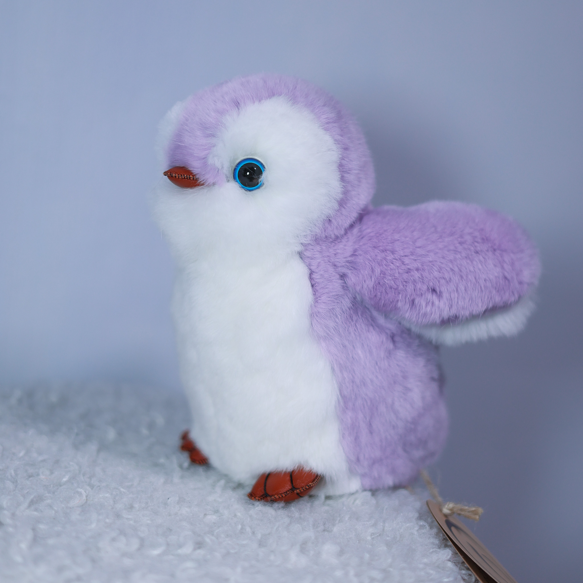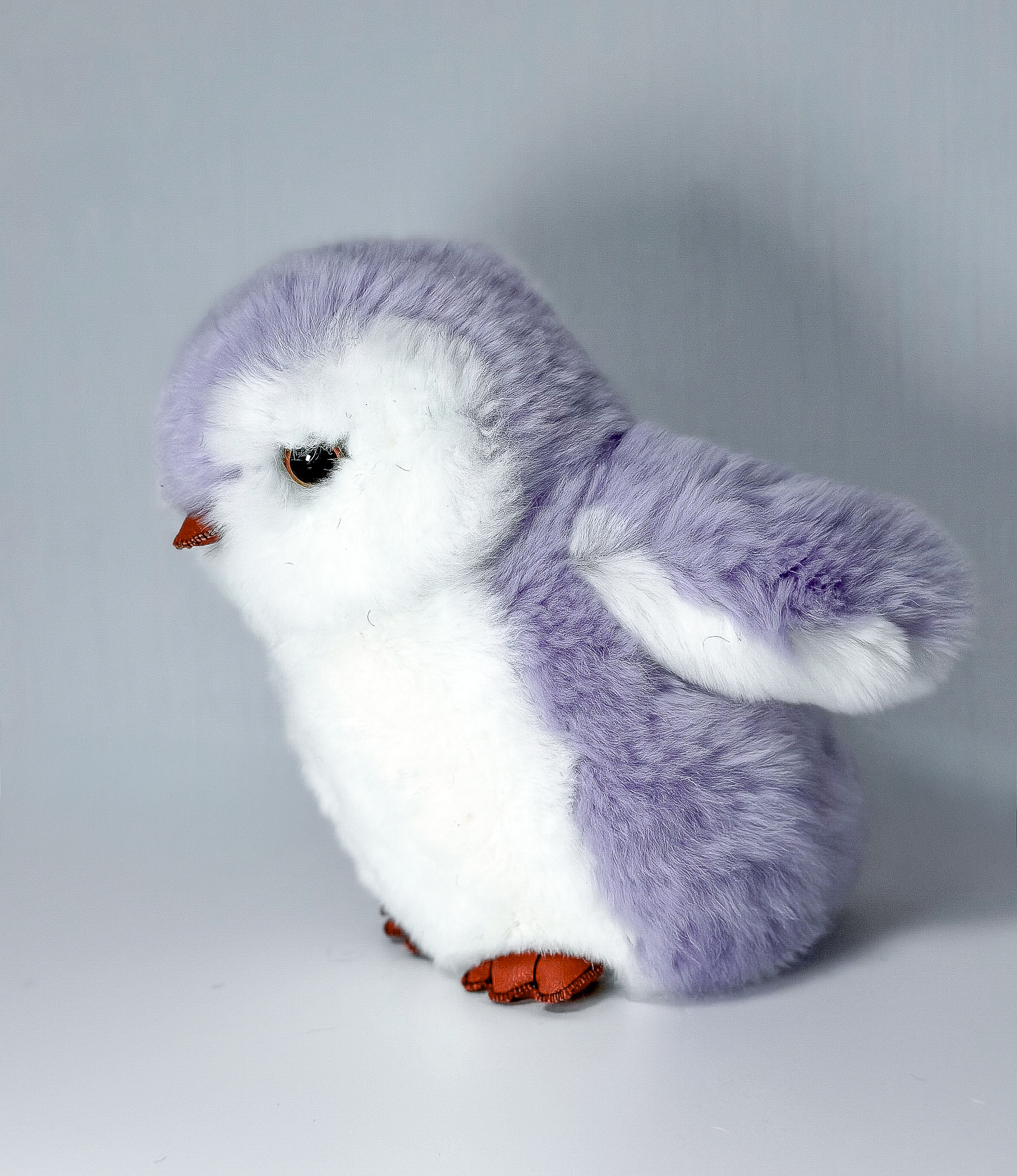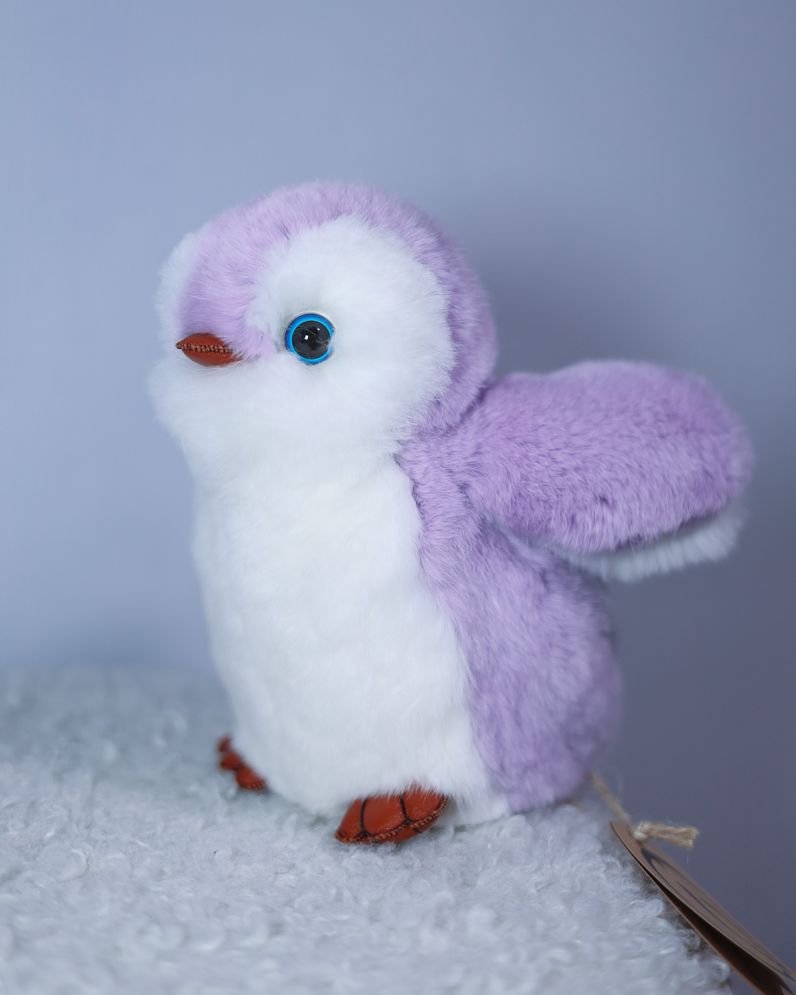 Пингвин Лоло сделан из натурального меха рекс (кролик) нежного сиреневого цвета с белыми вставками. Клюв и лапки выполнены из кожи.