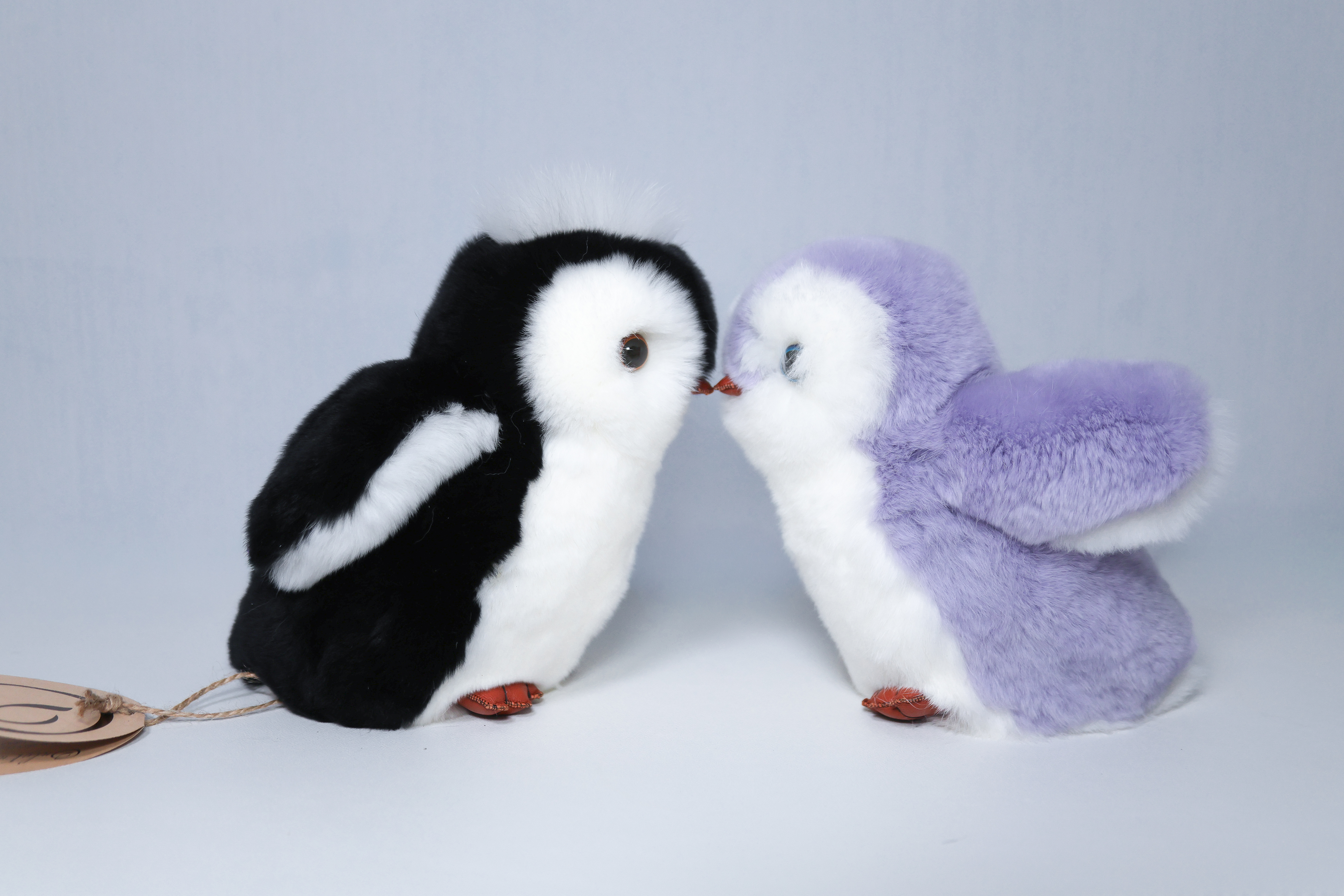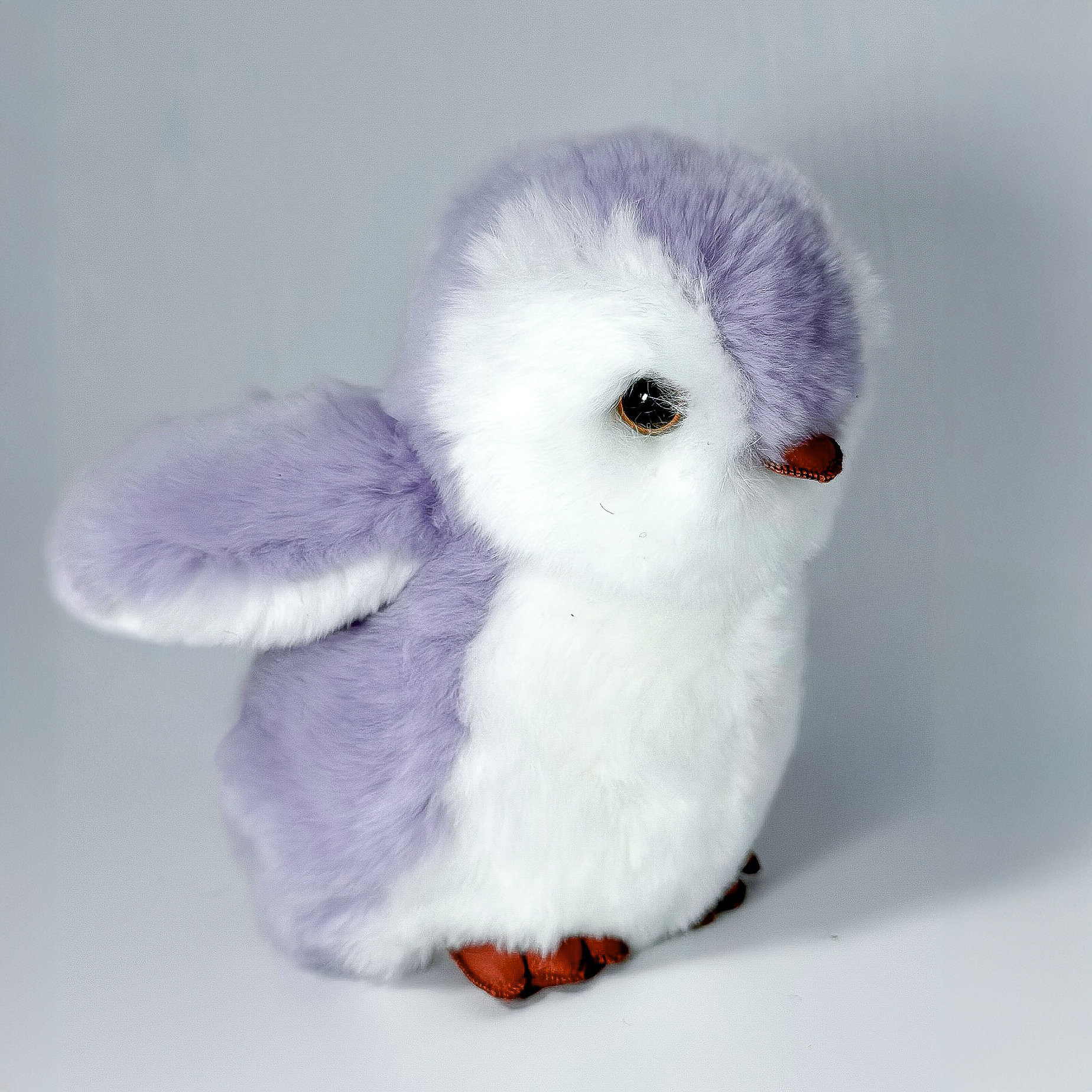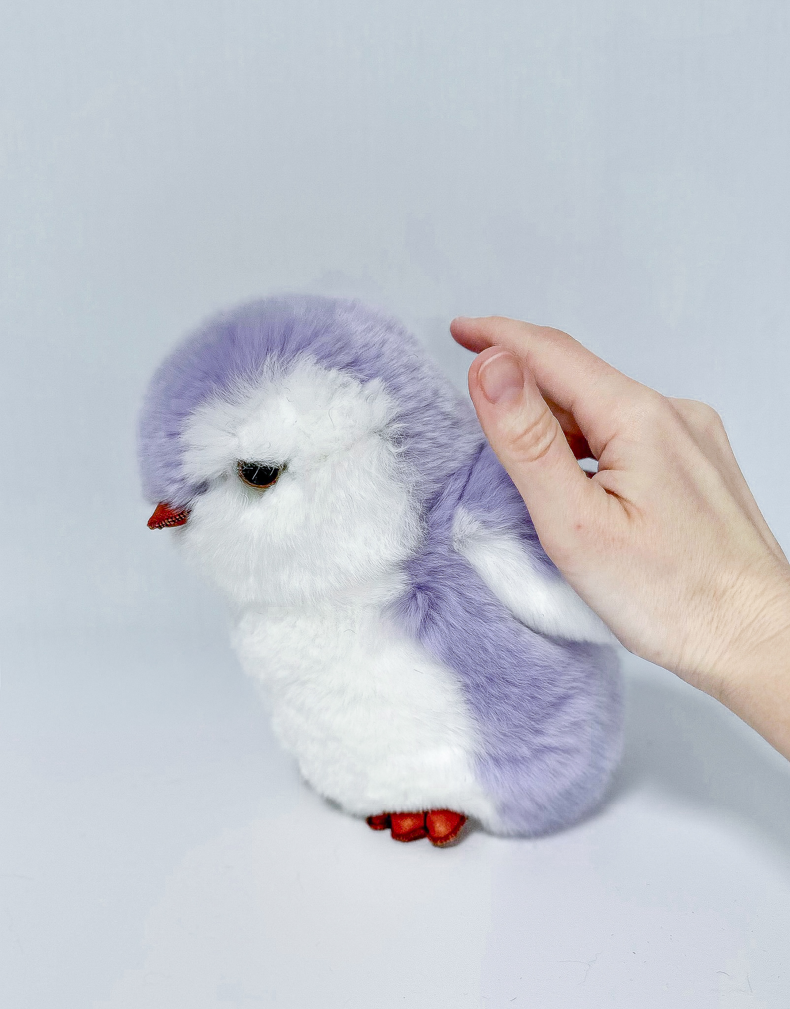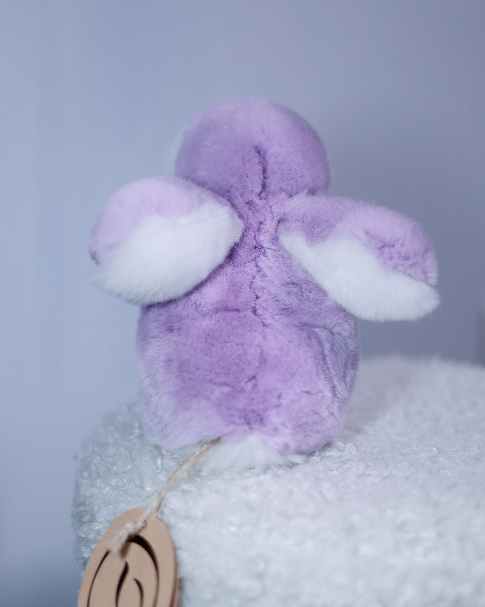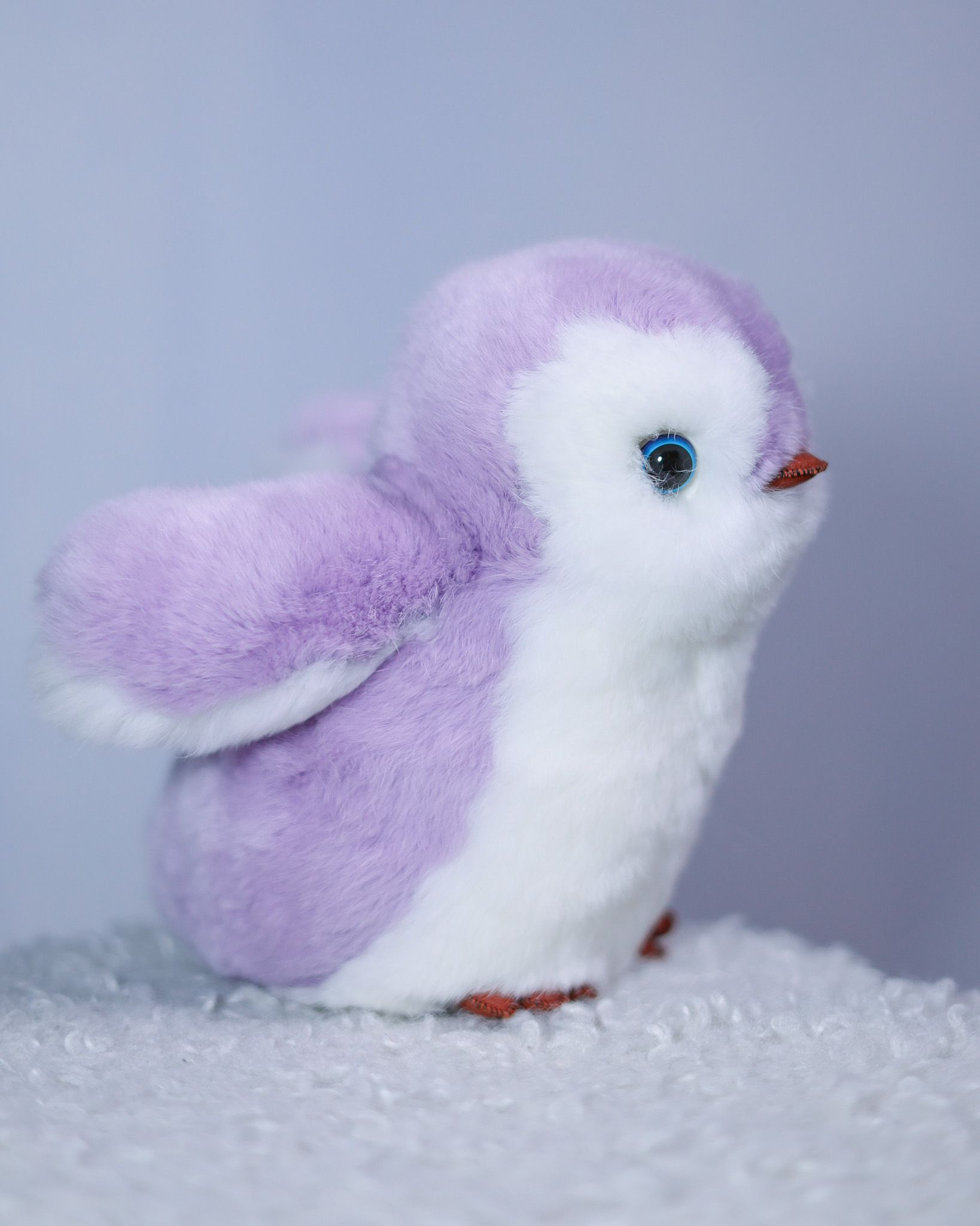 Пингвин Лоло сделан из натурального меха рекс (кролик) нежного сиреневого цвета с белыми вставками. Клюв и лапки выполнены из кожи.