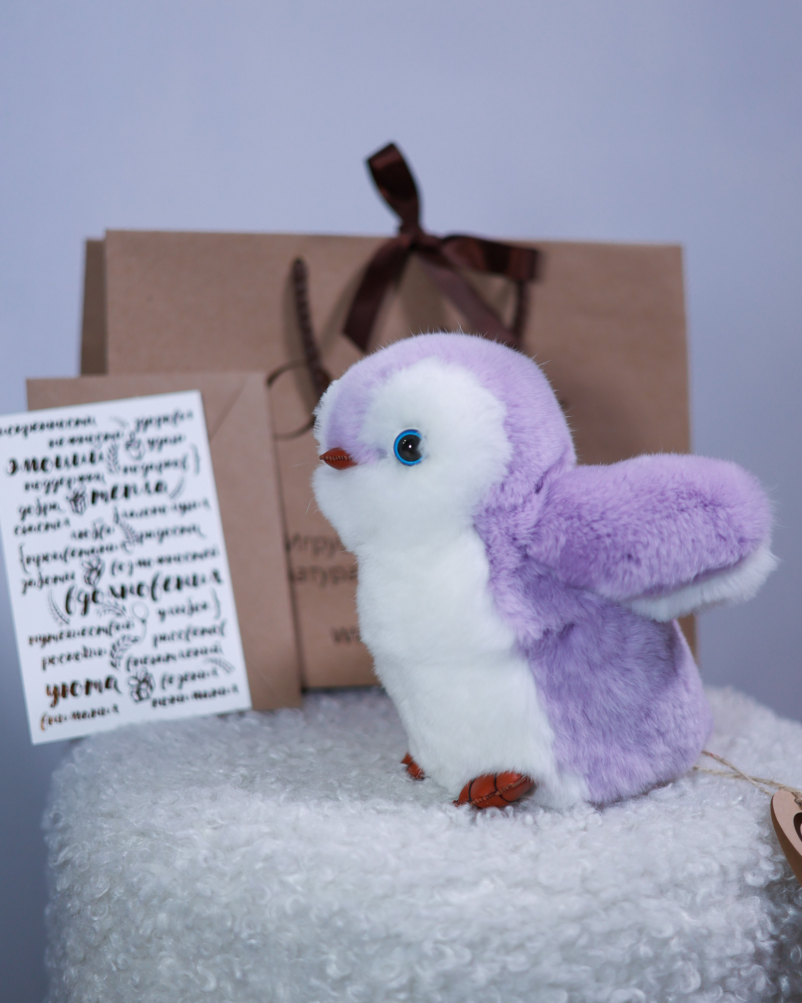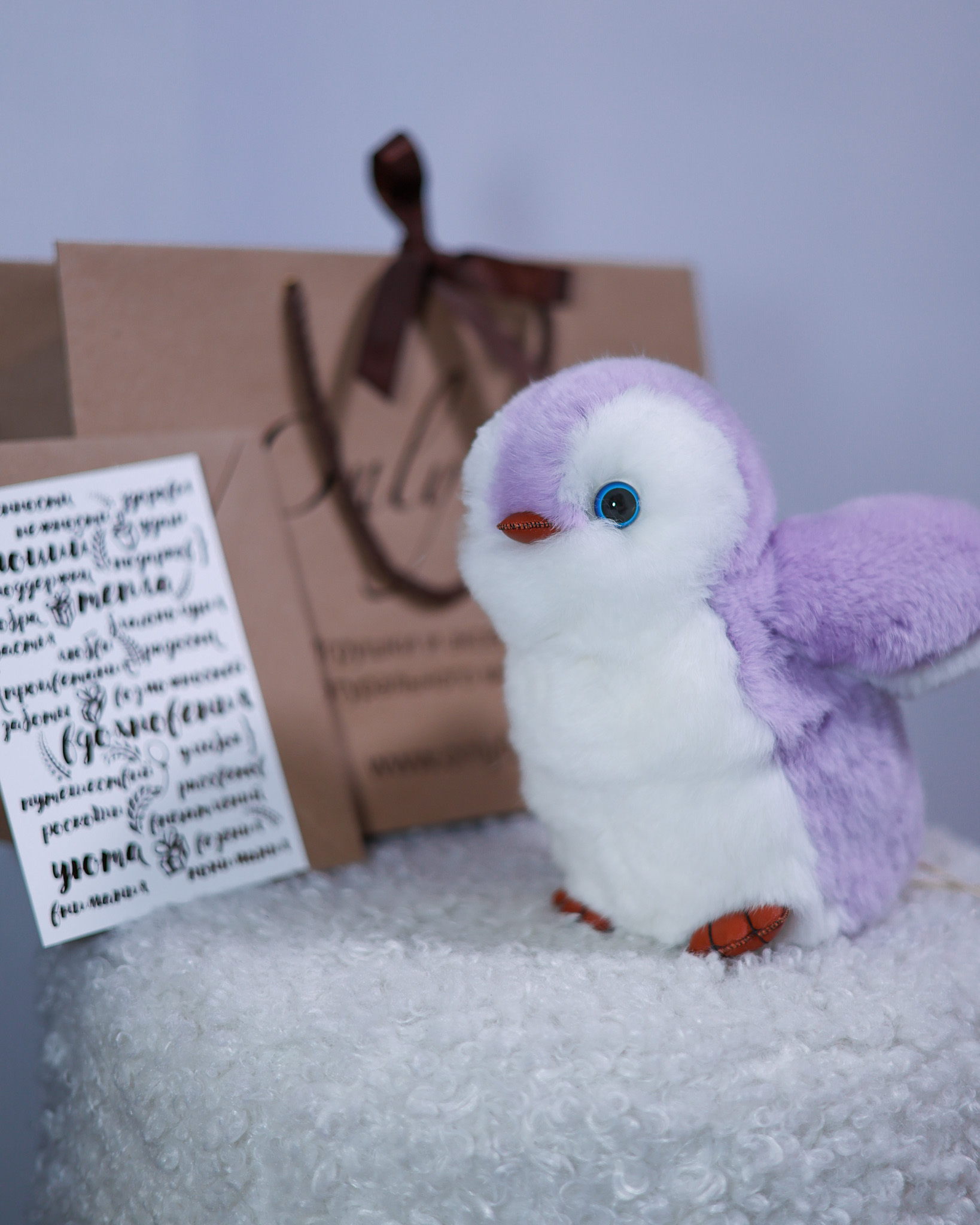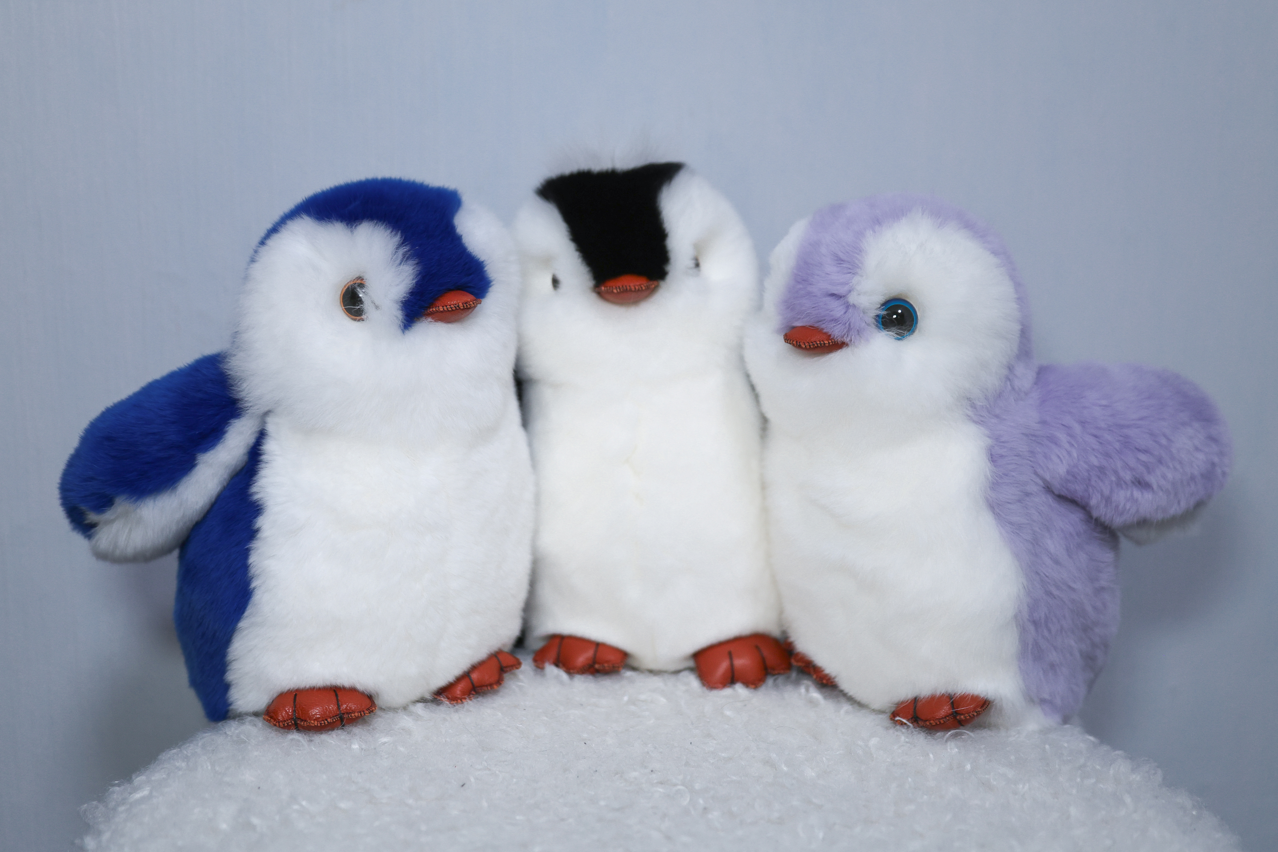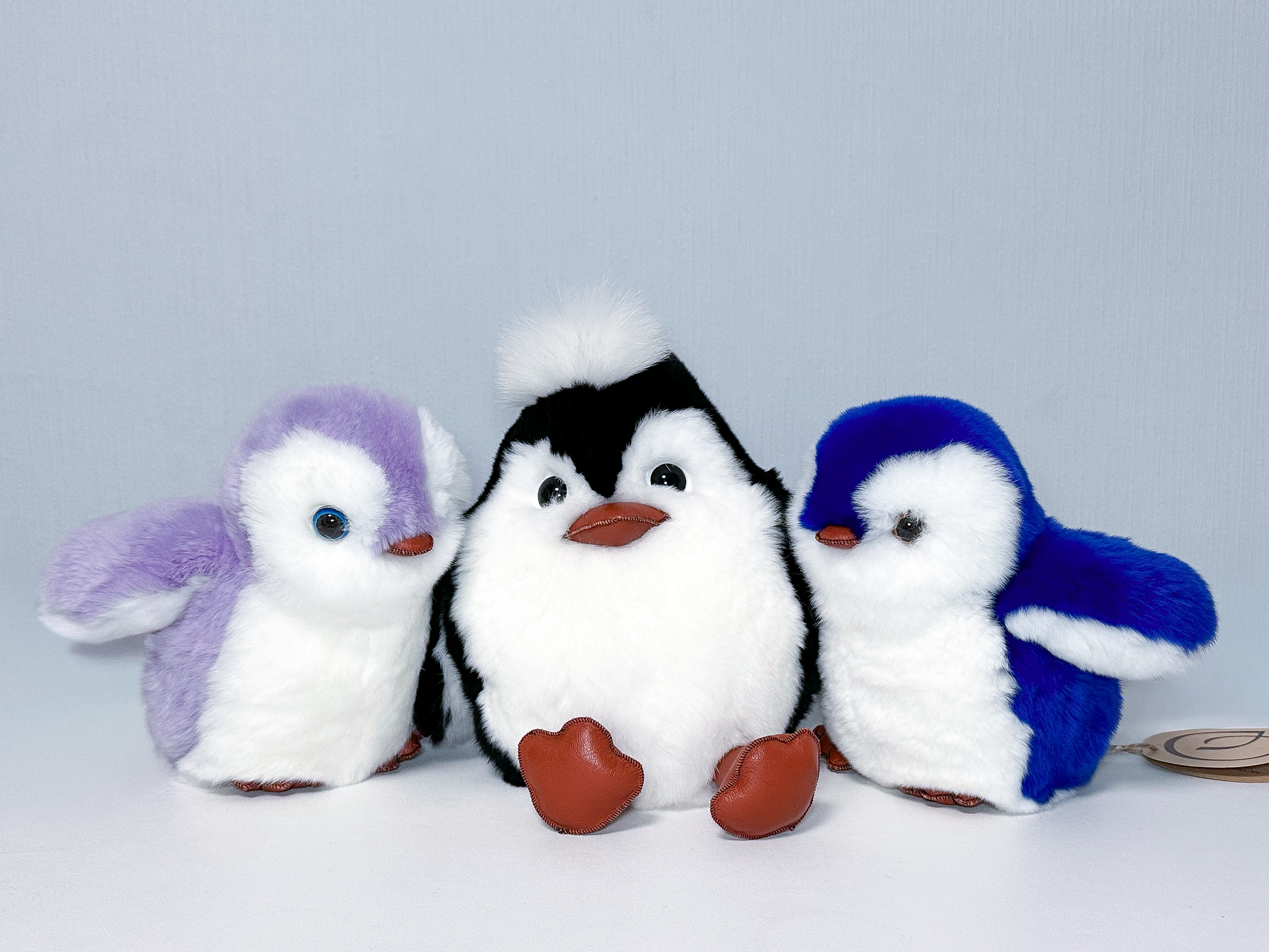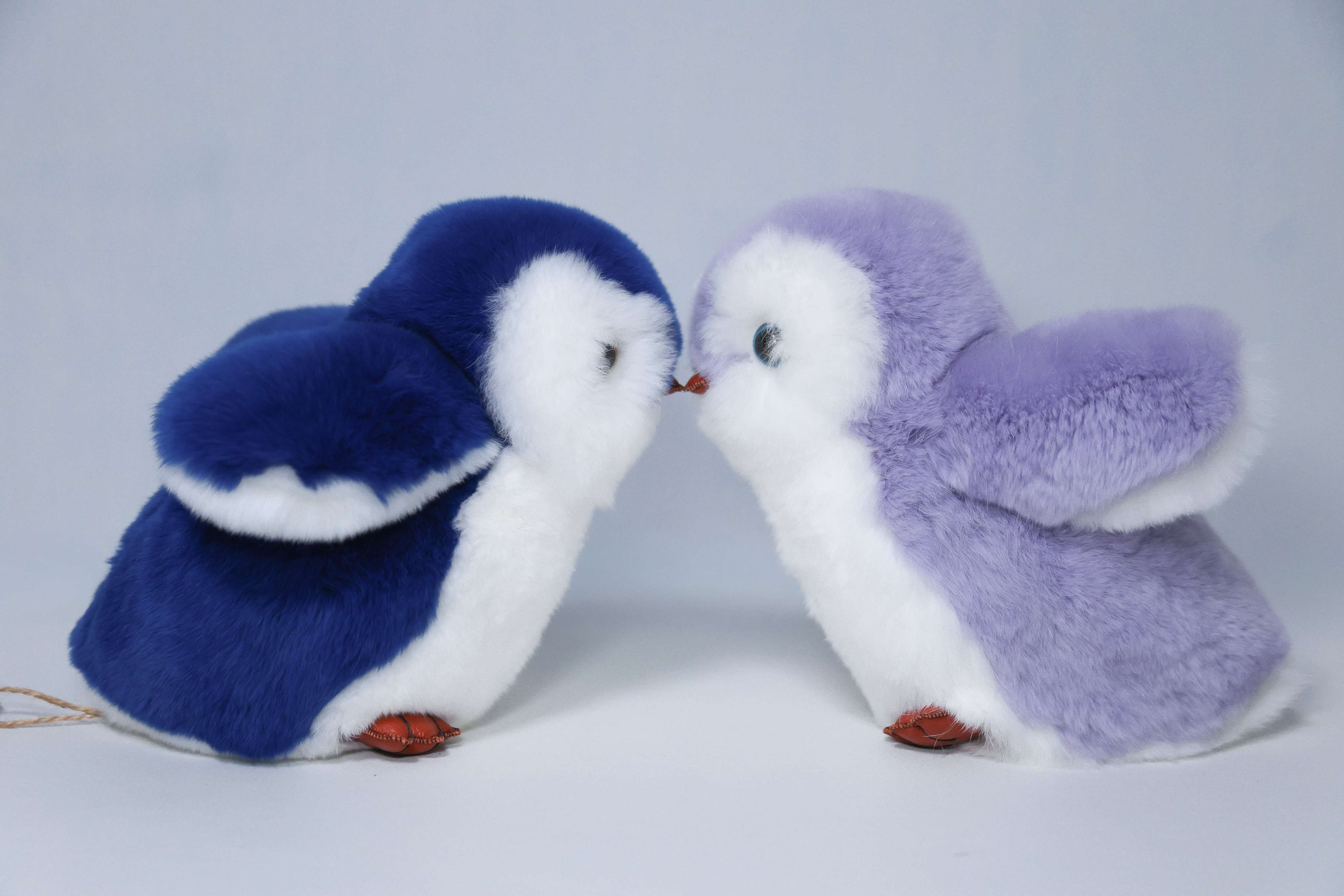 Пингвин Лоло сделан из натурального меха рекс (кролик) нежного сиреневого цвета с белыми вставками. Клюв и лапки выполнены из кожи.