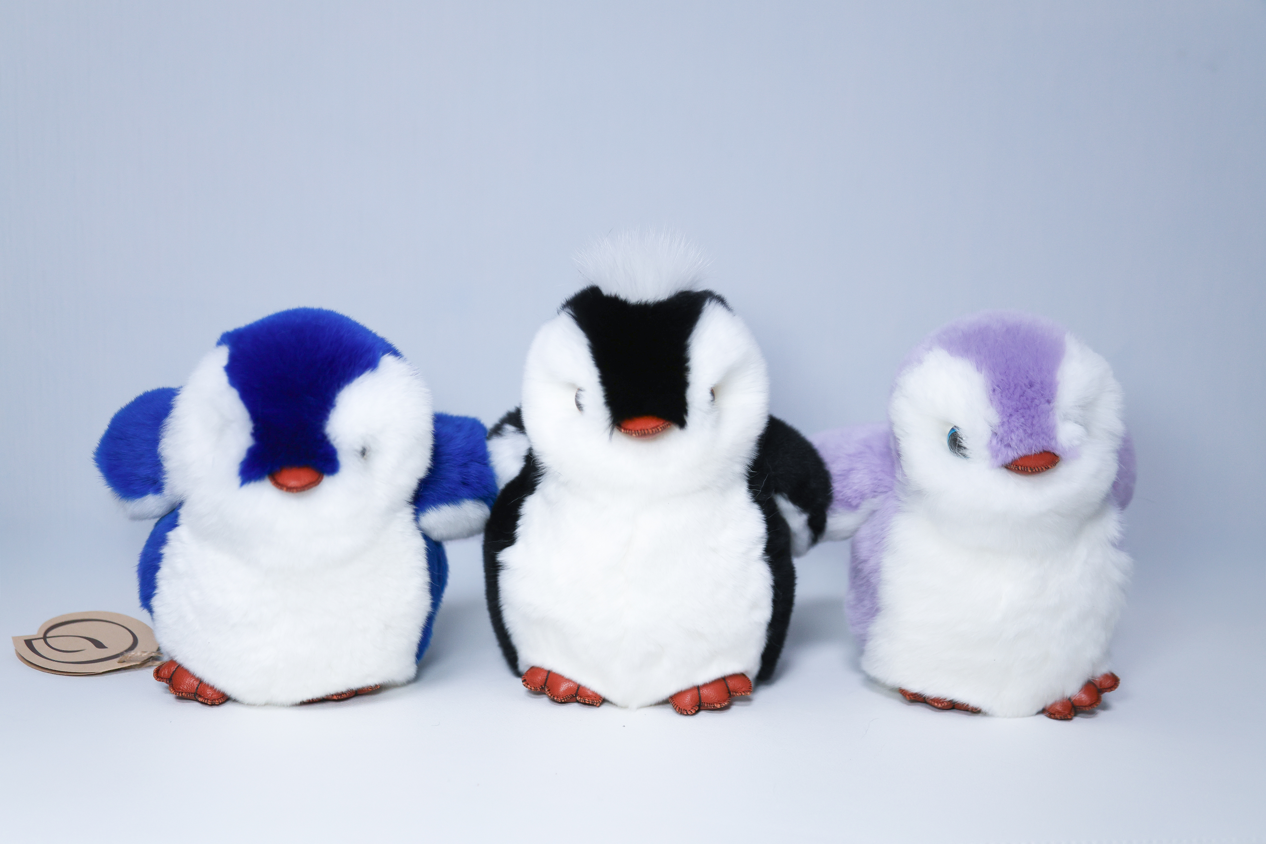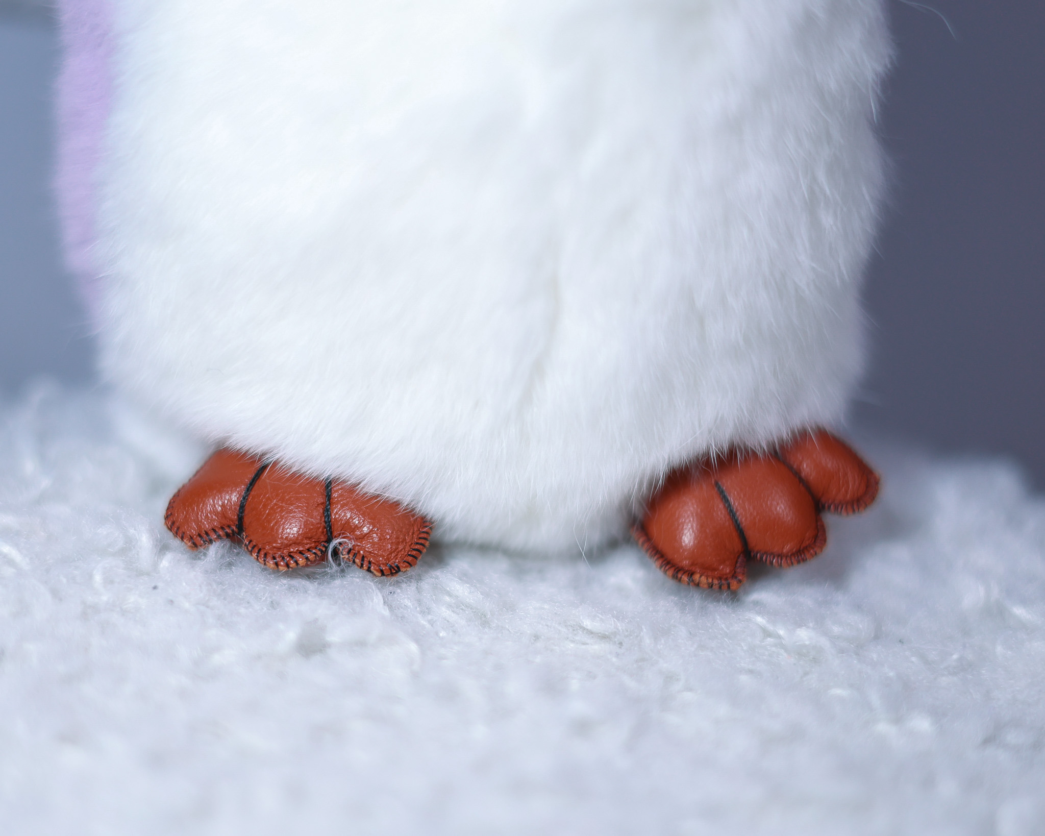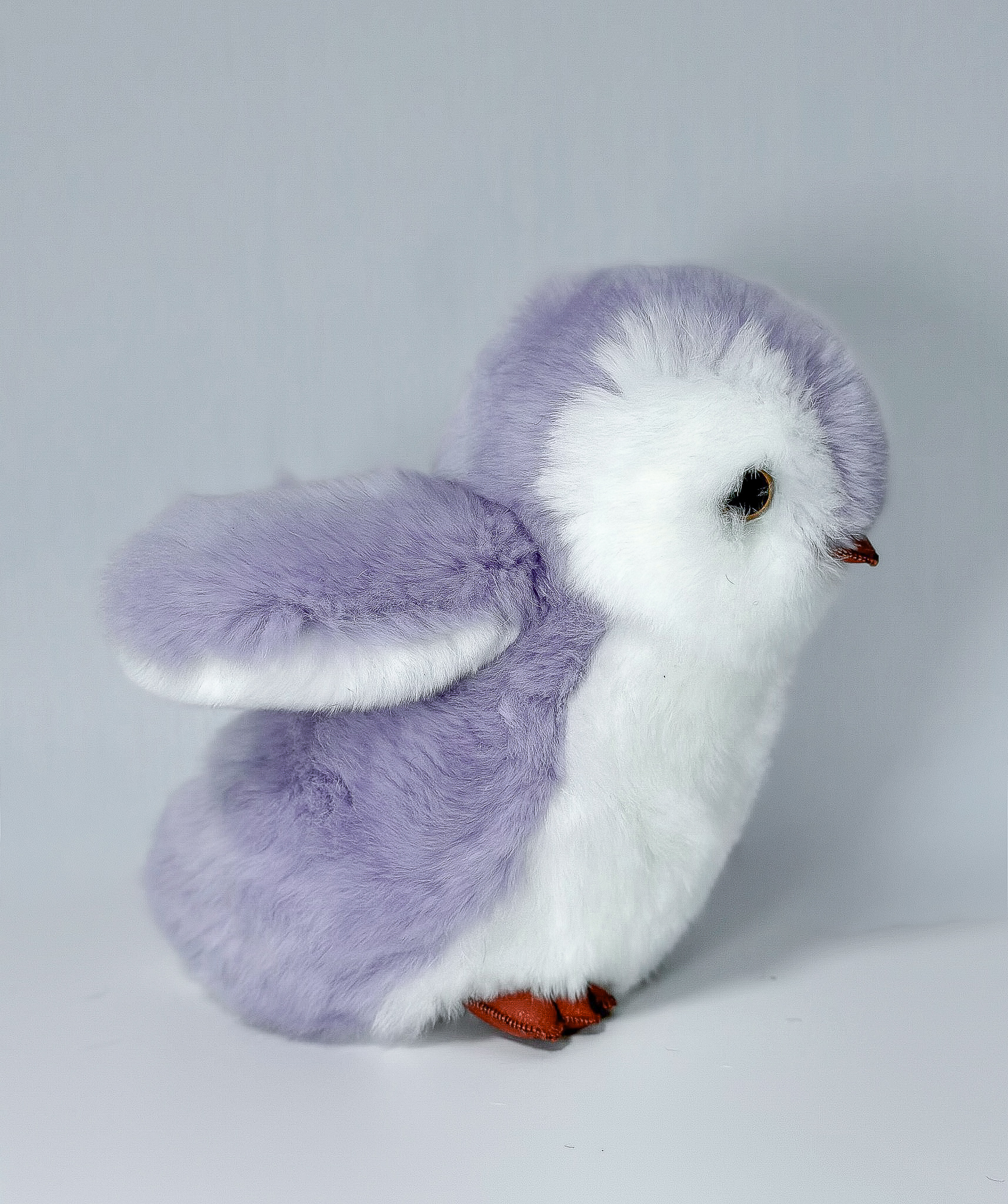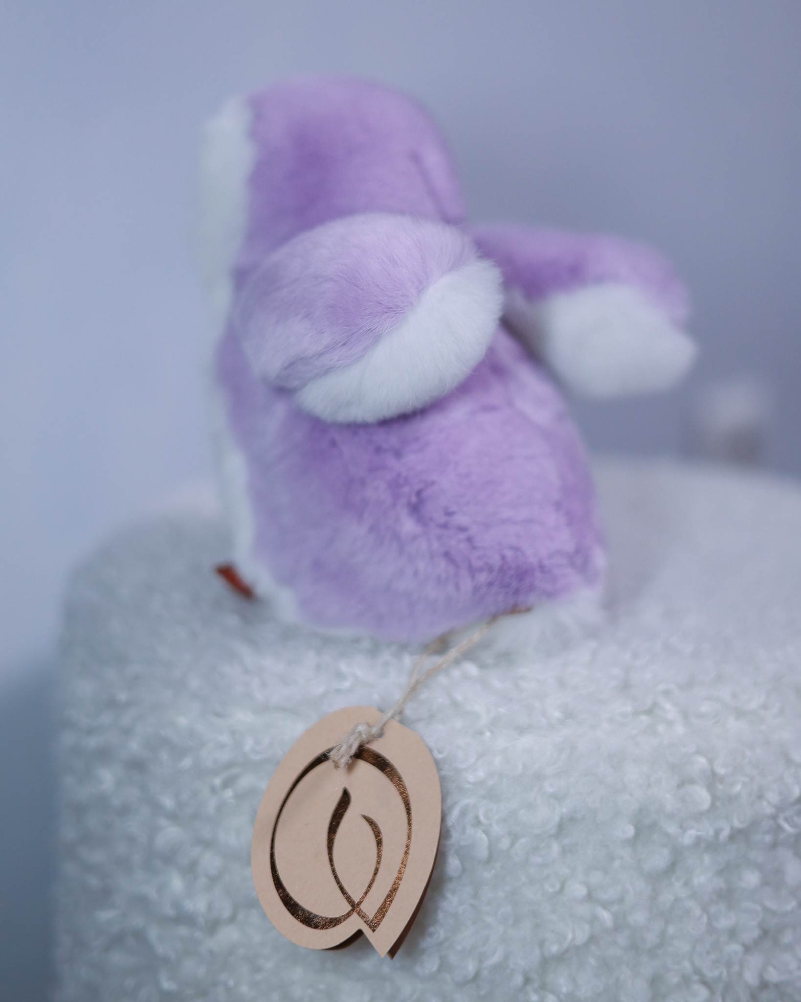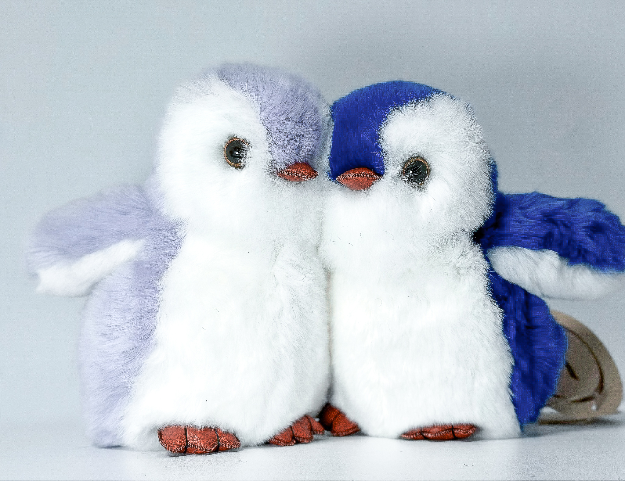 Пингвин Лоло сделан из натурального меха рекс (кролик) нежного сиреневого цвета с белыми вставками. Клюв и лапки выполнены из кожи.