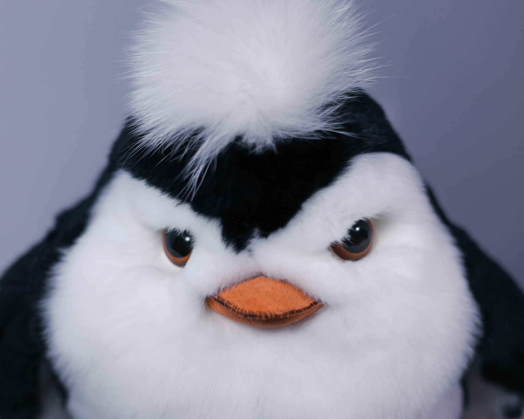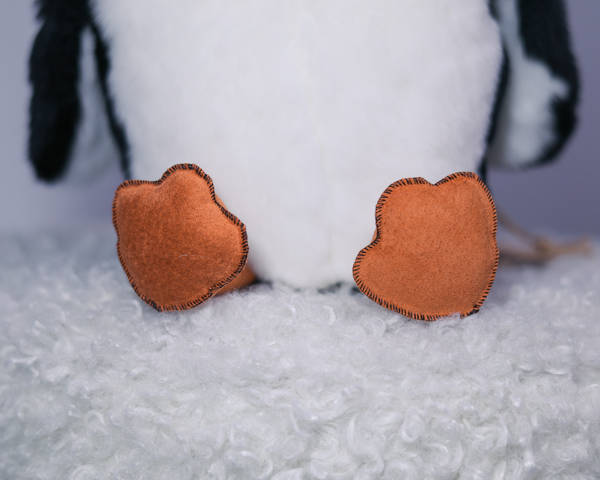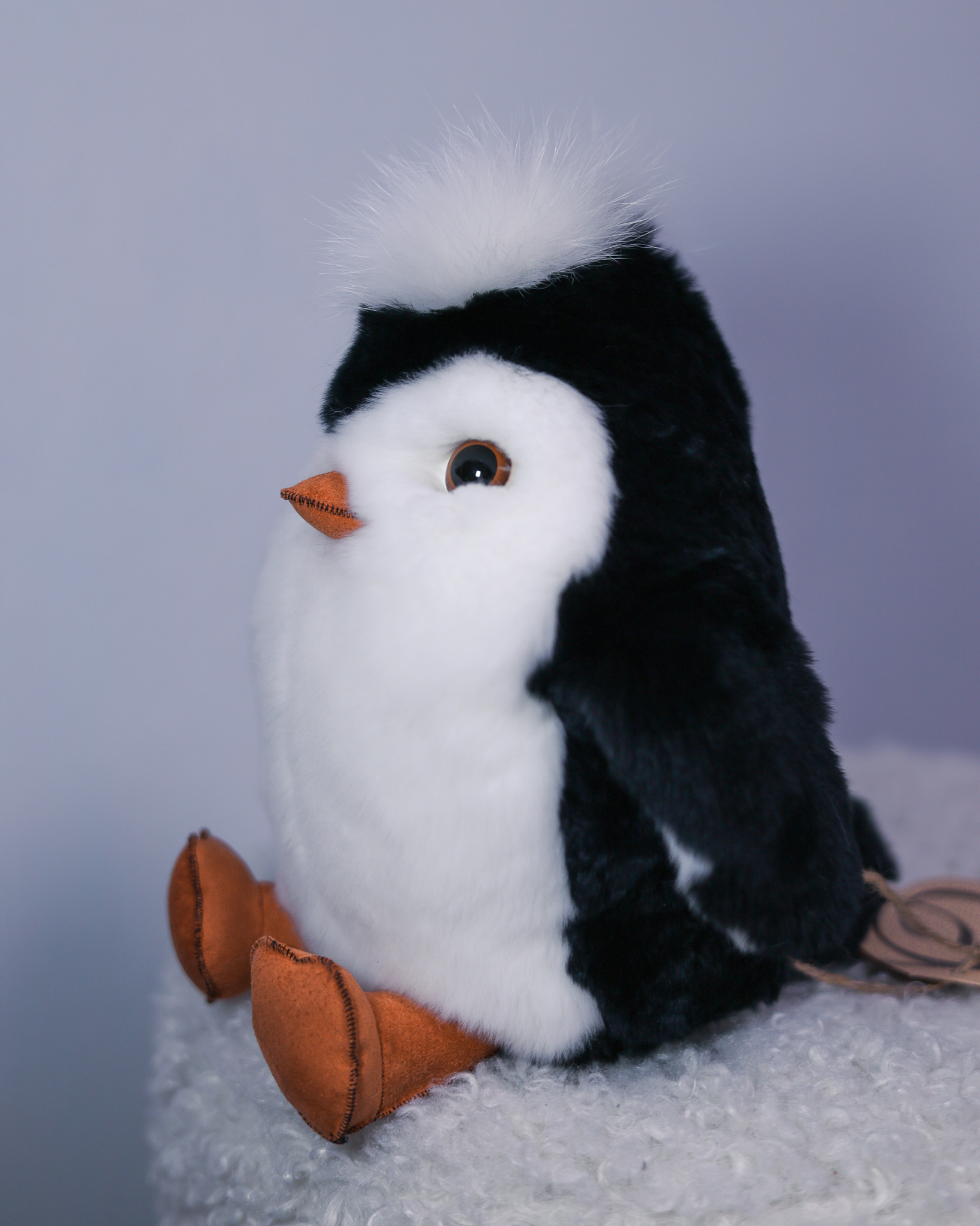Пингвин Пин сделан из натурального меха кролик рекс черного и белого цвета. Клюв и лапки выполнены из кожи или замши с прошивкой с внешней стороны. Хохолок — из белого меха песца.