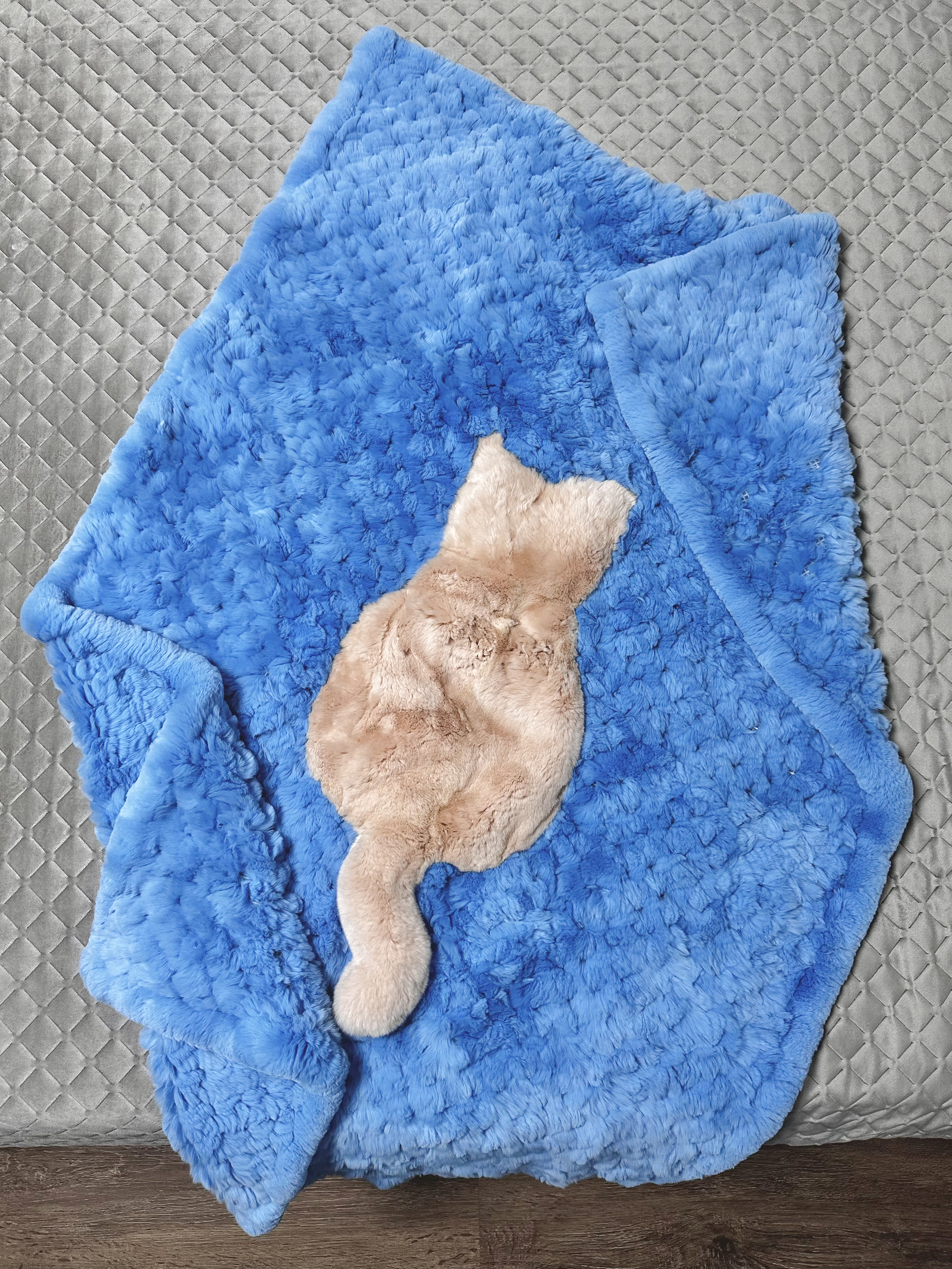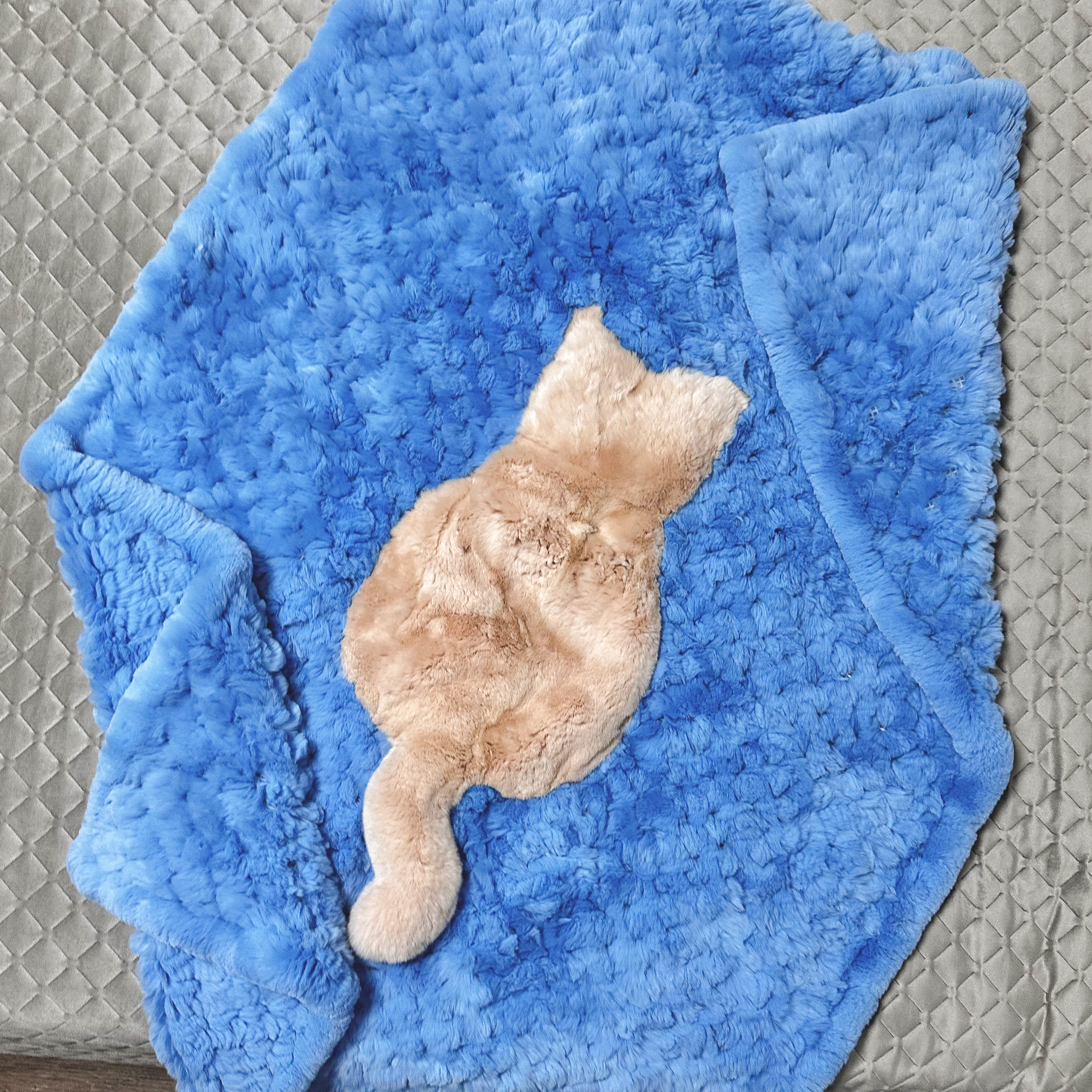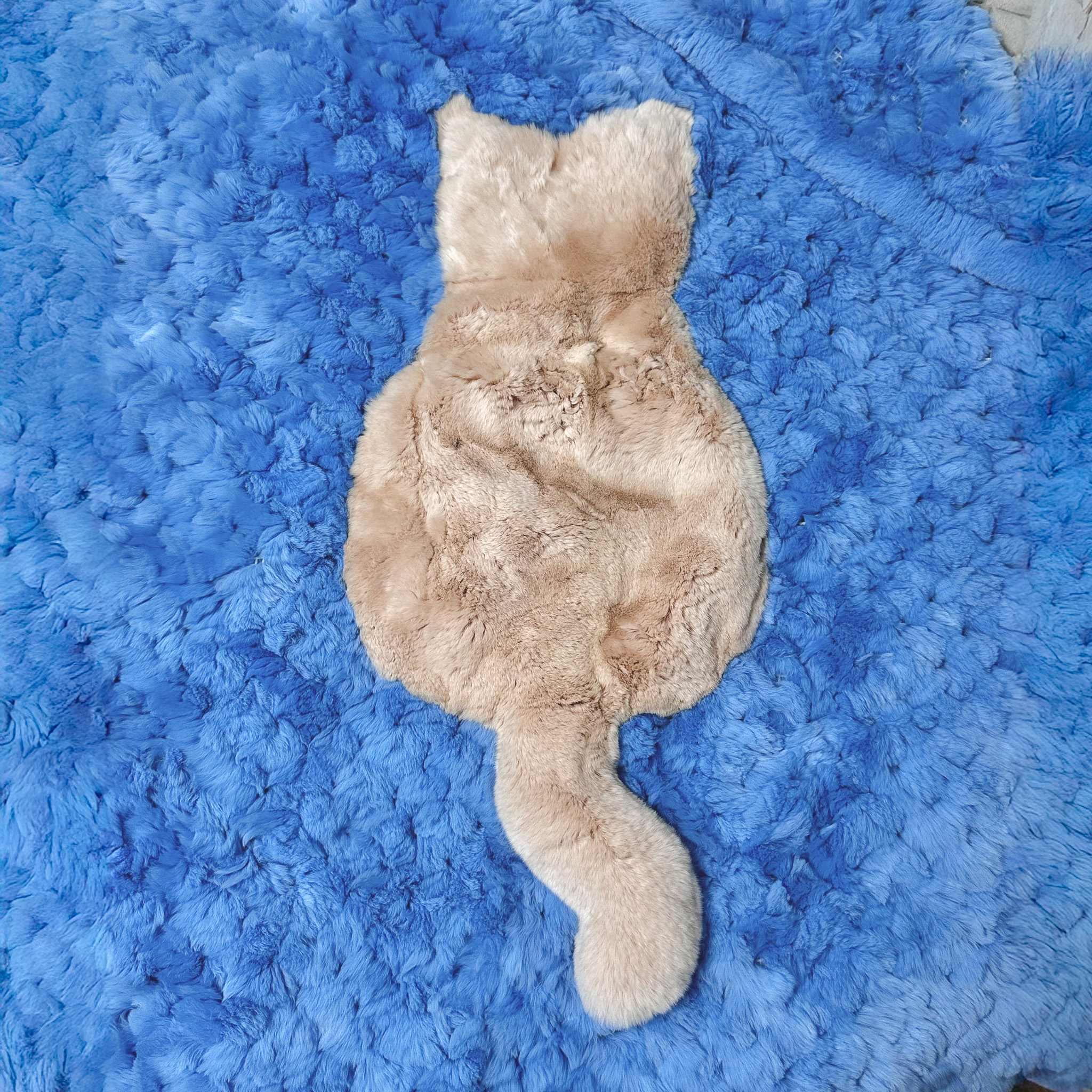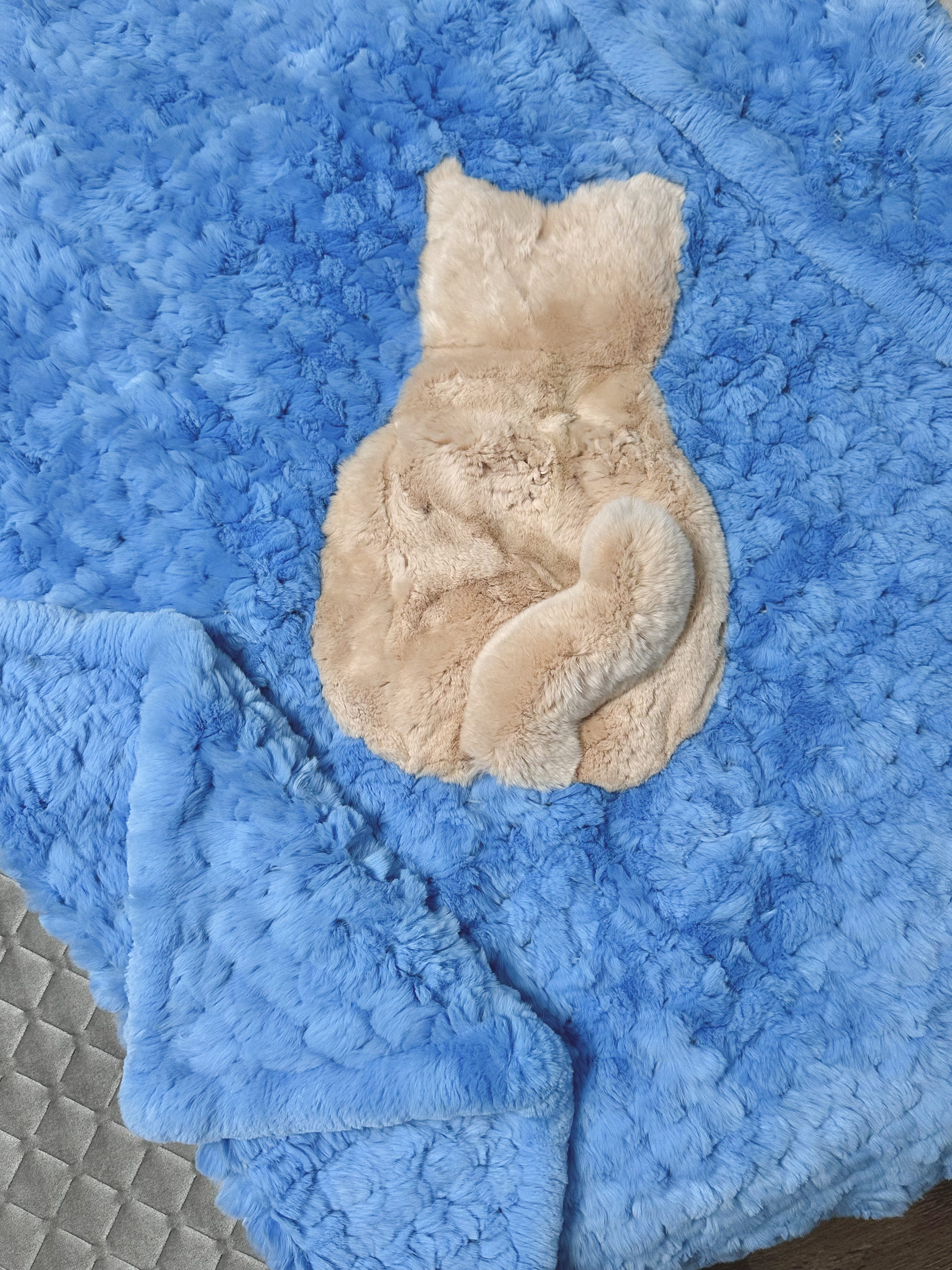 Полотно пледа сделано из нежнейшего "вязаного" меха кролик рекс голубого цвета и украшено пришивной аппликацией из цельного меха рекс в форме котика с объемным хвостиком. Основа из "вязаного" меха делает плед пышным, воздушным и более легким по весу, а также позволяет наслаждаться нежнейшим мехом с обеих сторон!