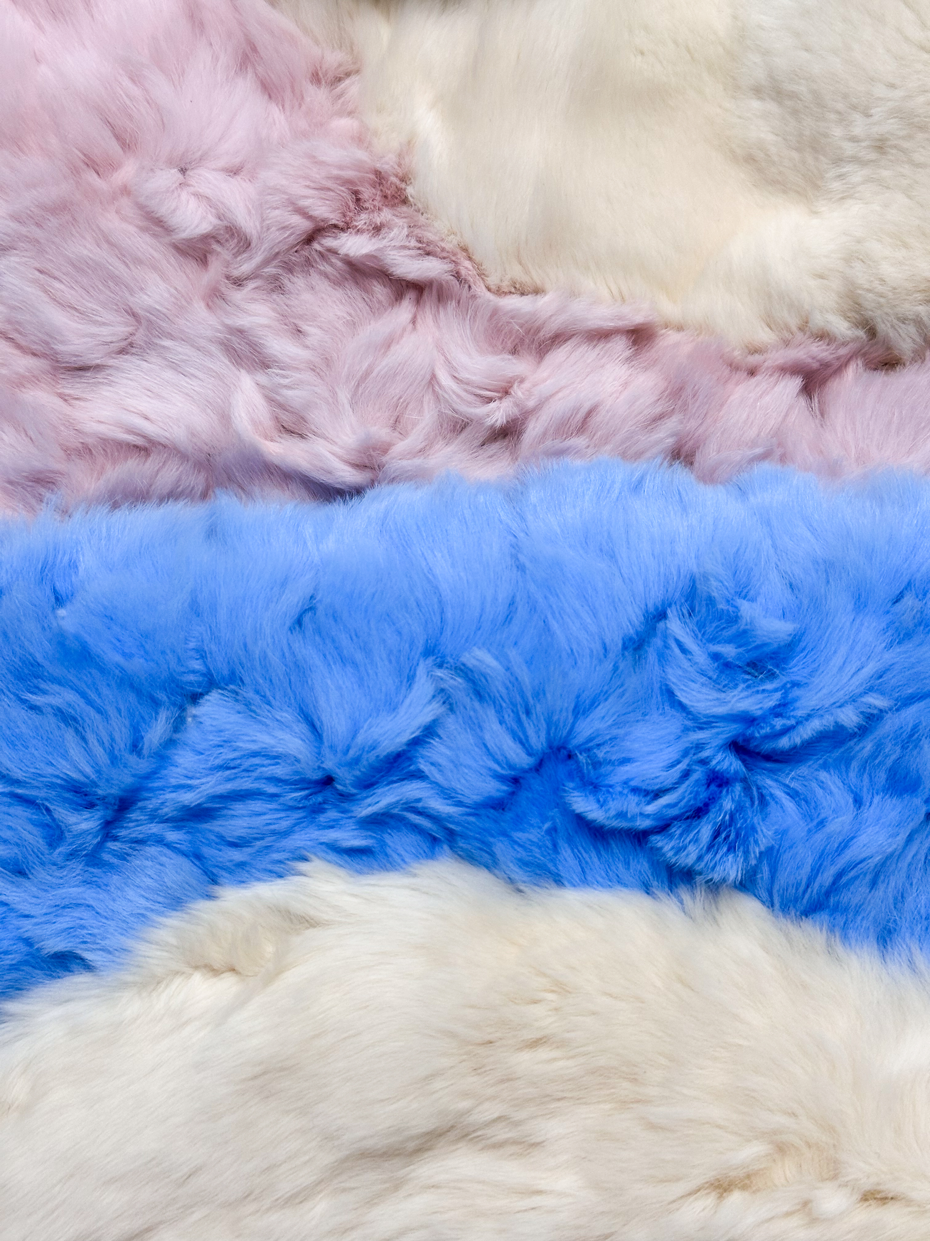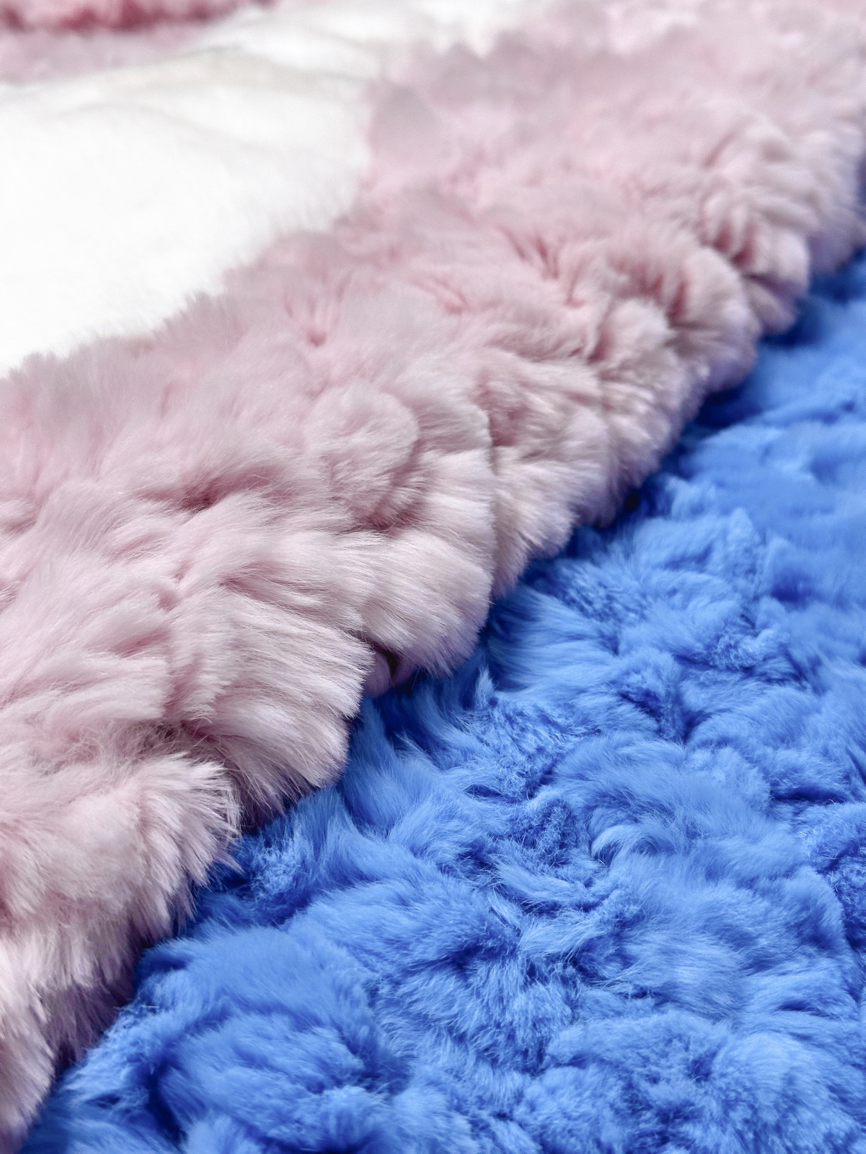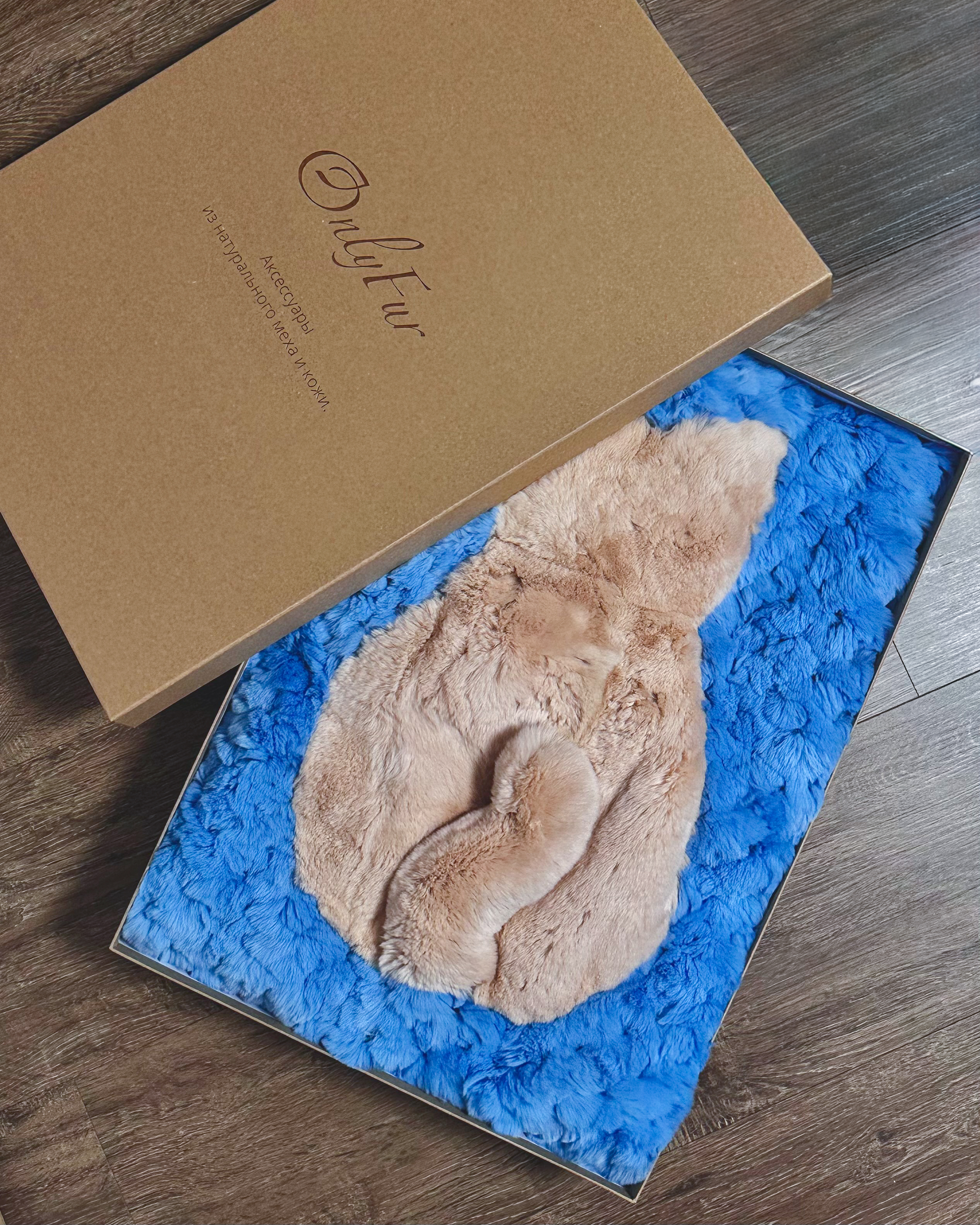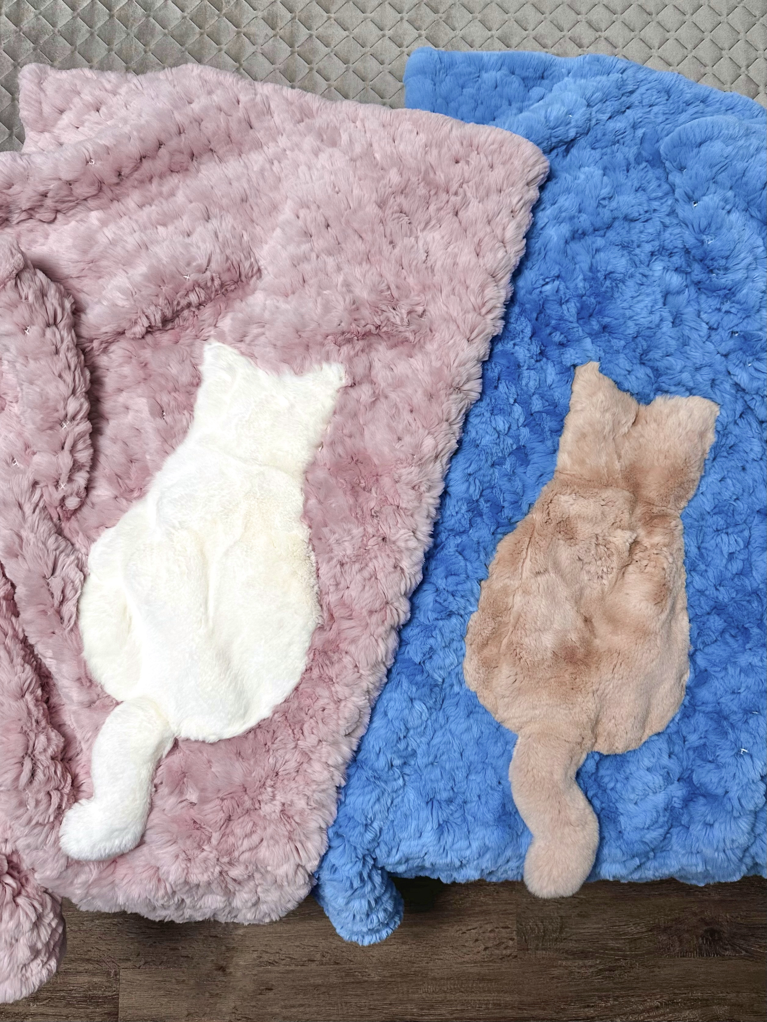 Полотно пледа сделано из нежнейшего "вязаного" меха кролик рекс голубого цвета и украшено пришивной аппликацией из цельного меха рекс в форме котика с объемным хвостиком. Основа из "вязаного" меха делает плед пышным, воздушным и более легким по весу, а также позволяет наслаждаться нежнейшим мехом с обеих сторон!