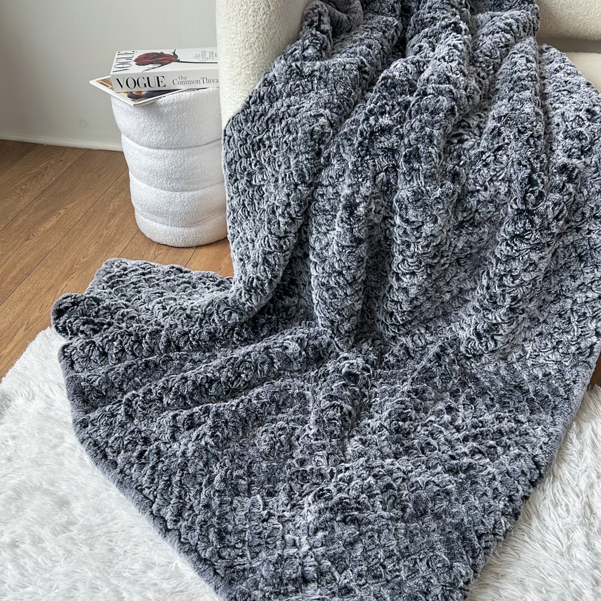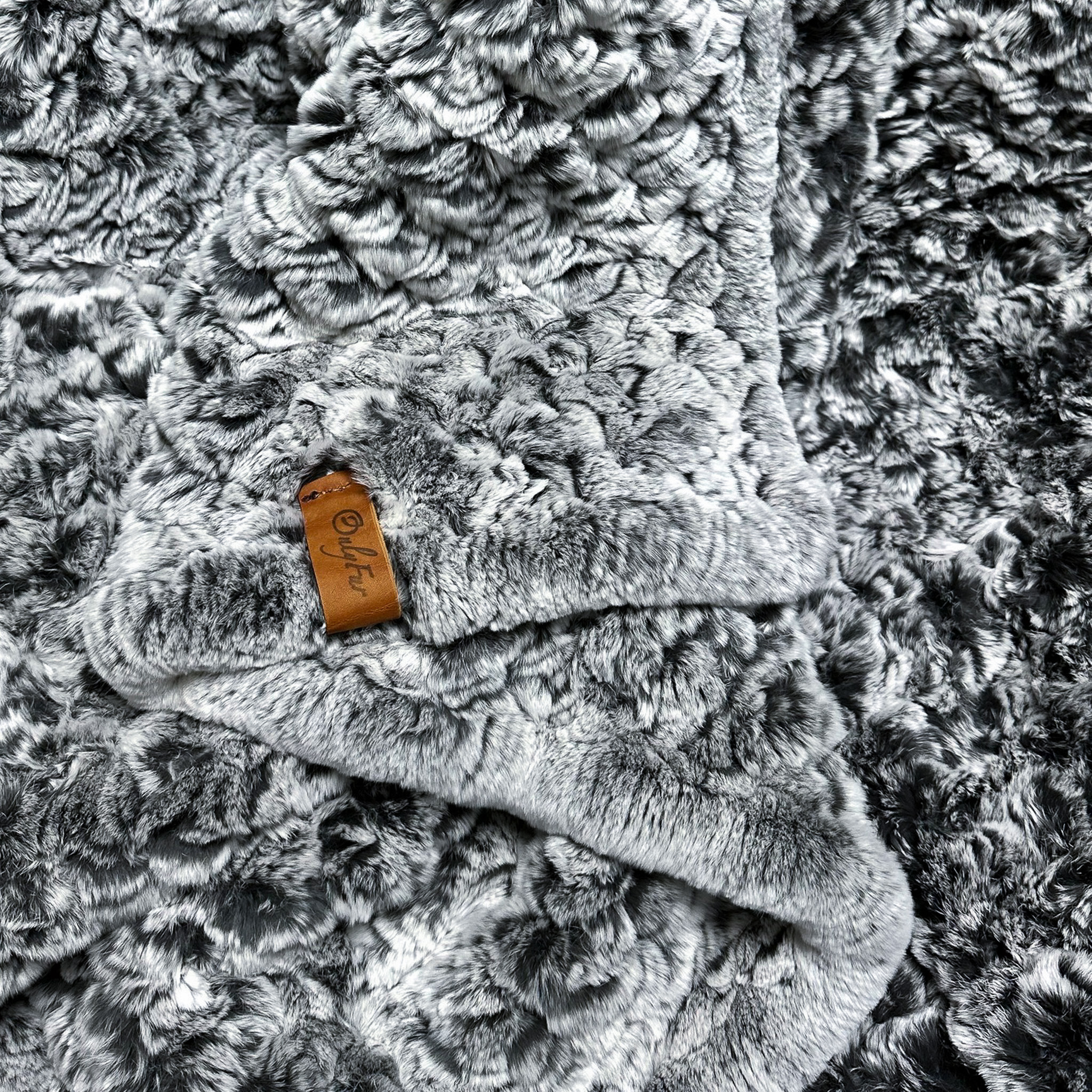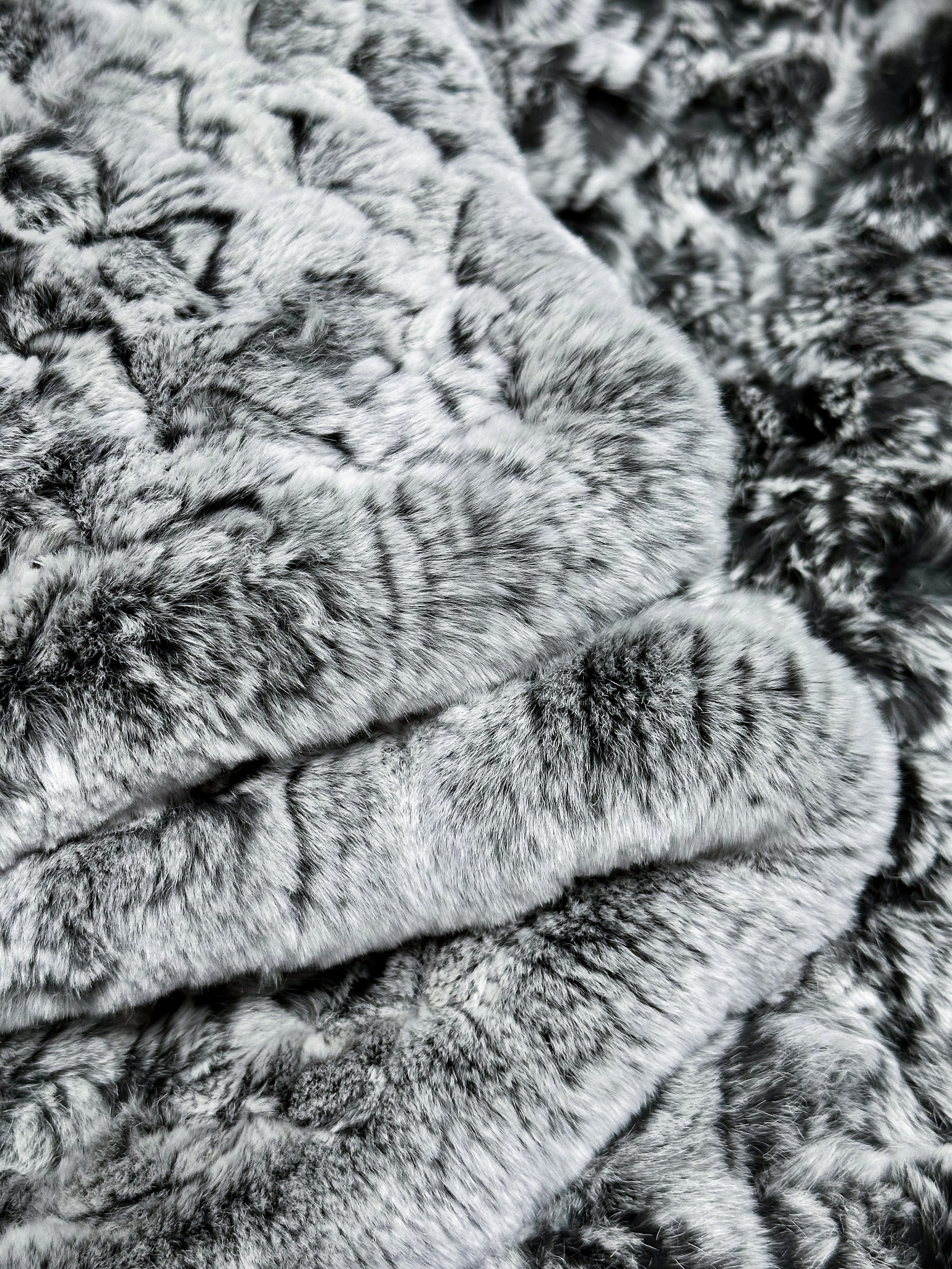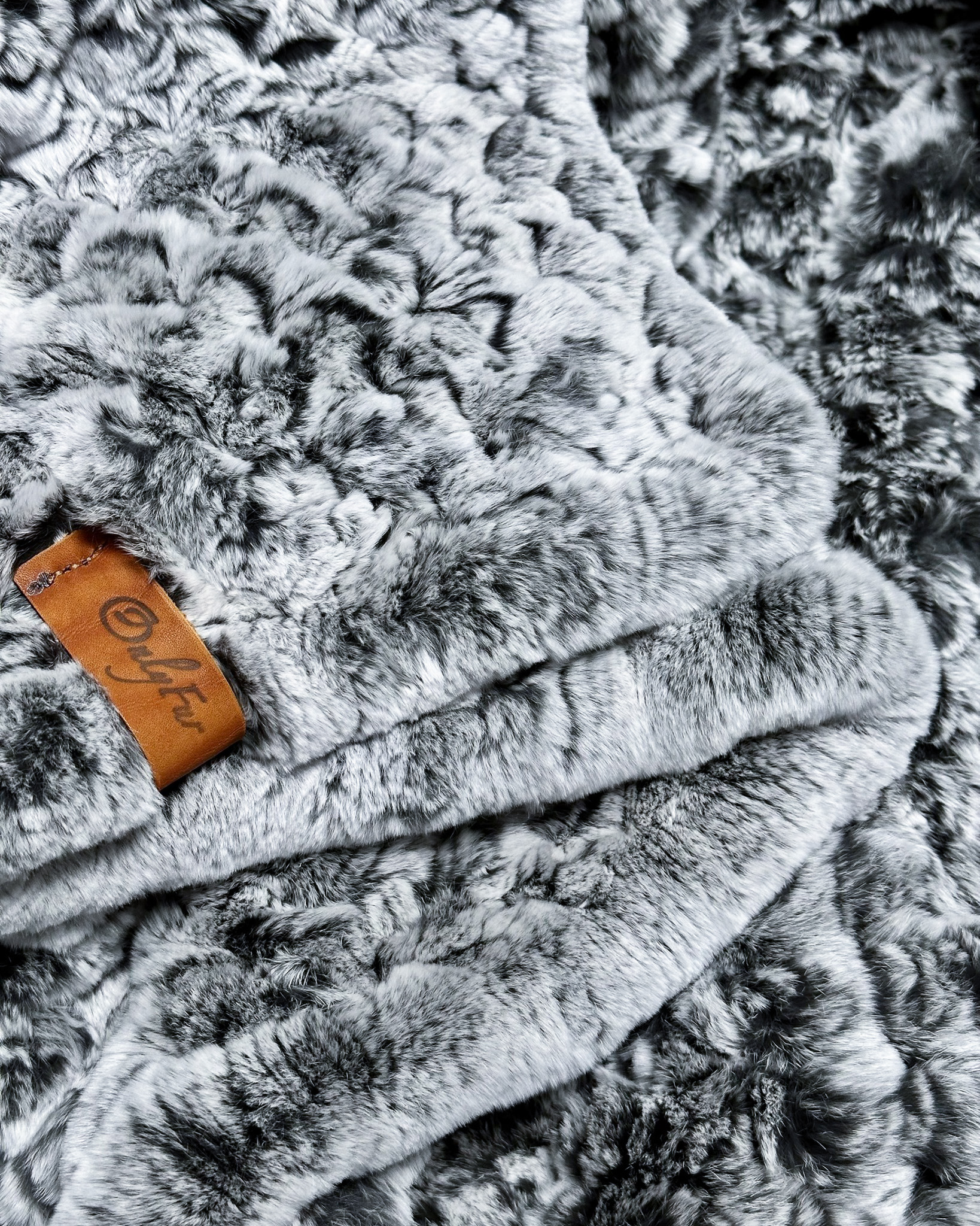 "Вязаный" плед выполнен из тонко нарезанных полосок натурального меха рекс, собранных в длинные ленты. Эти ленты "ввязываются" в специальную сетку для получения соответствующего орнамента.