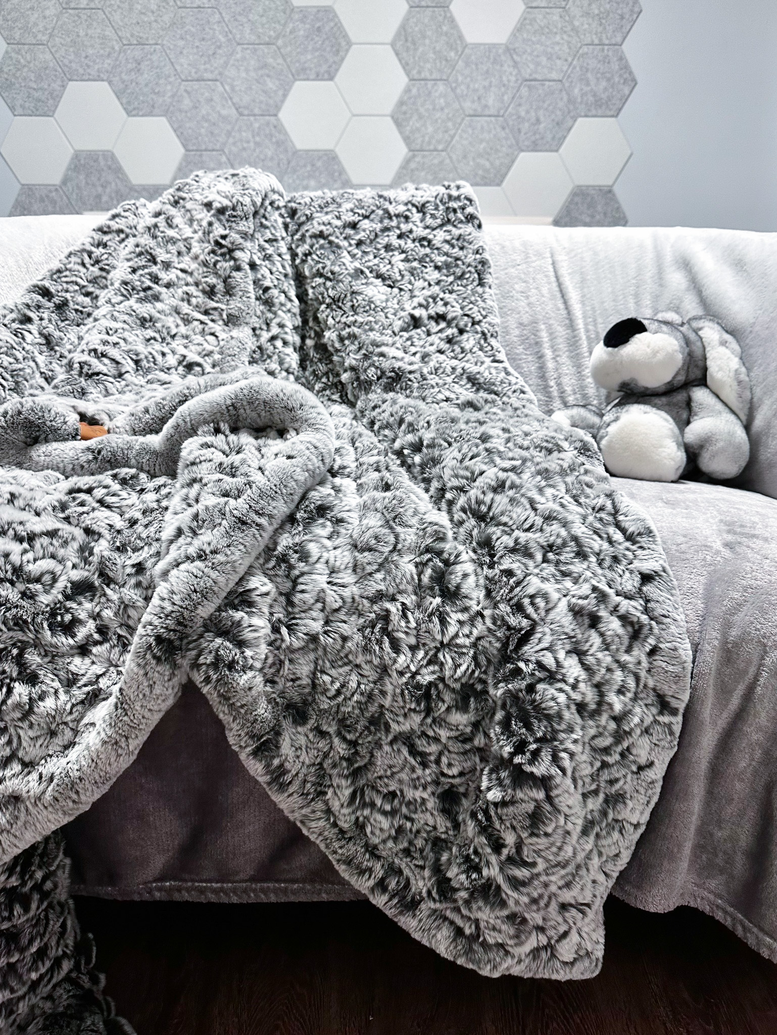 Сетка обеспечивает надёжность крепления меха и сохранение формы. Таким образом получается двухстороннее меховое покрывало. Несомненное преимущество "вязаного" пледа заключается в его пышности и воздушности - плед получается существенно легче по весу в сравнении с пледом из цельных шкур и не требует подклада (что также не утяжеляет плед).