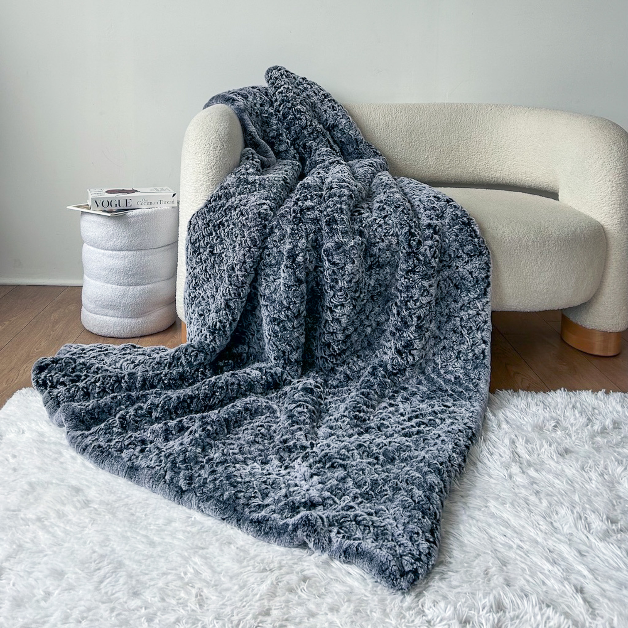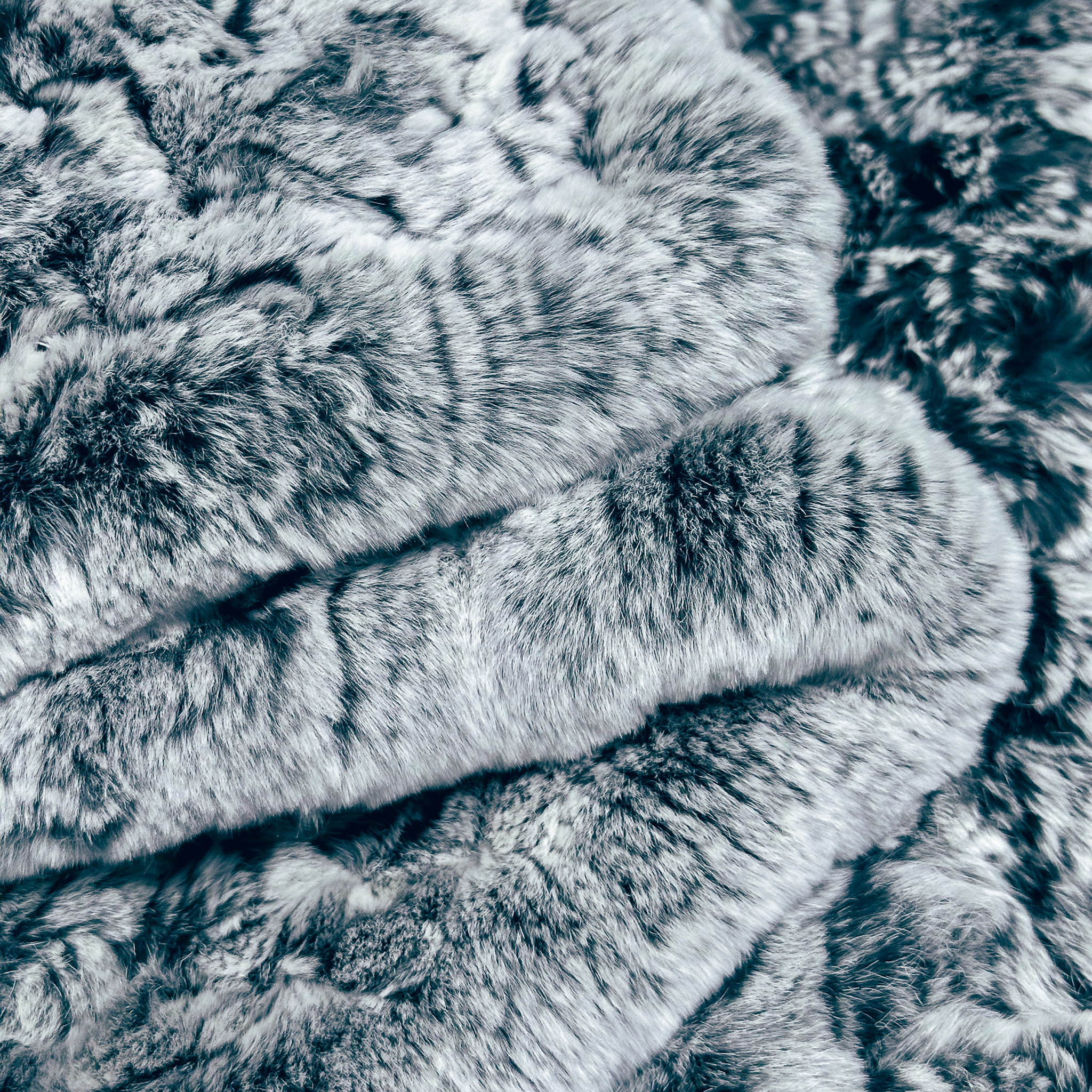 "Вязаный" плед выполнен из тонко нарезанных полосок натурального меха рекс, собранных в длинные ленты. Эти ленты "ввязываются" в специальную сетку для получения соответствующего орнамента.