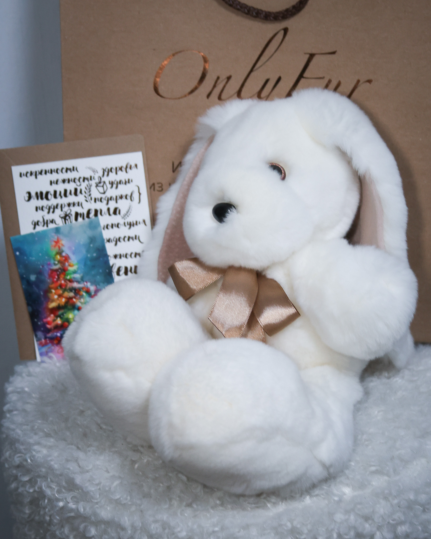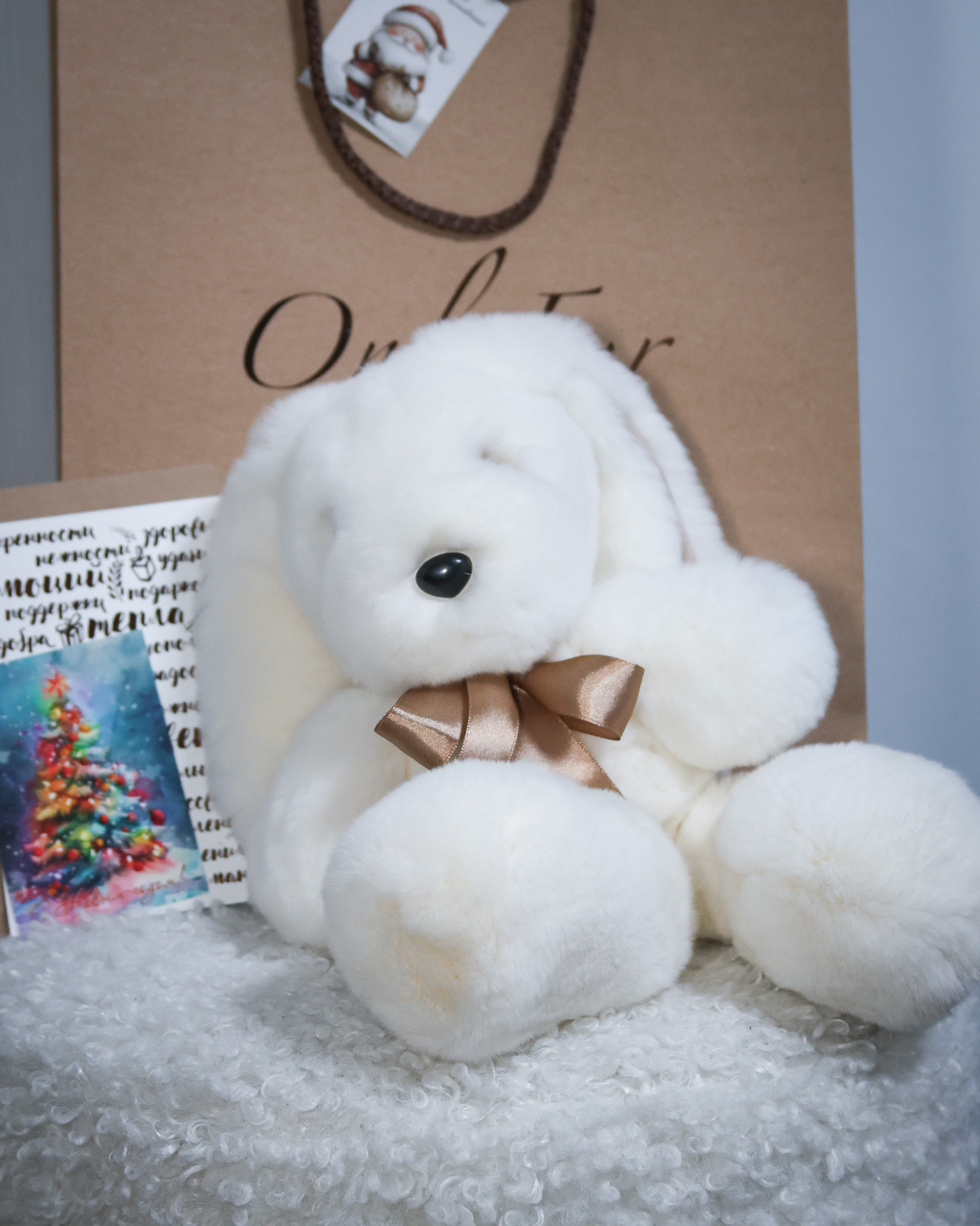 Зайчик Бигфут сделан из натурального меха кролик рекс белого цвета. Ушки игрушки оформлены мягкой нежно-розовой замшей. Крепления лапок жестко не зафиксированные, свободно висят, благодаря чему зайчик особенно мягкий.