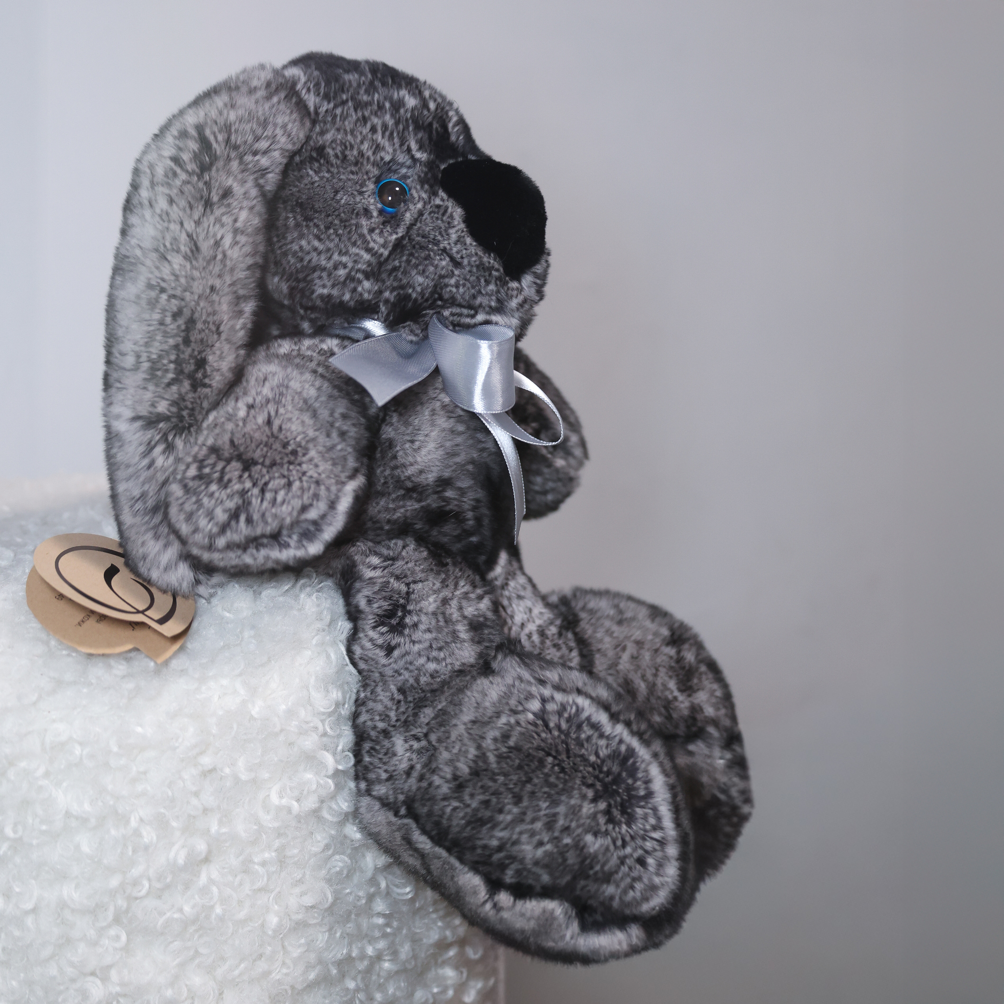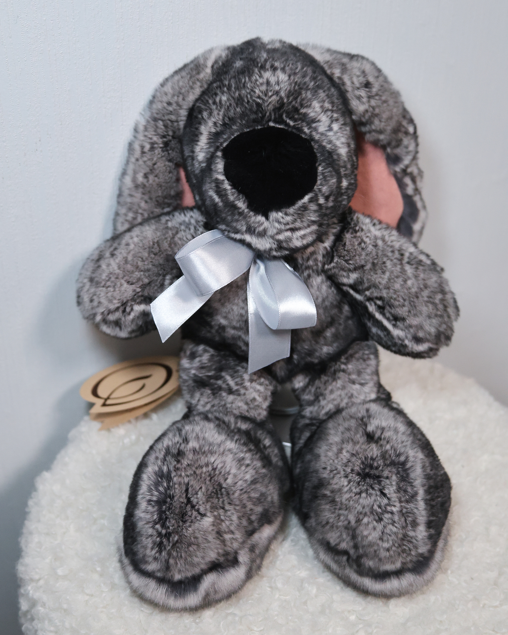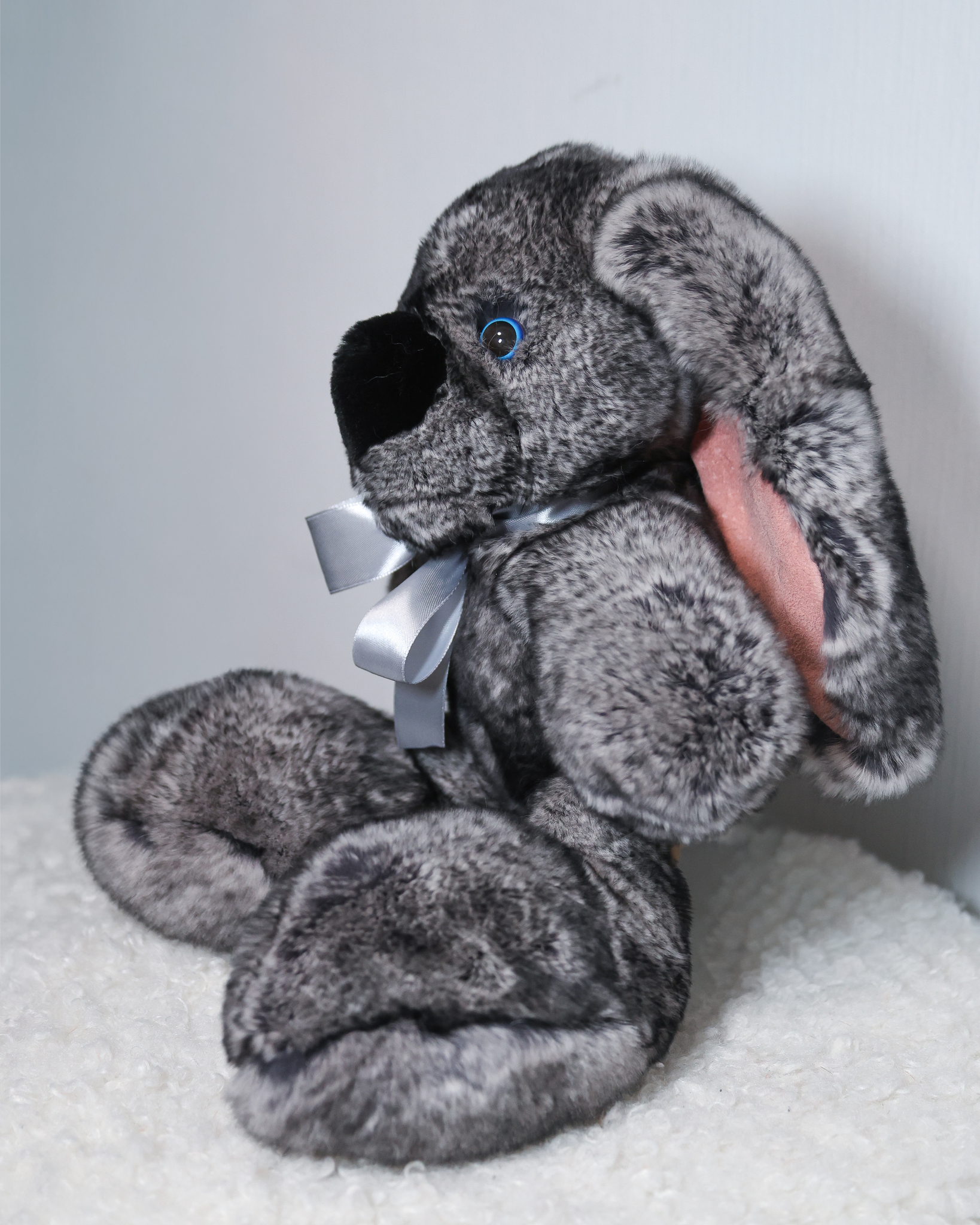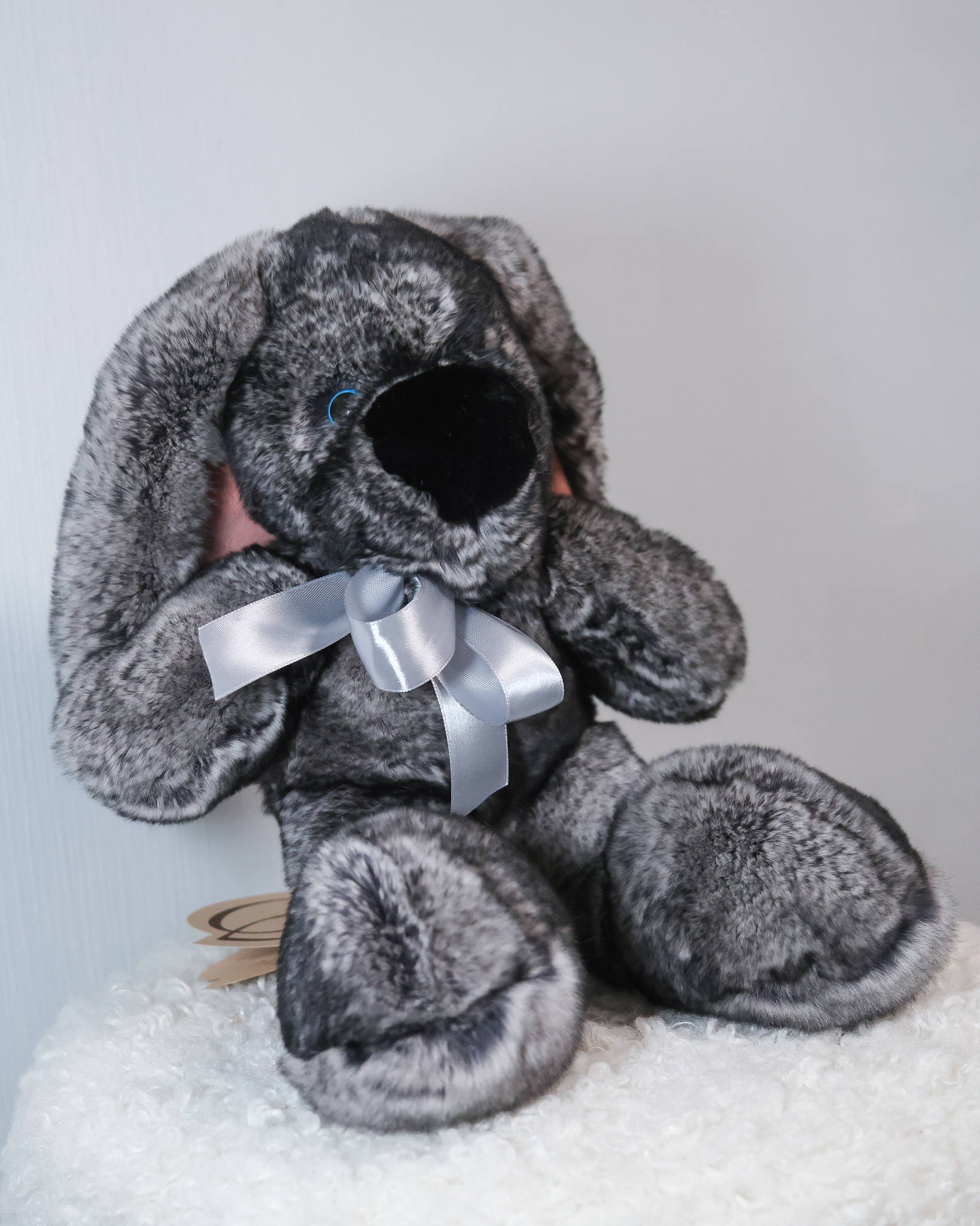 Зайчик Бигфут сделан из натурального меха кролик рекс роскошного серого цвета "шиншилла" (сложный трехслойный окрас меха). Ушки игрушки оформлены мягкой замшей. Крепления лапок жестко не зафиксированные, свободно висят, благодаря чему зайчик особенно мягкий.