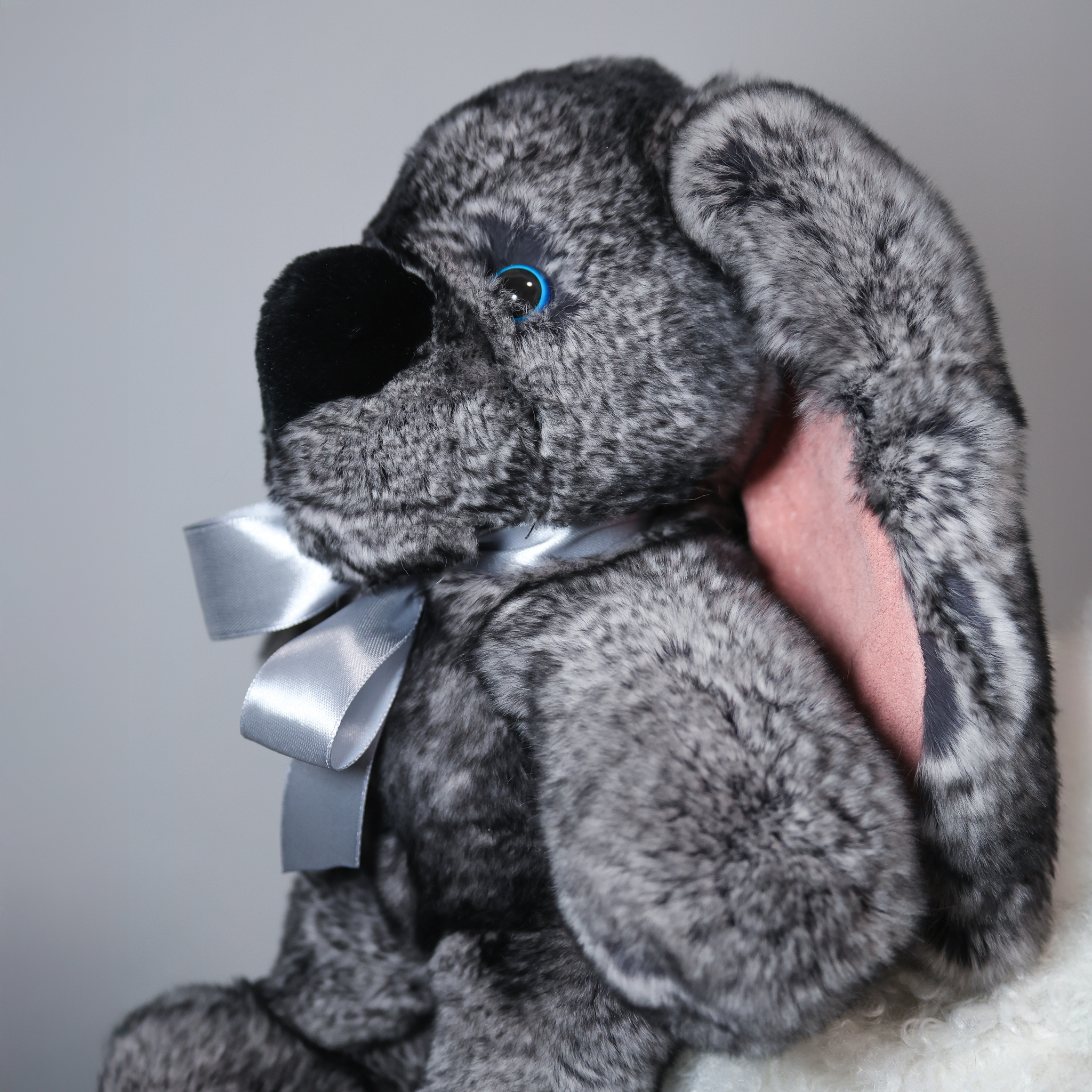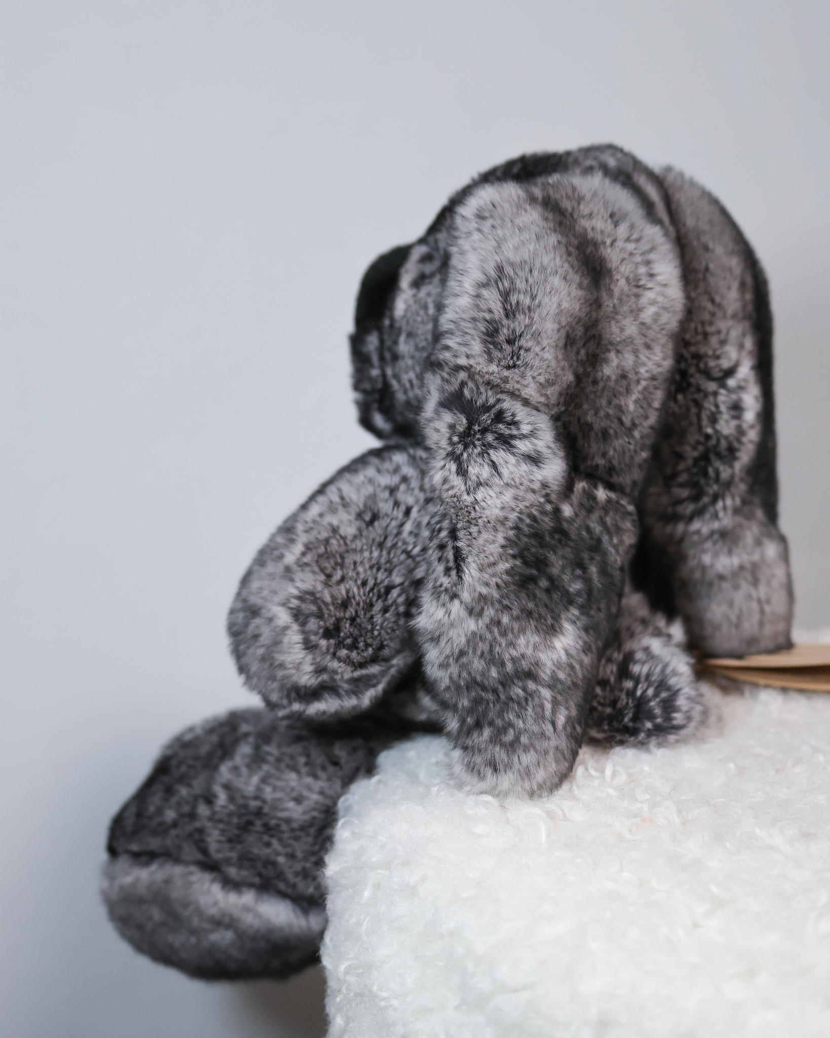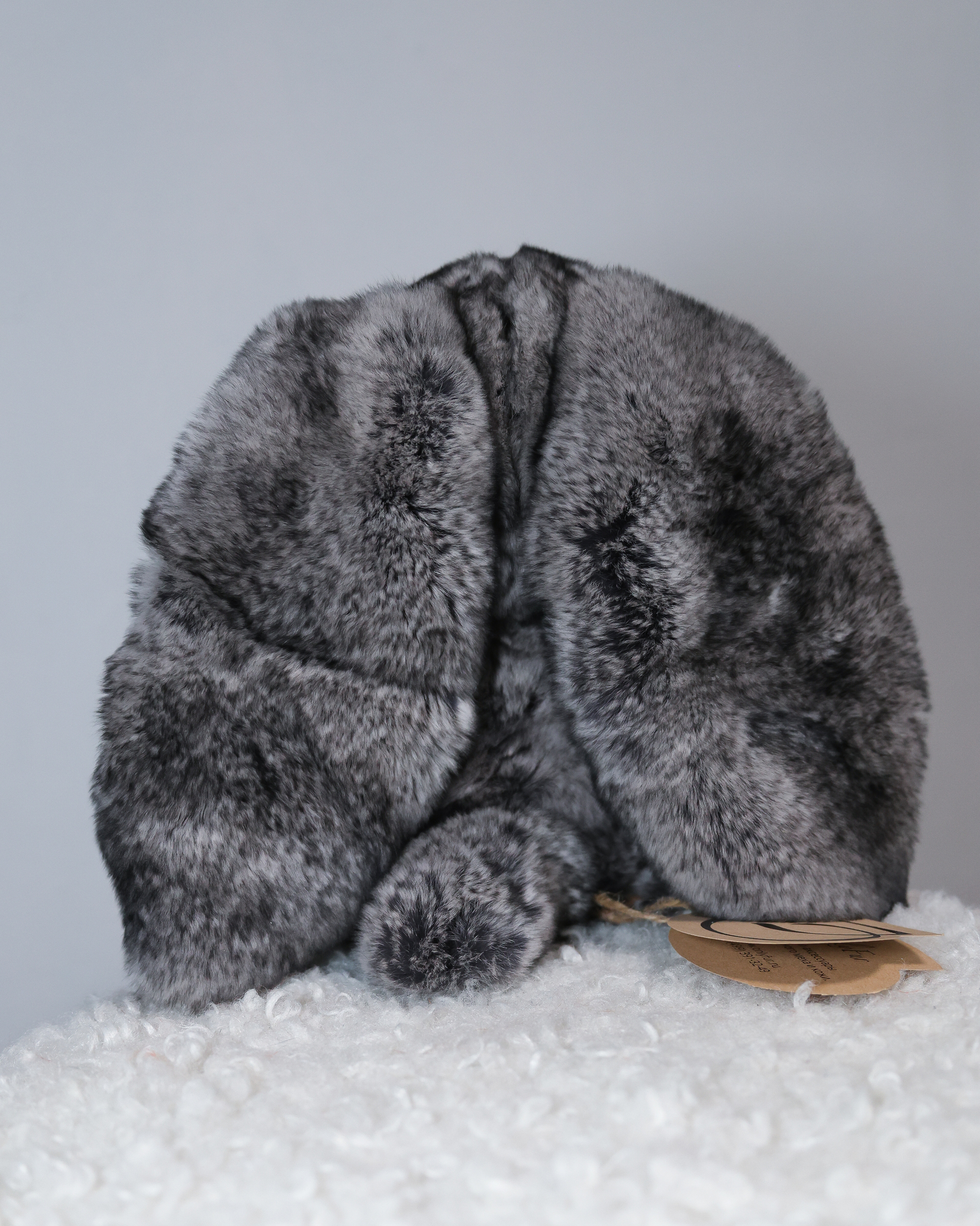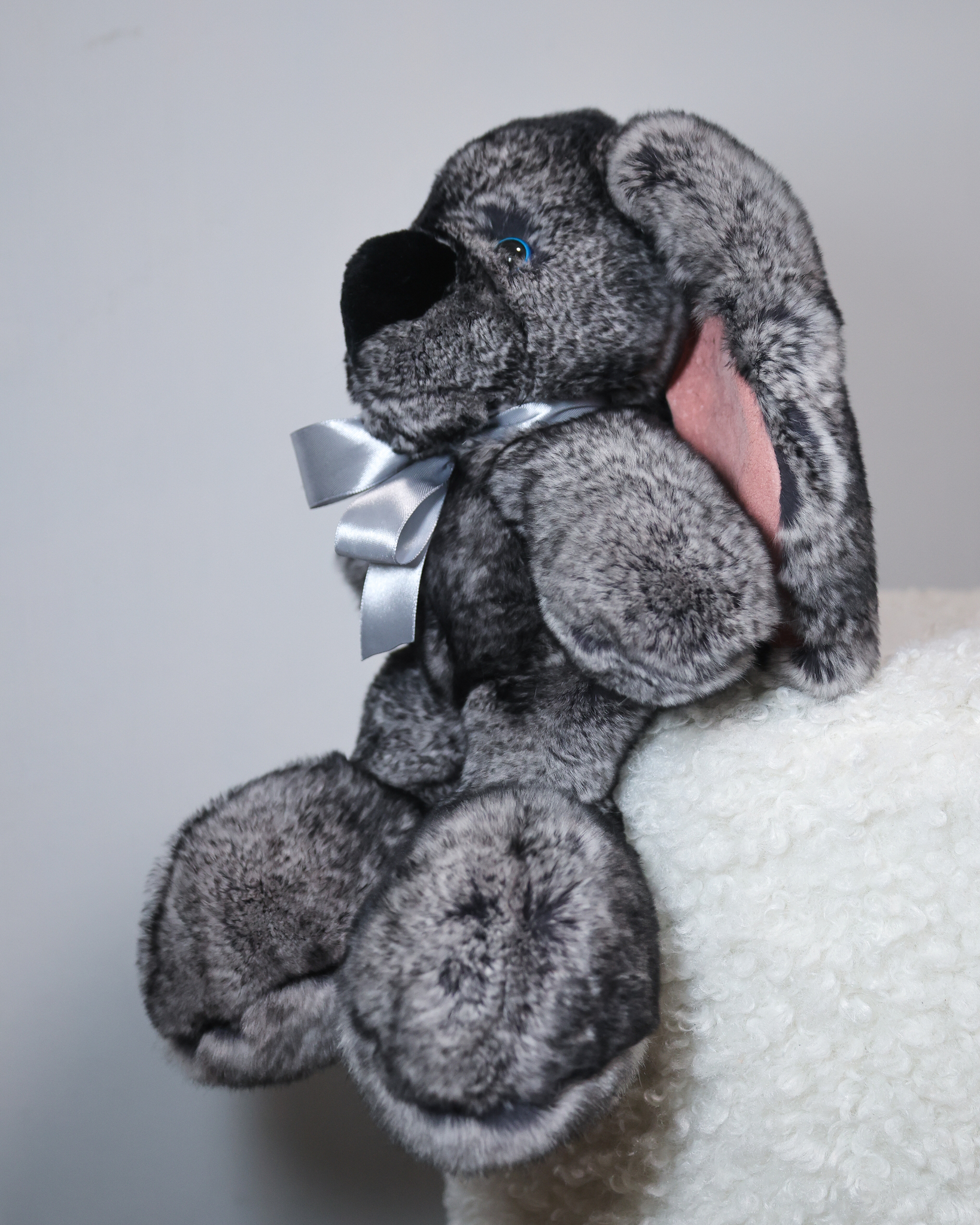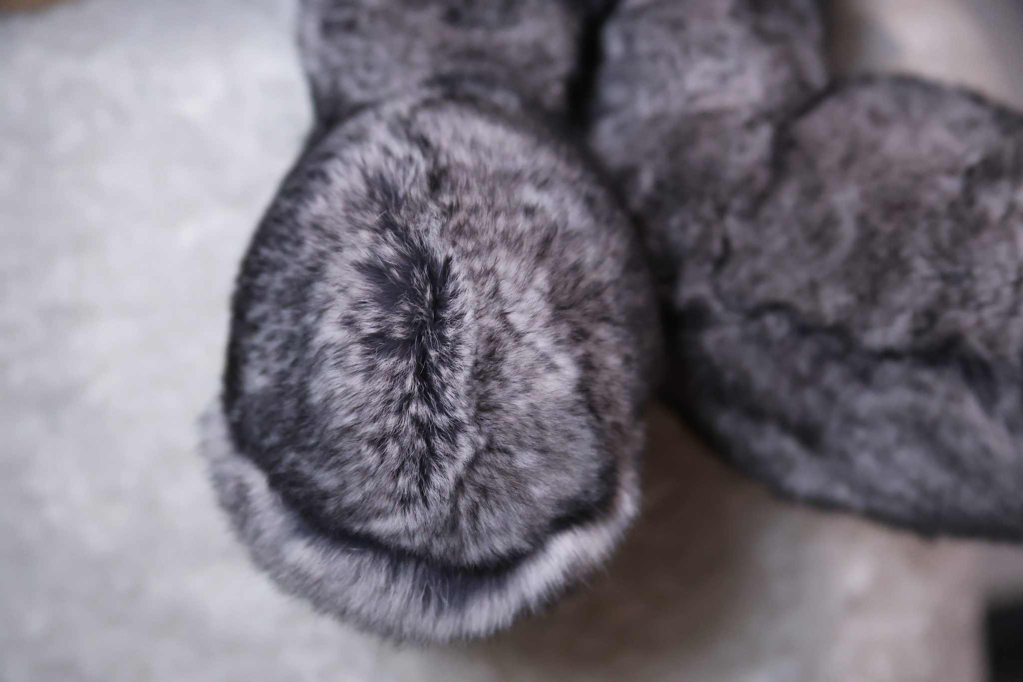 Зайчик Бигфут сделан из натурального меха кролик рекс роскошного серого цвета "шиншилла" (сложный трехслойный окрас меха). Ушки игрушки оформлены мягкой замшей. Крепления лапок жестко не зафиксированные, свободно висят, благодаря чему зайчик особенно мягкий.