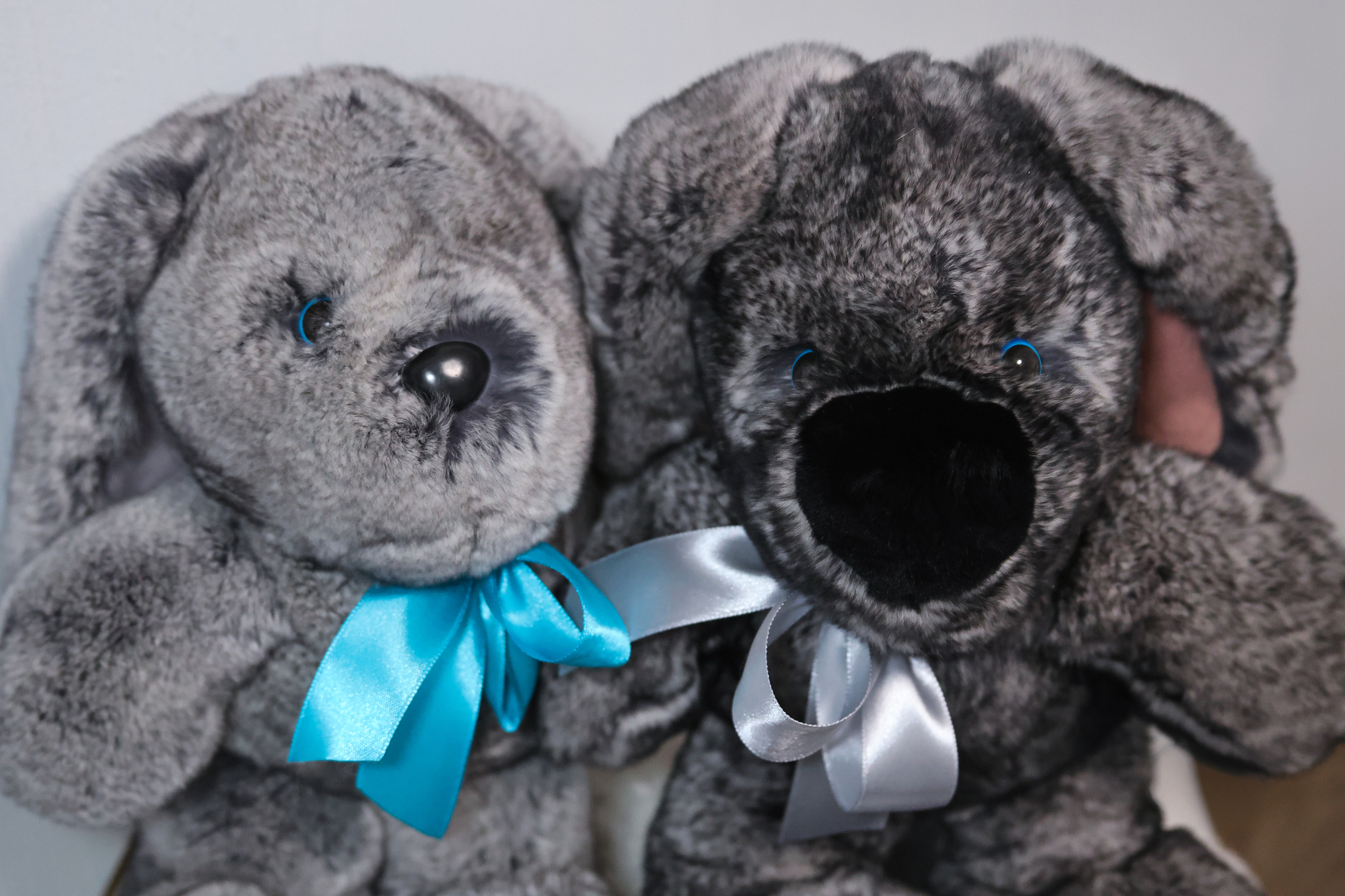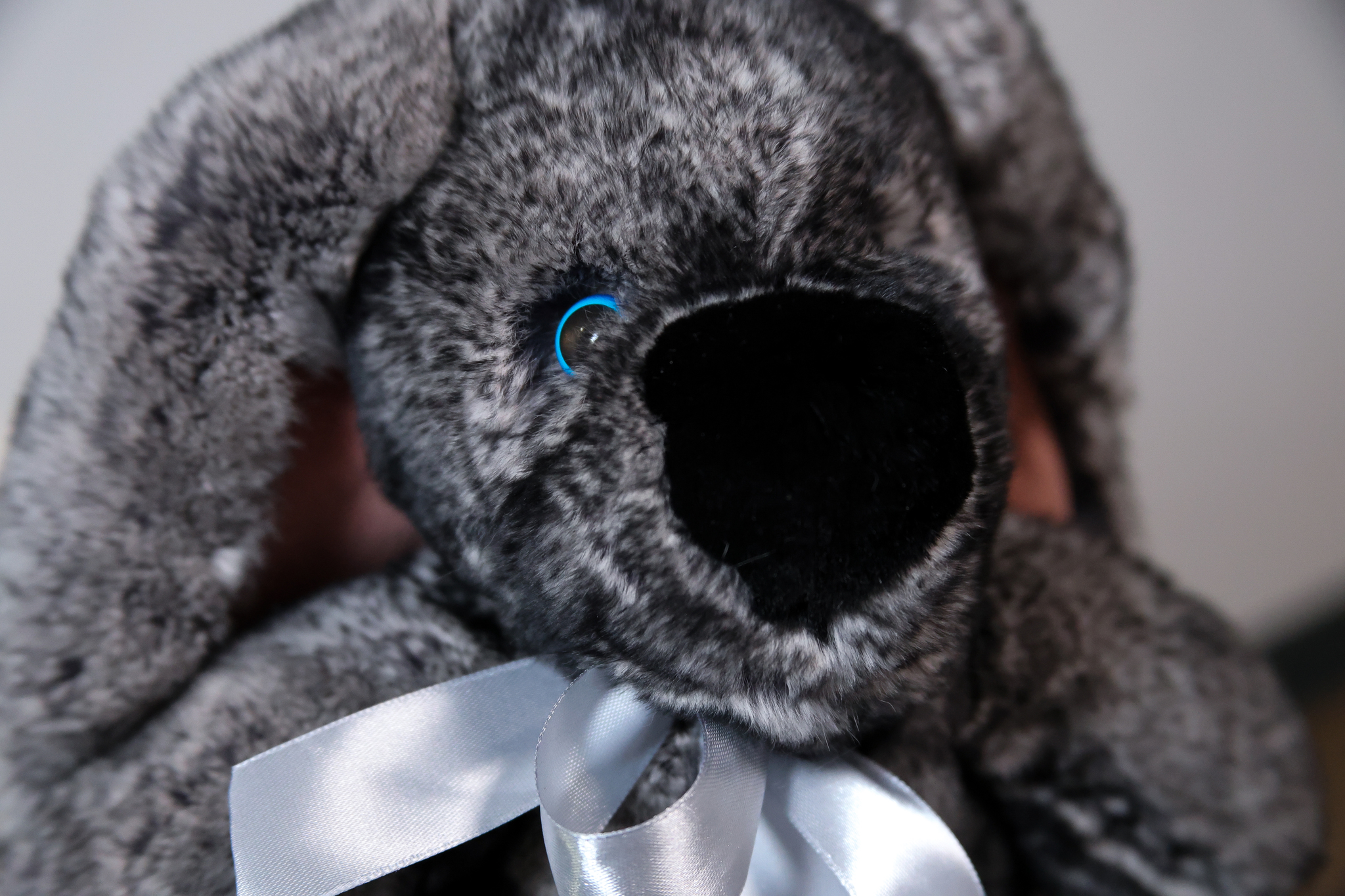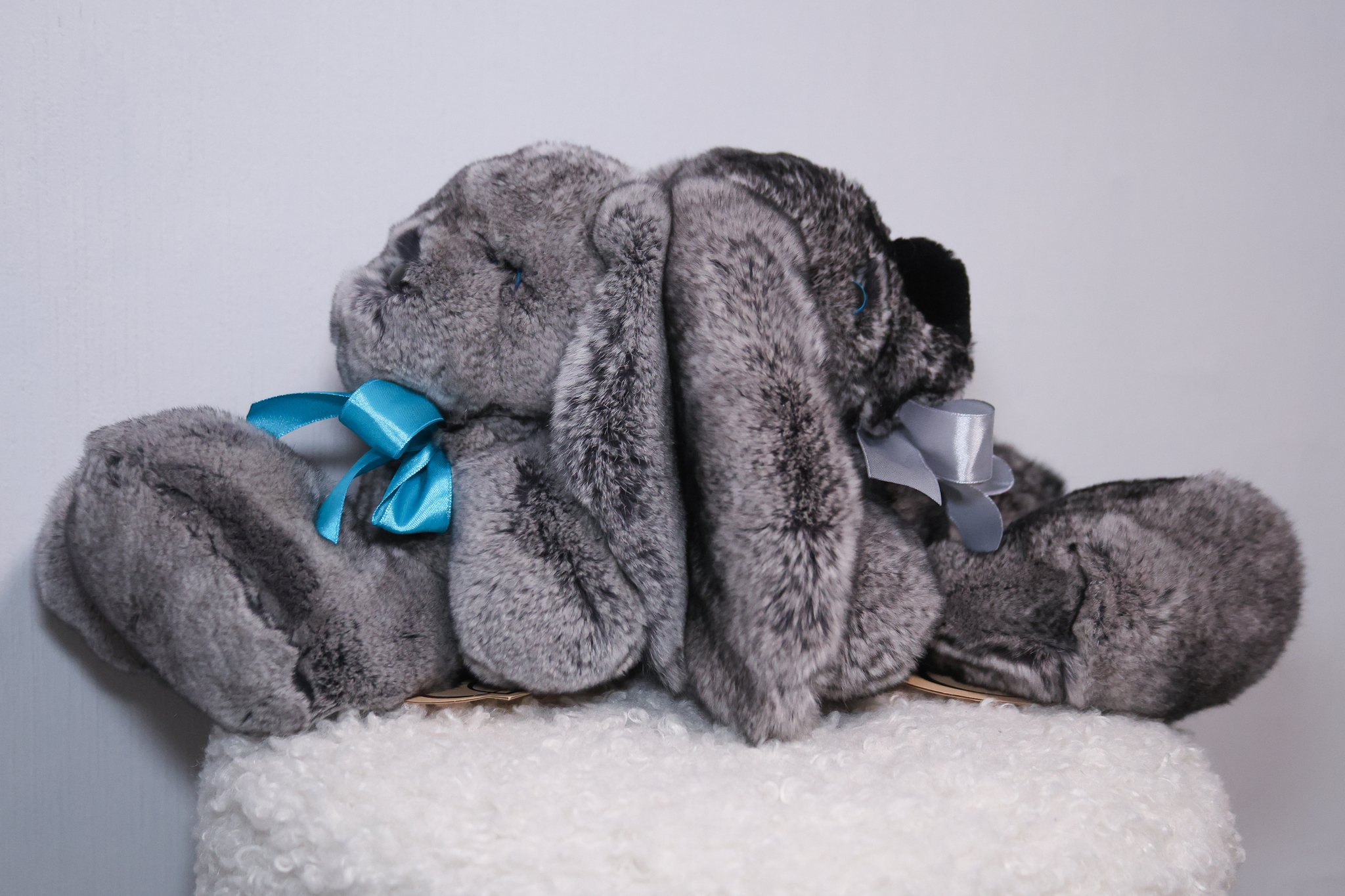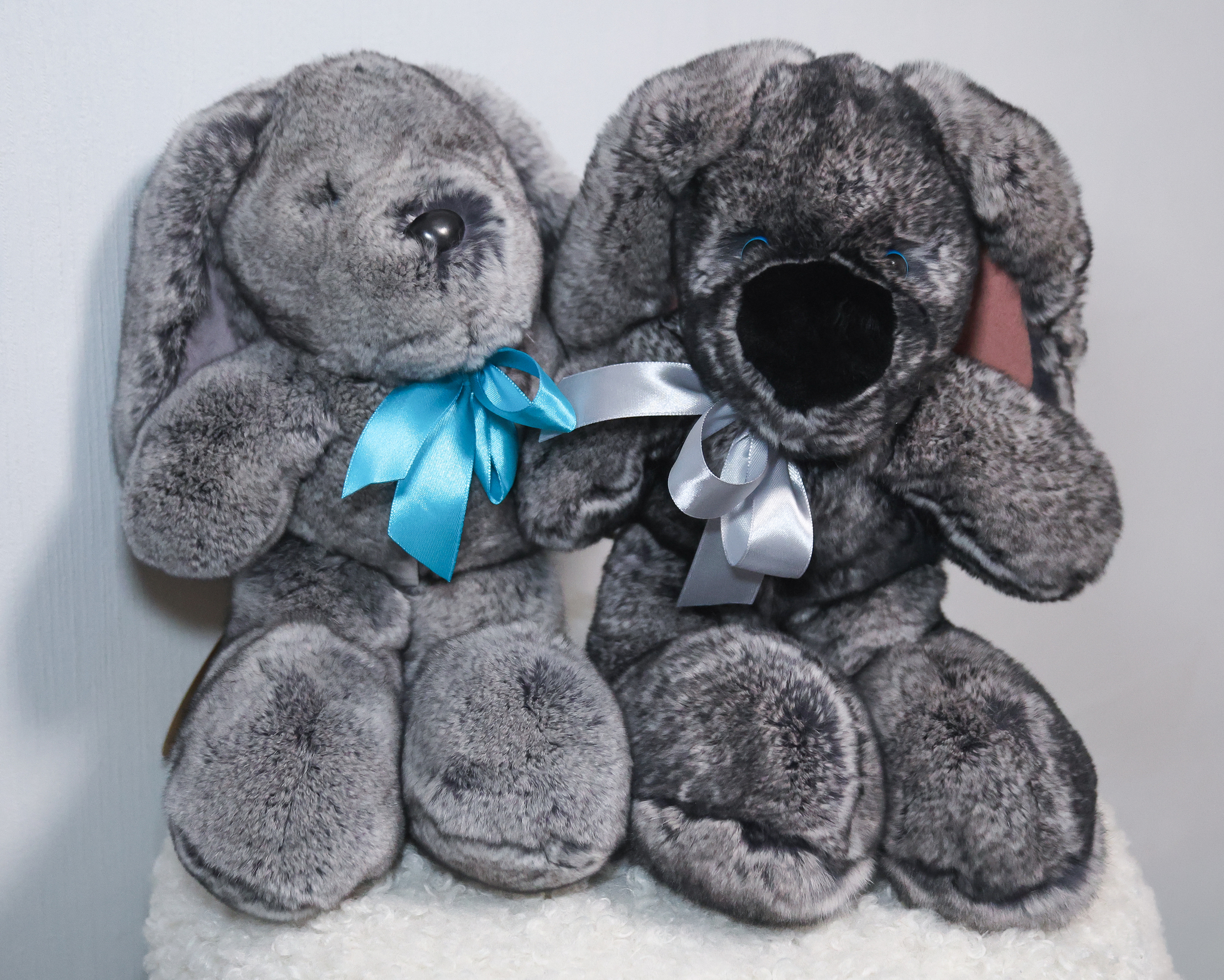Зайчик Бигфут сделан из натурального меха кролик рекс роскошного серого цвета "шиншилла" (сложный трехслойный окрас меха). Ушки игрушки оформлены мягкой замшей. Крепления лапок жестко не зафиксированные, свободно висят, благодаря чему зайчик особенно мягкий.