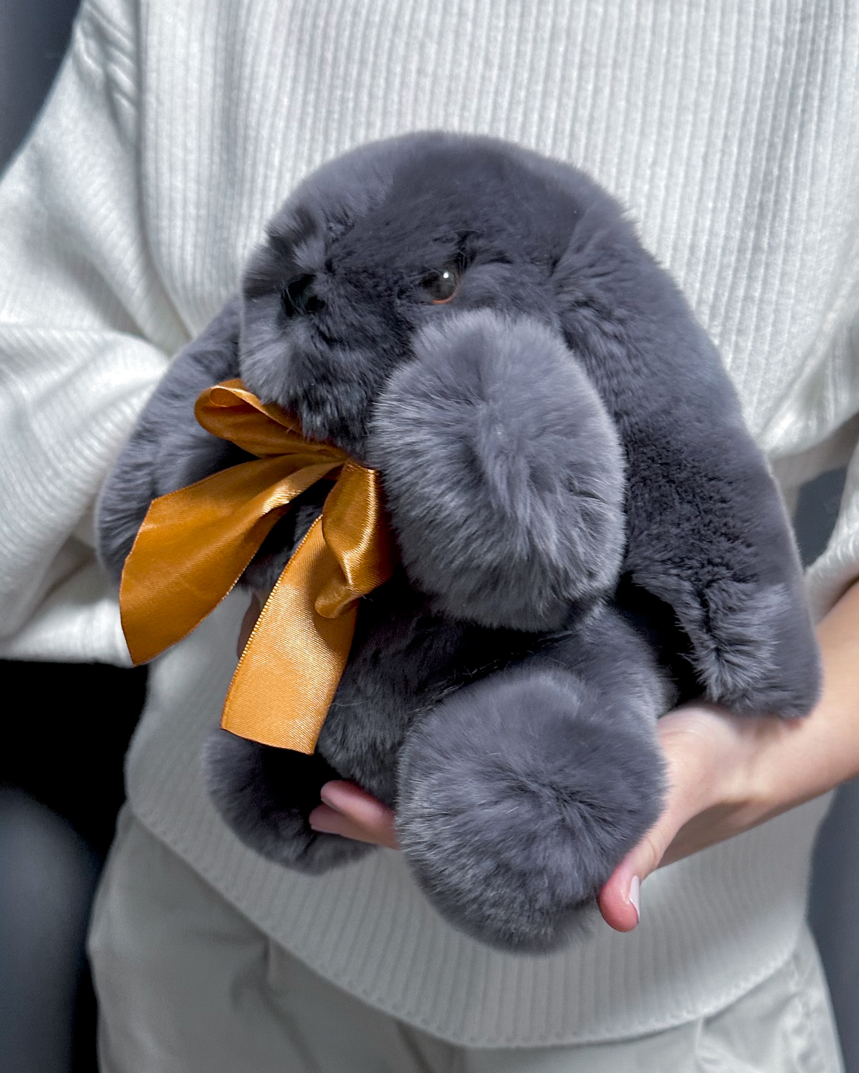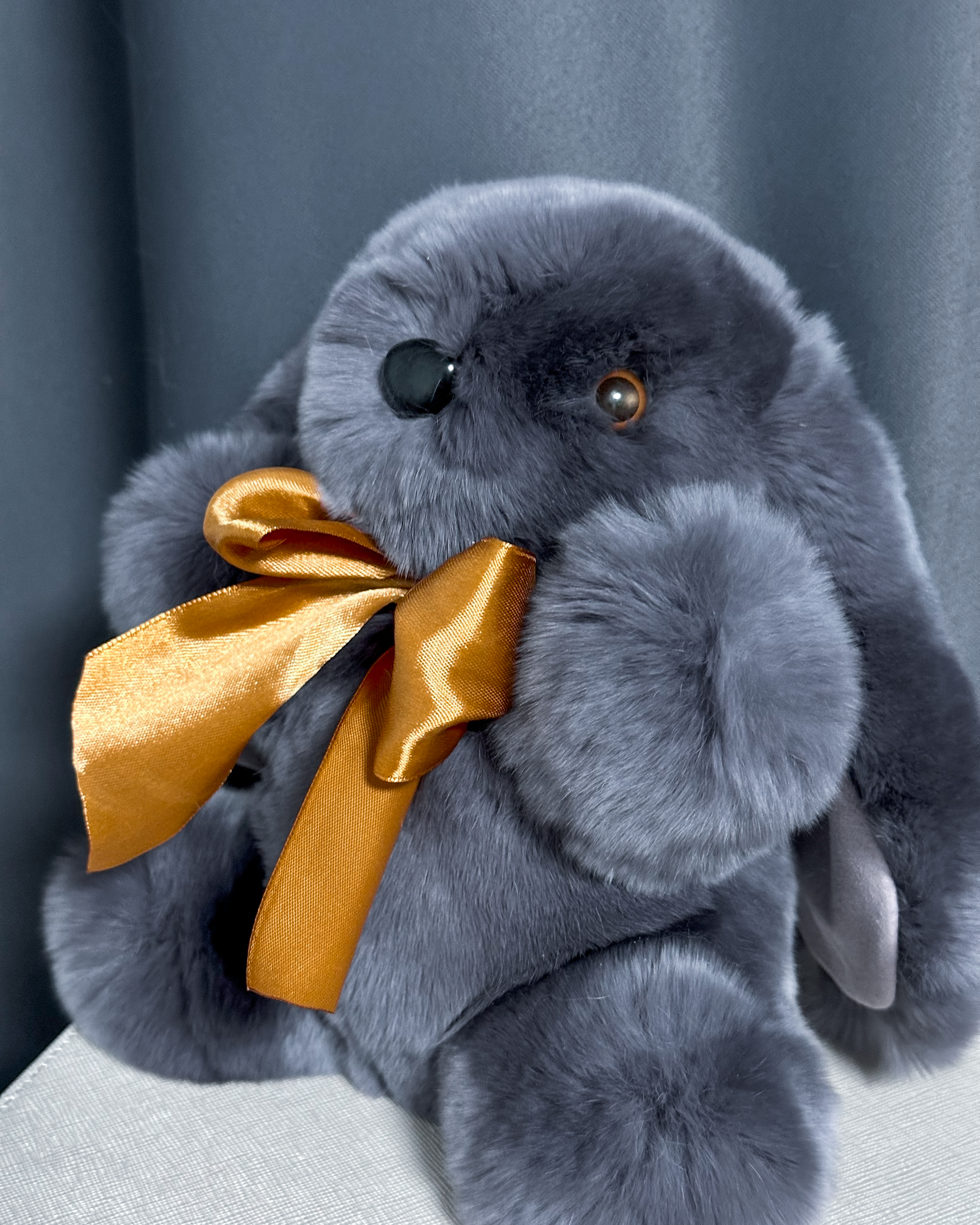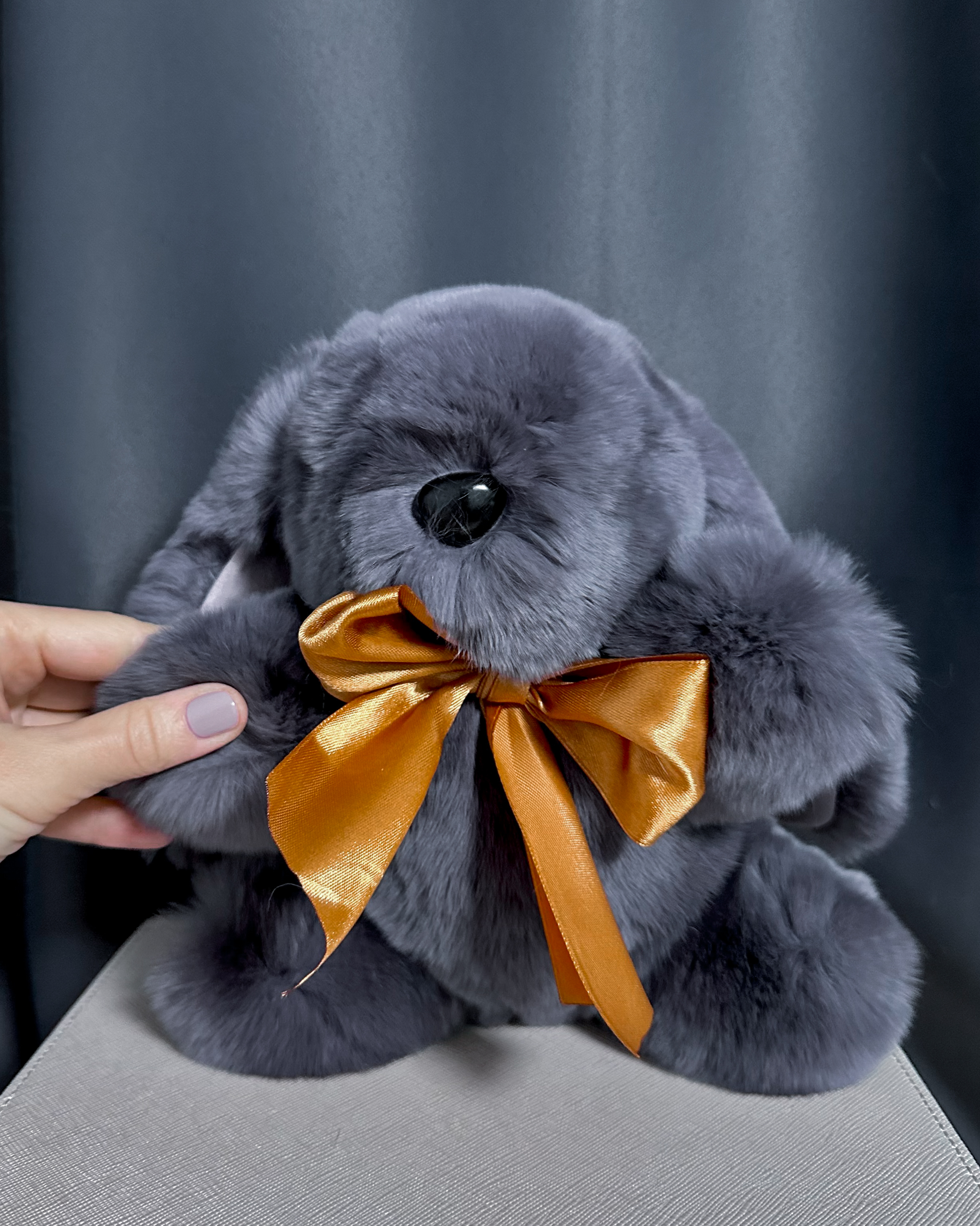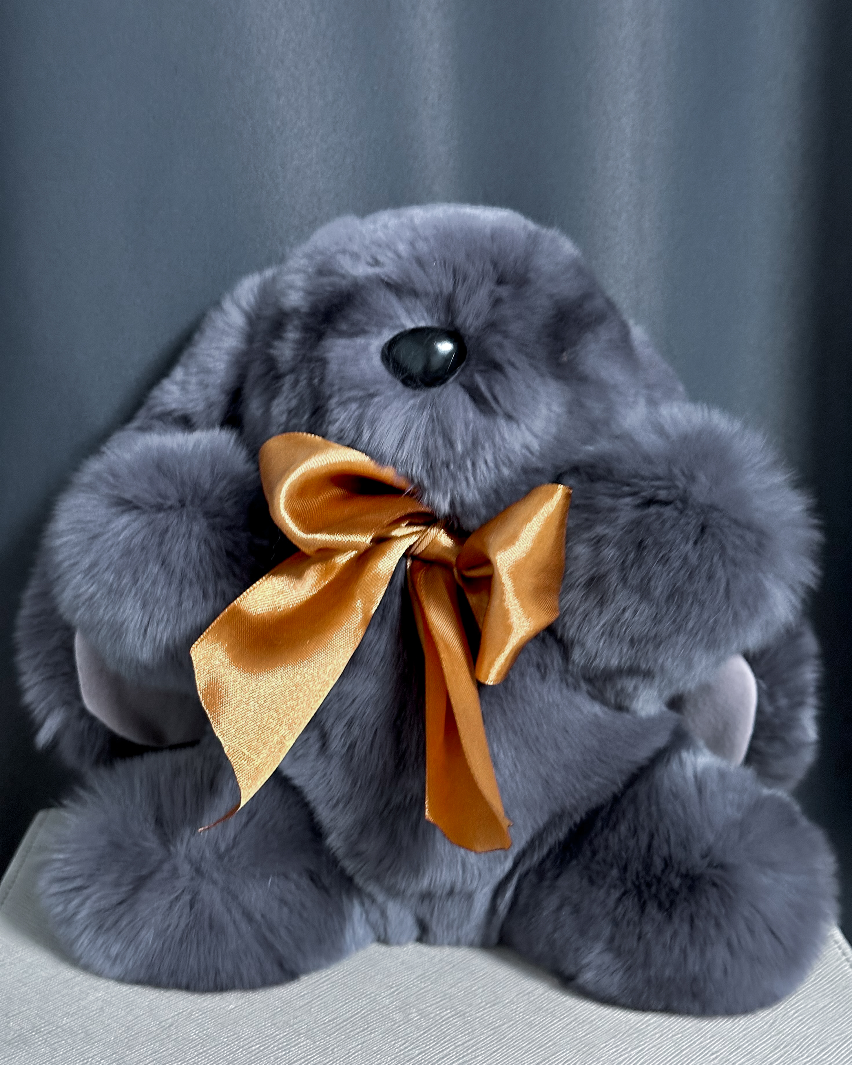 Зайчонок Арнольд сделан из натурального меха кролик рекс однородного серого цвета "темный графит". Ушки оформлены с использованием замшевых вставок. Зайчонок украшен декоративным атласным бантом, который при желании можно снять.