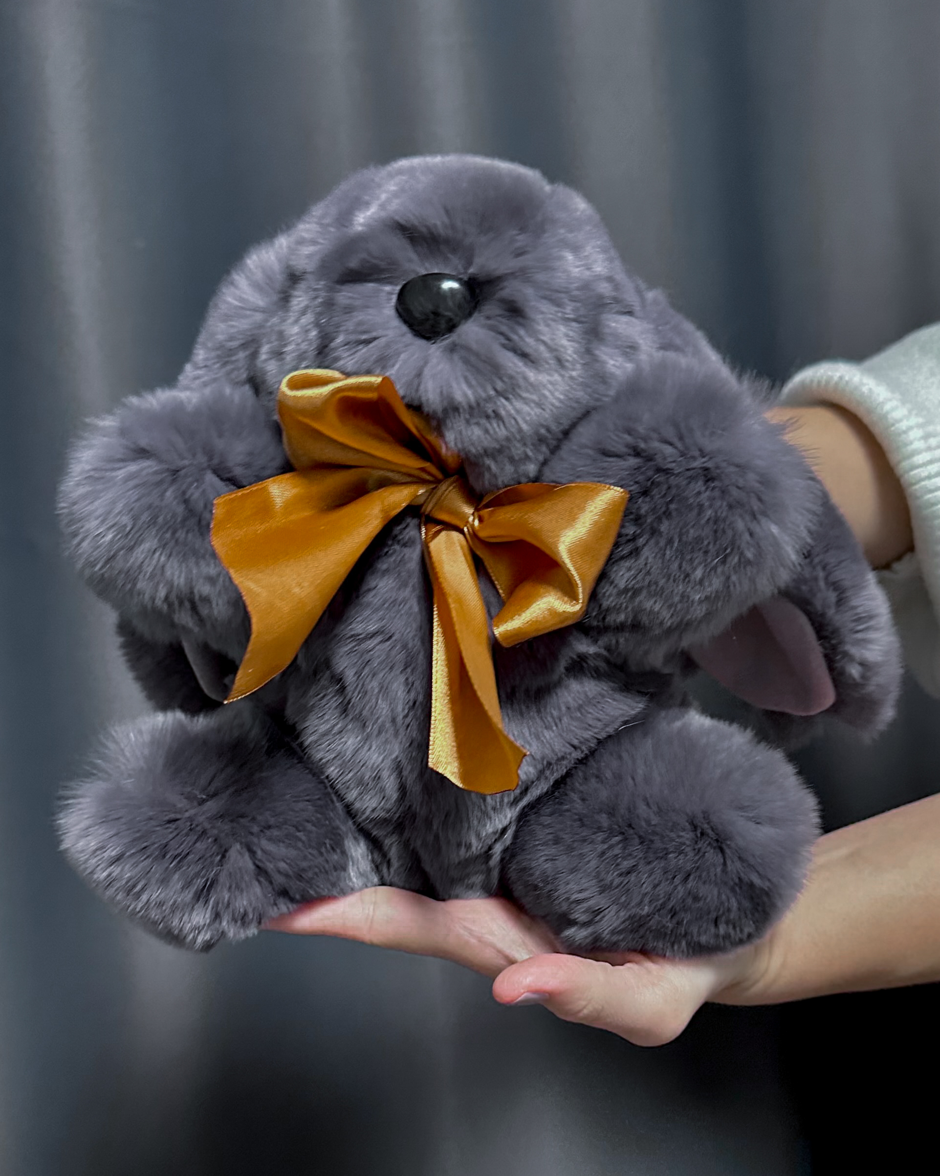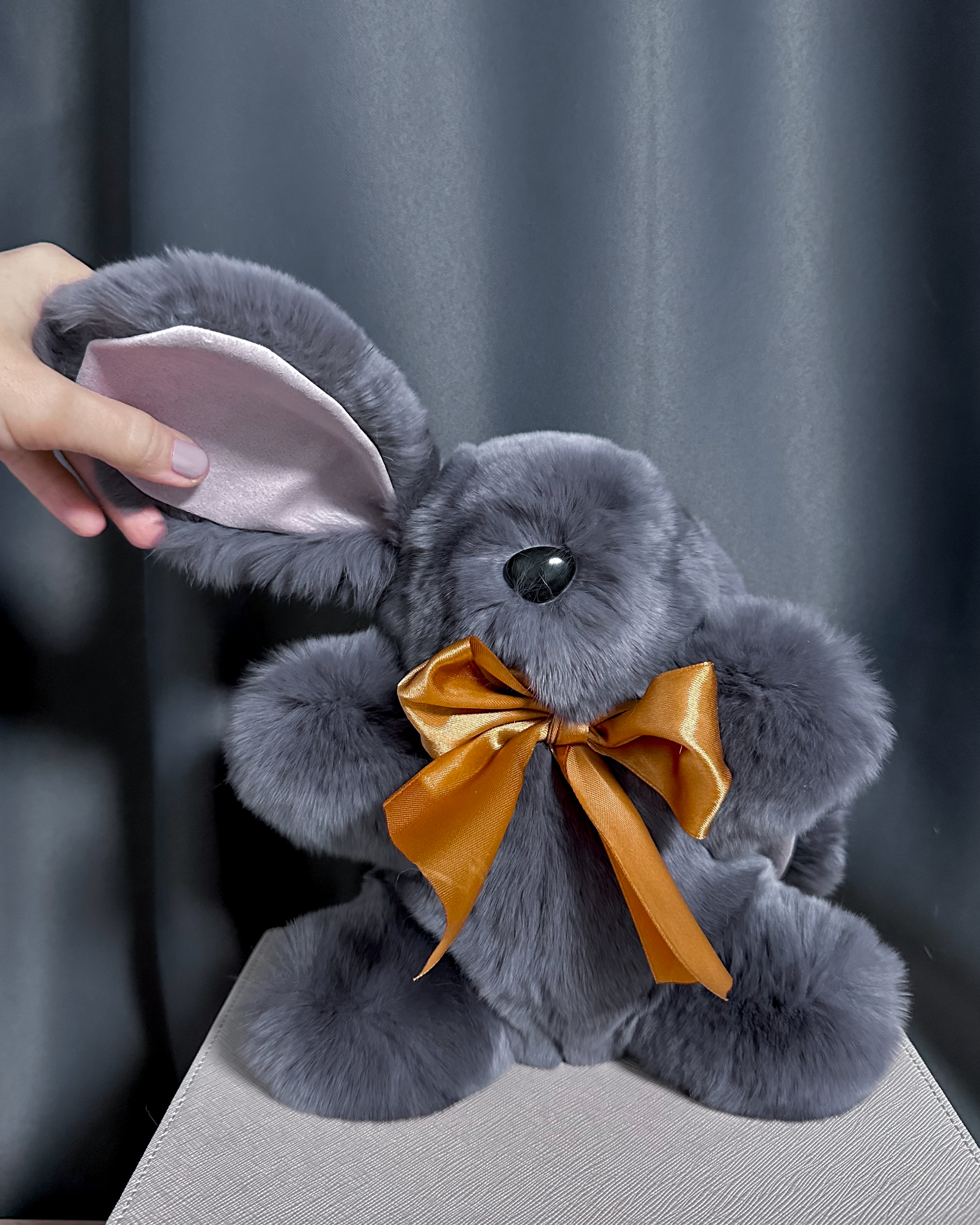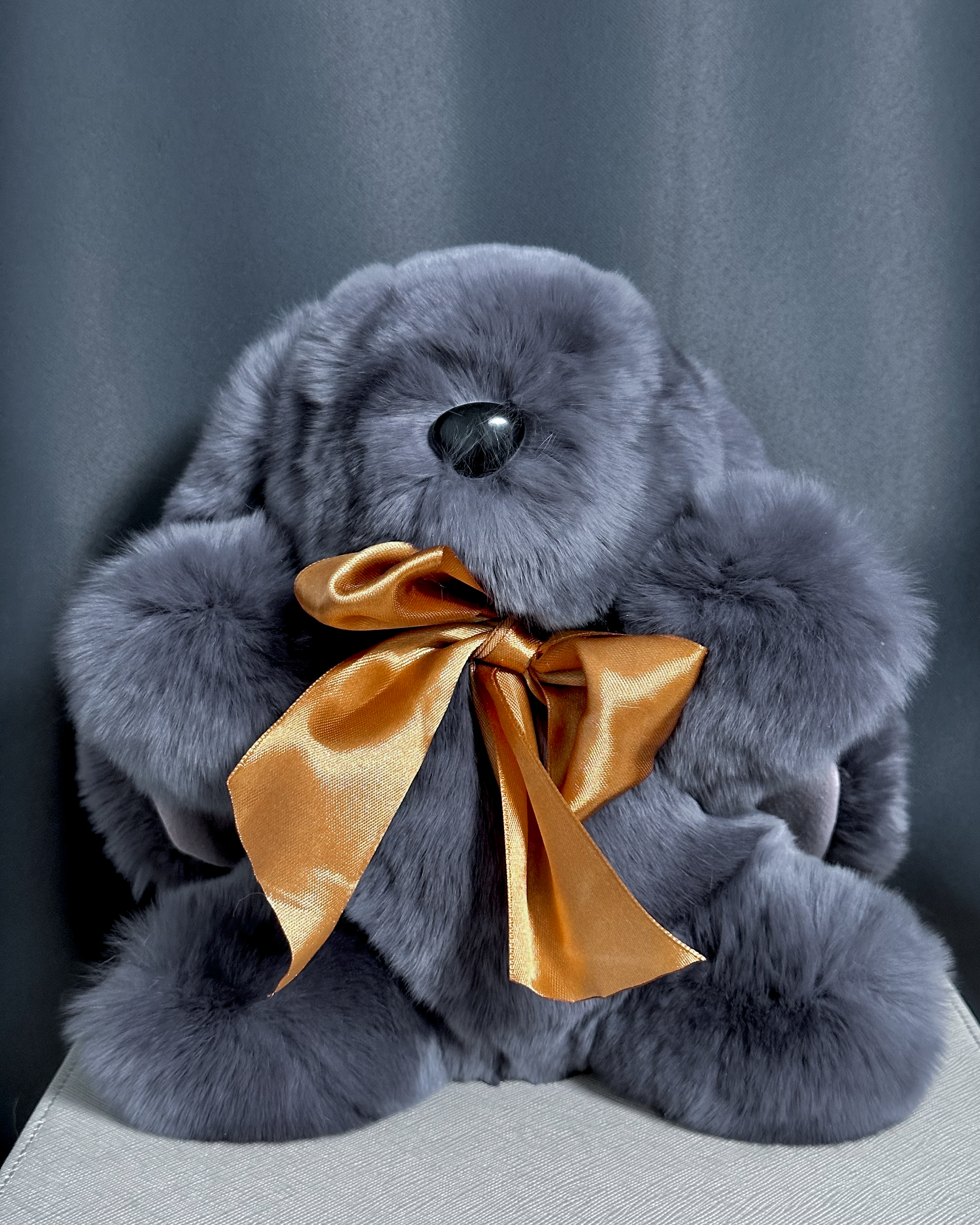 Зайчонок Арнольд сделан из натурального меха кролик рекс однородного серого цвета "темный графит". Ушки оформлены с использованием замшевых вставок. Зайчонок украшен декоративным атласным бантом, который при желании можно снять.