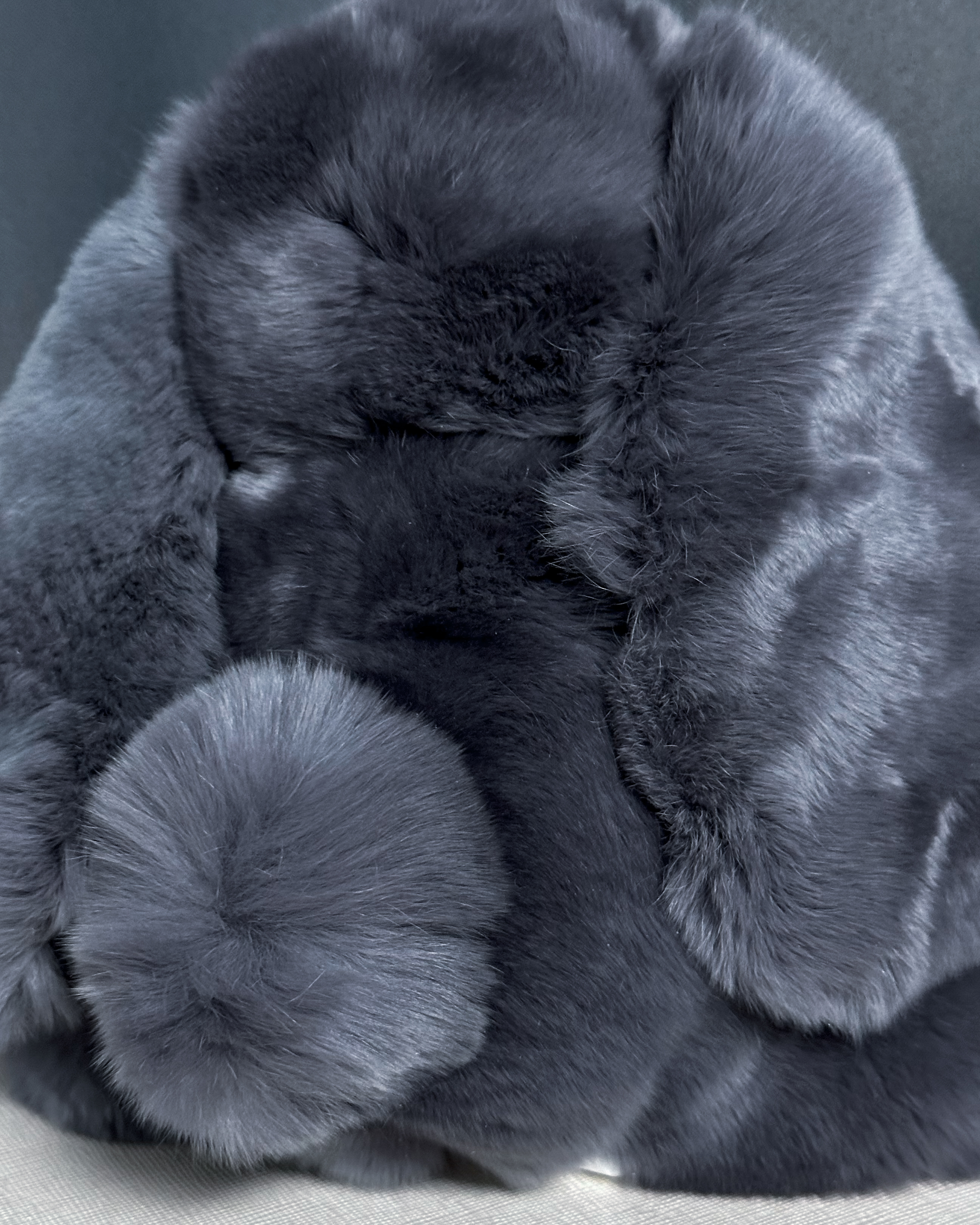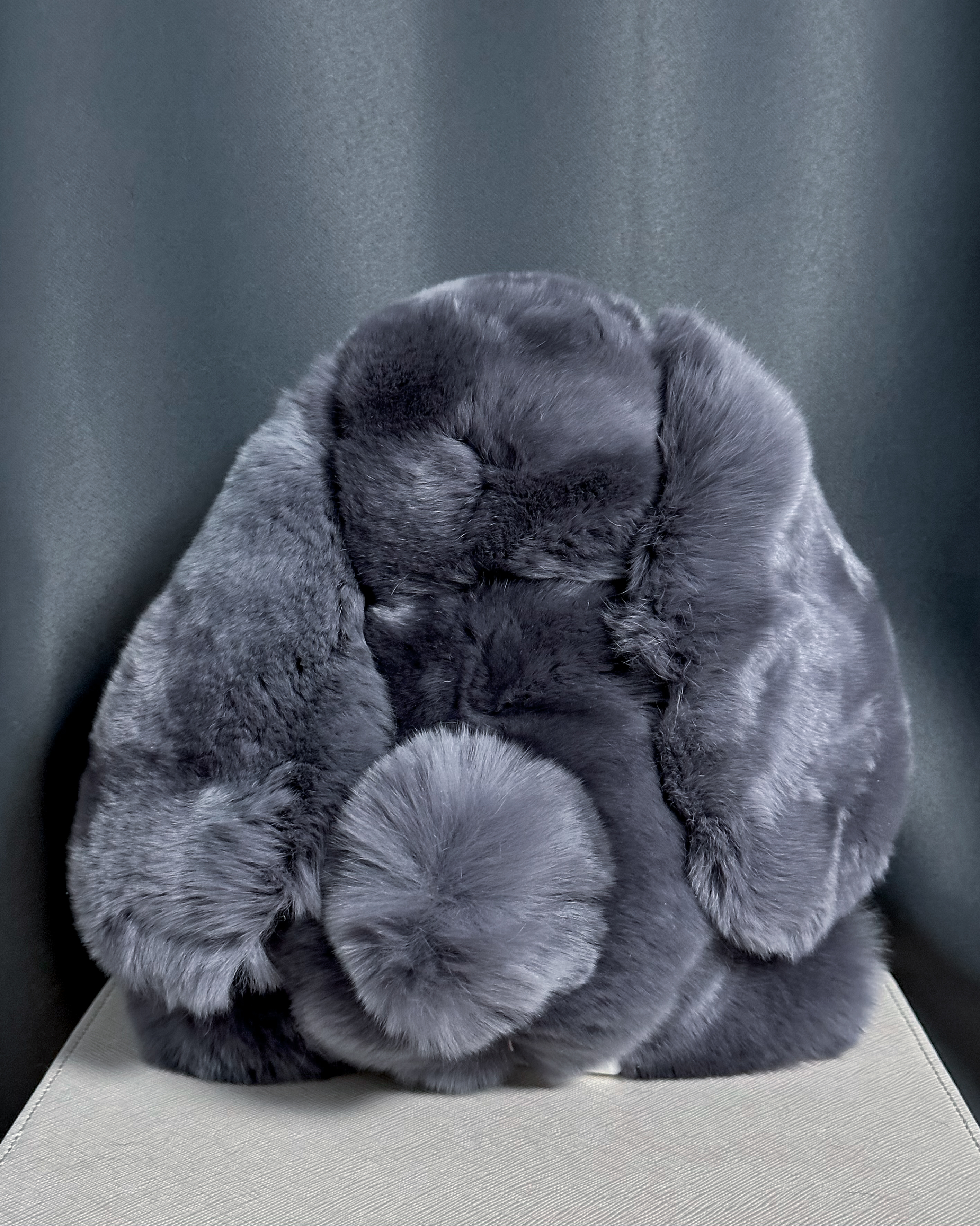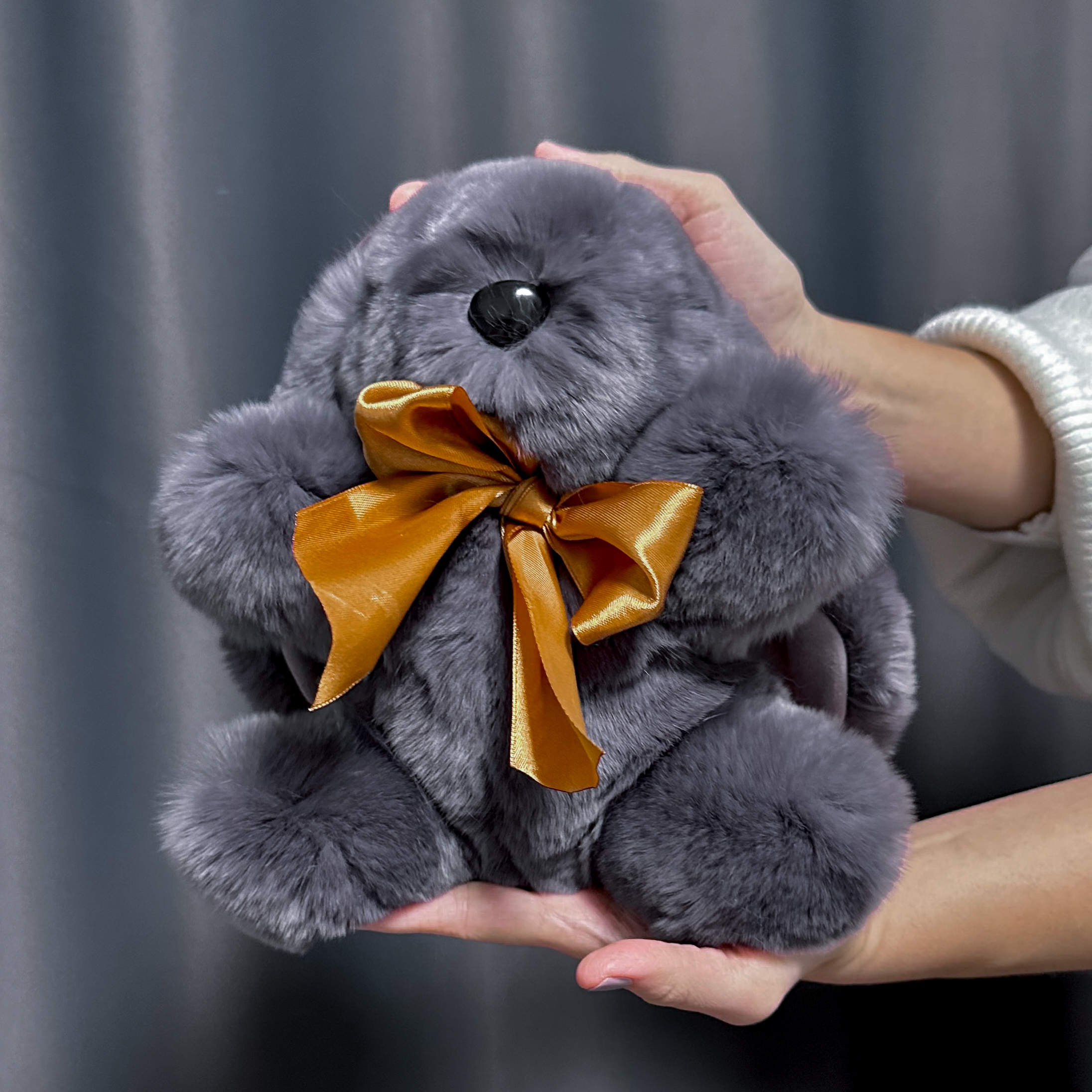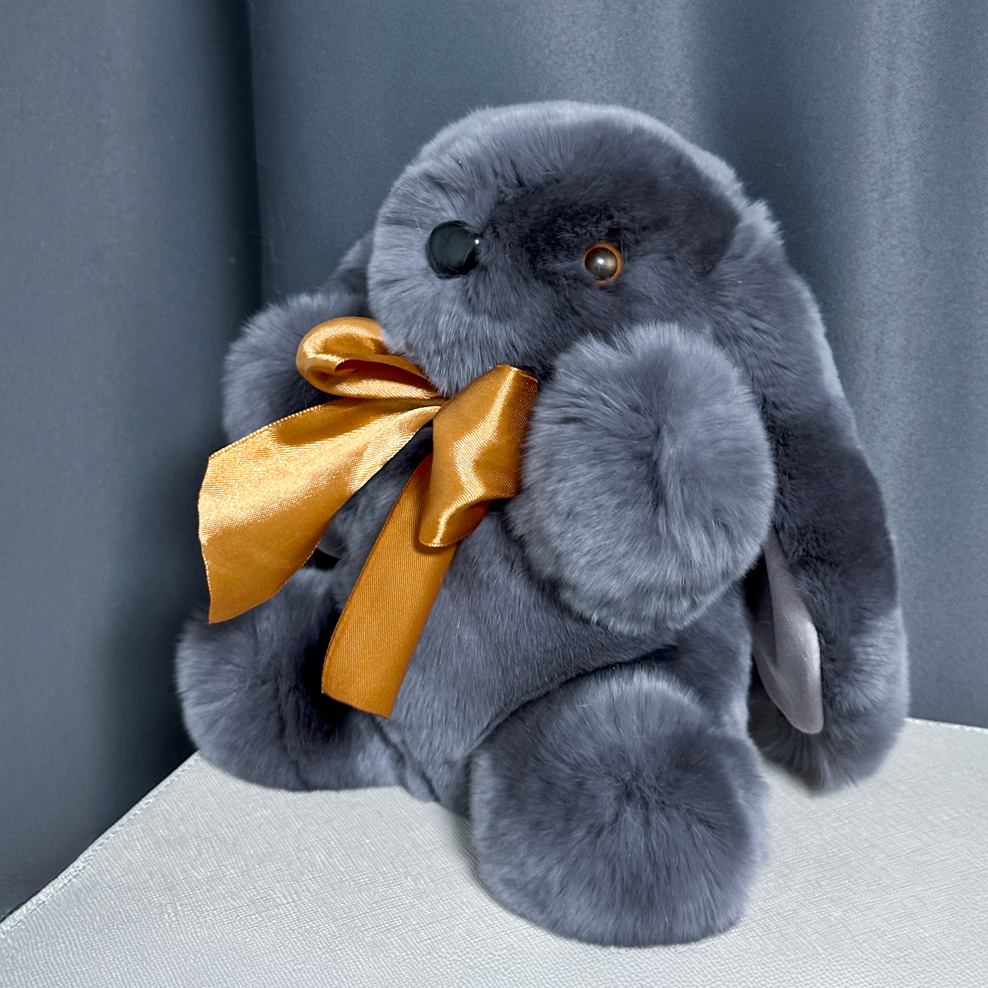 Зайчонок Арнольд сделан из натурального меха кролик рекс однородного серого цвета "темный графит". Ушки оформлены с использованием замшевых вставок. Зайчонок украшен декоративным атласным бантом, который при желании можно снять.