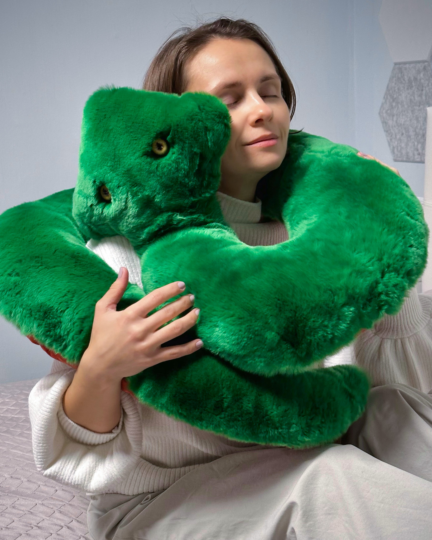 Красавица Королевская Змея сделана из натурального меха кролика породы рекс сочного зеленого цвета, дополнена брюшком из мягкой оранжевой замши и ярко-красным замшевым язычком.
